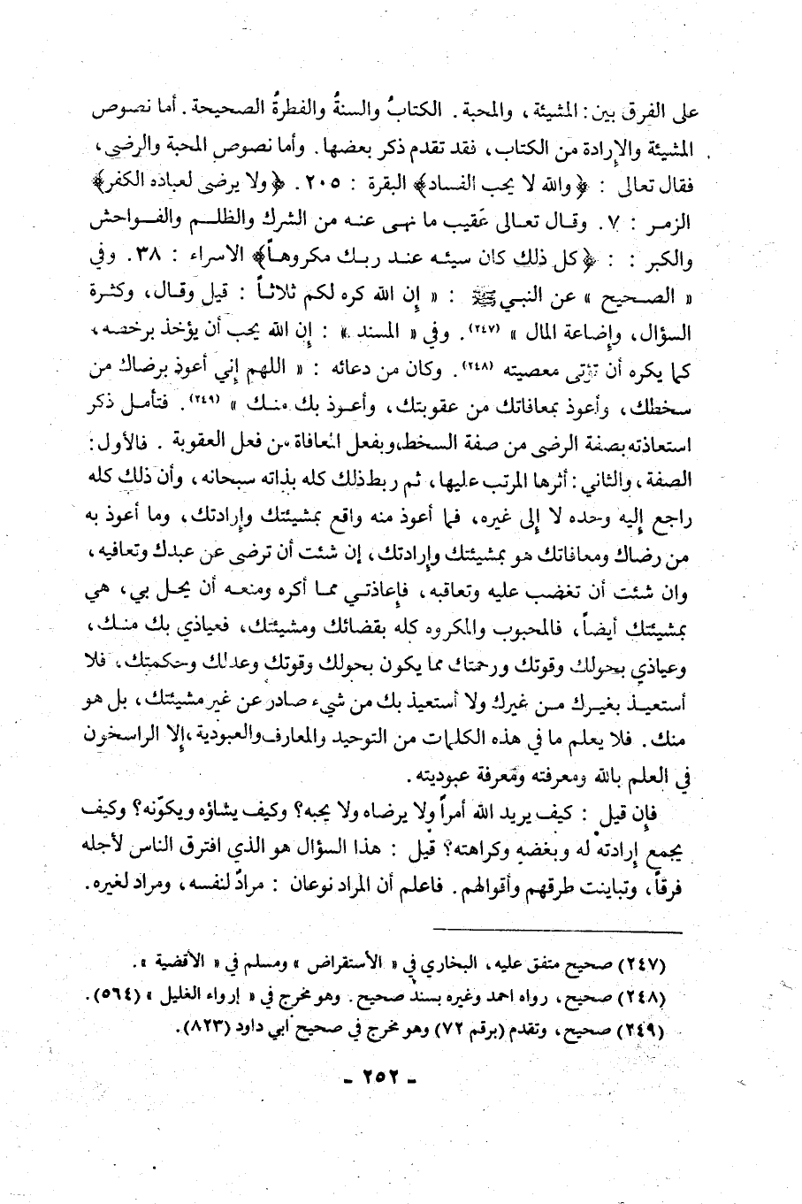 عَلَى الْفَرْقِ بَيْنَ: الْمَشِيئَةِ، وَالْمَحَبَّةِ. الْكِتَابُ وَالسُّنَّةُ وَالْفِطْرَةُ الصَّحِيحَةُ. أَمَّا نُصُوصُ الْمَشِيئَةِ وَالْإِرَادَةِ مِنَ الْكِتَابِ، فَقَدْ تَقَدَّمَ ذِكْرُ بَعْضِهَا, وَأَمَّا نُصُوصُ المحبة والرضى، فَقَالَ تَعَالَى: {وَاللَّهُ لَا يُحِبُّ الْفَسَادَ} [الْبَقَرَةِ: 205]. {وَلَا يَرْضَى لِعِبَادِهِ الْكُفْرَ} [الزُّمَرِ: 7] , وَقَالَ تَعَالَى عَقِيبَ مَا نَهَى عَنْهُ مِنَ الشِّرْكِ وَالظُّلْمِ وَالْفَوَاحِشِ وَالْكِبْرِ: {كُلُّ ذَلِكَ كَانَ سَيِّئُهُ عِنْدَ رَبِّكَ مَكْرُوهًا} [الْإِسْرَاءِ: 38] , وَفِي الصَّحِيحِ عَنِ النَّبِيِّ صَلَّى اللَّهُ عَلَيْهِ وَسَلَّمَ: "إِنَّ اللَّهَ كَرِهَ لَكُمْ ثَلَاثًا: قِيلَ وَقَالَ، وَكَثْرَةَ السُّؤَالِ، وَإِضَاعَةَ الْمَالِ" 1. وَفِي "الْمُسْنَدِ": "إِنَّ اللَّهَ يُحِبُّ أَنْ يُؤْخَذَ بِرُخَصِهِ، كَمَا يَكْرَهُ أَنْ تُؤْتَى مَعْصِيَتُهُ" 2. وكان من دعائه: "اللَّهُمَّ إِنِّي أَعُوذُ بِرِضَاكَ مِنْ سَخَطِكِ، وَأَعُوذُ بِمُعَافَاتِكَ مِنْ عُقُوبَتِكَ، وَأَعُوذُ بِكَ مِنْكَ" 3. فَتَأَمَّلْ ذكر استعاذته بصفة الرضى مِنْ صِفَةِ السُّخْطِ، وَبِفِعْلِ الْمُعَافَاةِ مِنْ فِعْلِ العقوبة. فالأول: الصفة، والثاني: أثرها الْمُرَتَّبِ عَلَيْهَا، ثُمَّ رَبَطَ ذَلِكَ كُلَّهُ بِذَاتِهِ سُبْحَانَهُ، وَأَنَّ ذَلِكَ كُلَّهُ رَاجِعٌ إِلَيْهِ وَحْدَهُ لَا إِلَى غَيْرِهِ، فَمَا أَعُوذُ مِنْهُ وَاقِعٌ بِمَشِيئَتِكَ وَإِرَادَتِكَ، وَمَا أَعُوذُ بِهِ مِنْ رِضَاكَ وَمُعَافَاتِكَ هُوَ بِمَشِيئَتِكَ وَإِرَادَتِكَ، إِنْ شِئْتَ أَنْ تَرْضَى عَنْ عَبْدِكَ وَتُعَافِيَهُ، وَإِنْ شِئْتَ أَنْ تَغْضَبَ عَلَيْهِ وَتُعَاقِبَهُ، فَإِعَاذَتِي مِمَّا أَكْرَهُ وَمَنْعُهُ أَنْ يَحِلَّ بِي، هِيَ بِمَشِيئَتِكَ أَيْضًا، فَالْمَحْبُوبُ وَالْمَكْرُوهُ كُلُّهُ بِقَضَائِكَ وَمَشِيئَتِكَ، فَعِيَاذِي بِكَ مِنْكَ، وَعِيَاذِي بِحَوْلِكَ وَقُوَّتِكَ وَرَحْمَتِكَ مِمَّا يَكُونُ بِحَوْلِكَ وقولك وَعَدْلِكَ وَحِكْمَتِكَ، فَلَا أَسْتَعِيذُ بِغَيْرِكَ مِنْ غَيْرِكَ وَلَا أَسْتَعِيذُ بِكَ مِنْ شَيْءٍ صَادِرٍ عَنْ غَيْرِ مَشِيئَتِكَ، بَلْ هُوَ مِنْكَ. فَلَا يَعْلَمُ مَا فِي هَذِهِ الْكَلِمَاتِ مِنَ التَّوْحِيدِ وَالْمَعَارِفِ وَالْعُبُودِيَّةِ، إِلَّا الرَّاسِخُونَ فِي الْعِلْمِ بِاللَّهِ وَمَعْرِفَتِهِ وَمَعْرِفَةِ عُبُودِيَّتِهِ.