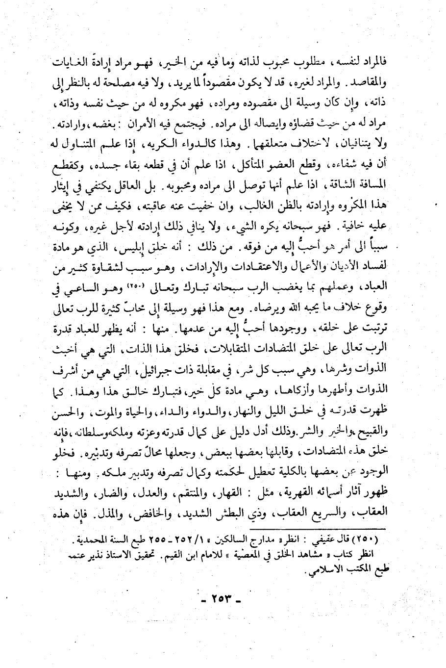 فَالْمُرَادُ لِنَفْسِهِ، مَطْلُوبٌ مَحْبُوبٌ لِذَاتِهِ وَمَا فِيهِ مِنَ الْخَيْرِ، فَهُوَ مُرَادُ إِرَادَةِ الْغَايَاتِ وَالْمَقَاصِدِ, وَالْمُرَادُ لِغَيْرِهِ، قَدْ لَا يَكُونُ مَقْصُودًا لِمَا يُرِيدُ، وَلَا فِيهِ مَصْلَحَةٌ لَهُ بِالنَّظَرِ إِلَى ذَاتِهِ، وَإِنْ كَانَ وَسِيلَةً إِلَى مَقْصُودِهِ وَمُرَادِهِ، فَهُوَ مَكْرُوهٌ لَهُ مِنْ حَيْثُ نَفْسُهُ وَذَاتُهُ، مُرَادٌ لَهُ مِنْ حَيْثُ قَضَاؤُهُ وَإِيصَالُهُ إِلَى مُرَادِهِ, فَيَجْتَمِعُ فِيهِ الْأَمْرَانِ: بُغْضُهُ، وَإِرَادَتُهُ, وَلَا يَتَنَافَيَانِ، لِاخْتِلَافِ مُتَعَلَّقِهِمَا, وَهَذَا كَالدَّوَاءِ الْكَرِيهِ، إِذَا عَلِمَ الْمُتَنَاوِلُ لَهُ أَنَّ فِيهِ شِفَاءَهُ، وَقَطْعِ الْعُضْوِ الْمُتَآكِلِ، إِذَا عَلِمَ أَنَّ فِي قَطْعِهِ بَقَاءَ جَسَدِهِ، وَكَقَطْعِ الْمَسَافَةِ الشَّاقَّةِ، إِذَا عَلِمَ أَنَّهَا تُوصِلُ إِلَى مُرَادِهِ وَمَحْبُوبِهِ, بَلِ الْعَاقِلُ يَكْتَفِي فِي إِيثَارِ هَذَا الْمَكْرُوهِ وَإِرَادَتِهِ بِالظَّنِّ الْغَالِبِ، وَإِنْ خَفِيَتْ عَنْهُ عَاقِبَتُهُ، فَكَيْفَ مِمَّنْ لَا يَخْفَى عَلَيْهِ خَافِيَةٌ, فَهُوَ سُبْحَانَهُ يَكْرَهُ الشَّيْءَ، وَلَا يُنَافِي ذَلِكَ إِرَادَتَهُ لِأَجْلِ غَيْرِهِ، وَكَوْنِهِ سَبَبًا إِلَى أَمْرٍ هُوَ أَحَبُّ إِلَيْهِ من فوقه. مِنْ ذَلِكَ: أَنَّهُ خَلَقَ إِبْلِيسَ، الَّذِي هُوَ مادة الفساد الْأَدْيَانِ وَالْأَعْمَالِ وَالِاعْتِقَادَاتِ وَالْإِرَادَاتِ، وَهُوَ سَبَبٌ لِشَقَاوَةِ كَثِيرٍ مِنَ الْعِبَادِ، وَعَمَلِهِمْ بِمَا يُغْضِبُ الرَّبَّ سُبْحَانَهُ تَبَارَكَ وَتَعَالَى1 وَهُوَ السَّاعِي فِي وُقُوعِ خِلَافِ مَا يُحِبُّهُ اللَّهُ وَيَرْضَاهُ, وَمَعَ هَذَا فَهُوَ وَسِيلَةٌ إِلَى مَحَابَّ كَثِيرَةٍ لِلرَّبِّ تَعَالَى تَرَتَّبَتْ عَلَى خَلْقِهِ، وَوُجُودُهَا أَحَبُّ إِلَيْهِ مِنْ عدمها, منها: أنه يظهر لِلْعِبَادِ قُدْرَةُ الرَّبِّ تَعَالَى عَلَى خَلْقِ الْمُتَضَادَّاتِ المتقابلات، فخلق هذا الذَّاتَ، الَّتِي هِيَ أَخْبَثُ الذَّوَاتِ وَشَرُّهَا، وَهِيَ سبب كل شر، في مقابلة ذات جبرائيل، الَّتِي هِيَ مِنْ أَشْرَفِ الذَّوَاتِ وَأَطْهَرِهَا وَأَزْكَاهَا، وَهِيَ مَادَّةُ كُلِّ خَيْرٍ، فَتَبَارَكَ خَالِقُ هَذَا وَهَذَا. كَمَا ظَهَرَتْ قُدْرَتُهُ فِي خَلْقِ اللَّيْلِ والنهار، والدواء والداء، وَالْحَيَاةِ وَالْمَوْتِ، وَالْحَسَنِ وَالْقَبِيحِ، وَالْخَيْرِ وَالشَّرِّ, وَذَلِكَ أَدَلُّ دَلِيلٍ عَلَى كَمَالِ قُدْرَتِهِ وَعِزَّتِهِ وَمُلْكِهِ وسلطانه، فإنه خلق هذه المتضادات، وقابلها بَعْضَهَا بِبَعْضٍ، وَجَعَلَهَا مَحَالَّ تَصَرُّفِهِ وَتَدْبِيرِهِ, فَخُلُوُّ الْوُجُودِ عَنْ بَعْضِهَا بِالْكُلِّيَّةِ تَعْطِيلٌ لِحِكْمَتِهِ وَكَمَالِ تصرفه وتدبير ملكه, وَمِنْهَا: ظُهُورُ آثَارِ أَسْمَائِهِ الْقَهْرِيَّةِ، مِثْلِ: الْقَهَّارِ، والمنتقم، والعدل، والضار، والشديد العقاب، والسريع العقاب، وَذِي الْبَطْشِ الشَّدِيدِ، وَالْخَافِضِ، وَالْمُذِلِّ. فَإِنَّ هَذِهِ