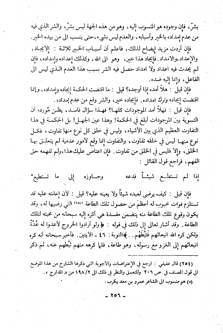 فَإِنْ قِيلَ: هَلَّا أَمَدَّهُ إِذَا أَوْجَدَهُ؟ قِيلَ: مَا اقْتَضَتِ الْحِكْمَةُ إِيجَادَهُ وَإِمْدَادَهُ، وَإِنَّمَا اقْتَضَتْ إِيجَادَهُ وَتَرْكَ إِمْدَادِهِ, فَإِيجَادُهُ خَيْرٌ، وَالشَّرُّ وَقَعَ مِنْ عَدَمِ إِمْدَادِهِ.