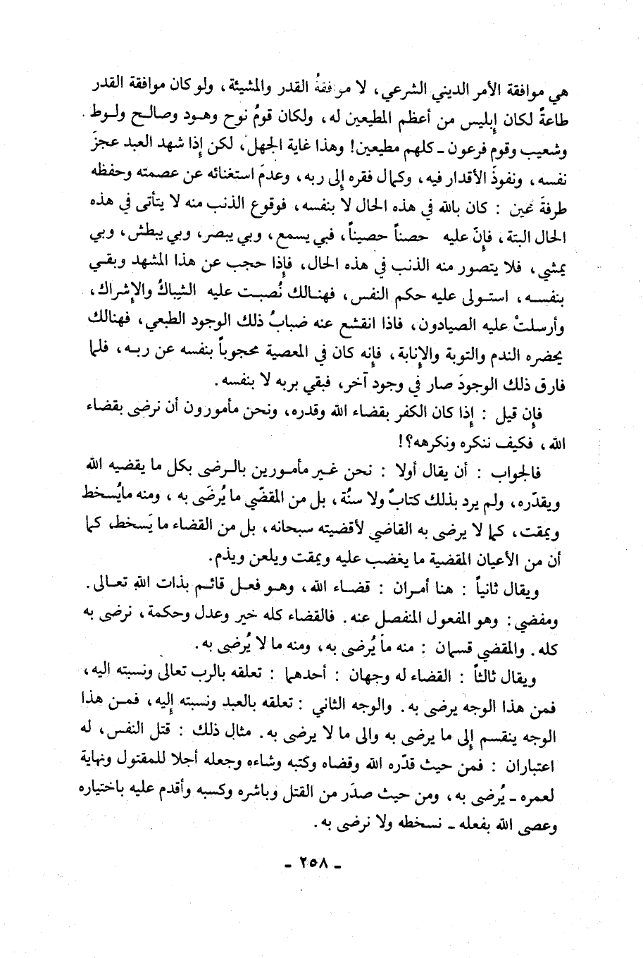 وَيُقَالُ ثَالِثًا: الْقَضَاءُ لَهُ وَجْهَانِ: أَحَدُهُمَا: تَعَلُّقُهُ بِالرَّبِّ تَعَالَى وَنِسْبَتُهُ إِلَيْهِ، فَمِنْ هَذَا الْوَجْهِ يُرْضَى بِهِ. وَالْوَجْهُ الثَّانِي: تَعَلُّقُهُ بِالْعَبْدِ وَنِسْبَتُهُ إِلَيْهِ، فَمِنْ هَذَا الْوَجْهِ يَنْقَسِمُ إِلَى مَا يُرْضَى بِهِ وَإِلَى مَا لَا يُرْضَى بِهِ. مِثَالُ ذَلِكَ: قَتْلُ النَّفْسِ، لَهُ اعْتِبَارَانِ: فَمِنْ حَيْثُ قَدَّرَهُ اللَّهُ وَقَضَاهُ وَكَتَبَهُ وَشَاءَهُ وَجَعَلَهُ أَجَلًا لِلْمَقْتُولِ وَنِهَايَةً لِعُمُرِهِ يُرْضَى به، ومن حيث صدر من القتل وَبَاشَرَهُ وَكَسَبَهُ وَأَقْدَمَ عَلَيْهِ بِاخْتِيَارِهِ وَعَصَى اللَّهَ بِفِعْلِهِ, نَسْخَطُهُ وَلَا نَرْضَى بِهِ.