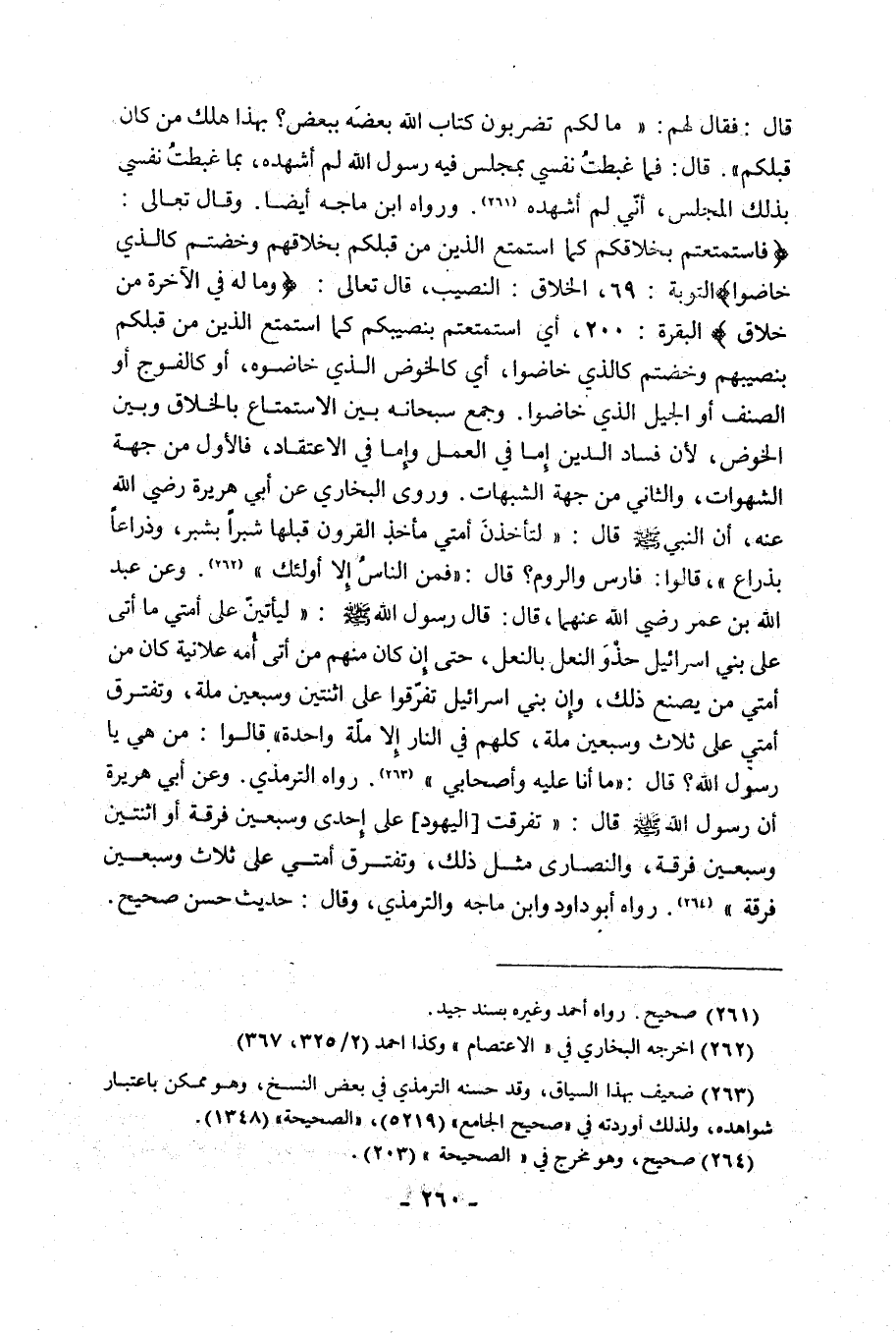 قَالَ: فَقَالَ لَهُمْ: "مَا لَكُمْ تَضْرِبُونَ كِتَابَ اللَّهِ بَعْضَهُ بِبَعْضٍ؟ بِهَذَا هَلَكَ مَنْ كَانَ قَبْلَكُمْ". قَالَ: فَمَا غَبَطْتُ نَفْسِي بِمَجْلِسٍ فِيهِ رَسُولُ اللَّهِ لَمْ أَشْهَدْهُ، بِمَا غَبَطْتُ نَفْسِي بِذَلِكَ الْمَجْلِسِ، أَنِّي لَمْ أَشْهَدْهُ1. وَرَوَاهُ ابْنُ مَاجَهْ أَيْضًا. وَقَالَ تَعَالَى: {فَاسْتَمْتَعْتُمْ بِخَلَاقِكُمْ كَمَا اسْتَمْتَعَ الَّذِينَ مِنْ قَبْلِكُمْ بِخَلَاقِهِمْ وَخُضْتُمْ كَالَّذِي خَاضُوا} [التَّوْبَةِ: 69]، الْخَلَاقُ: النَّصِيبُ، قَالَ تَعَالَى: {وَمَا لَهُ فِي الْآَخِرَةِ مِنْ خَلَاقٍ} [الْبَقَرَةِ: 200]، أَيْ اسْتَمْتَعْتُمْ بِنَصِيبِكُمْ كَمَا اسْتَمْتَعَ الَّذِينَ مِنْ قَبْلِكُمْ بِنَصِيبِهِمْ وَخُضْتُمْ كَالَّذِي خَاضُوا، أَيْ كَالْخَوْضِ الَّذِي خَاضُوهُ، أَوْ كَالْفَوْجِ أَوِ الصِّنْفِ أَوِ الْجِيلِ الَّذِي خَاضُوا. وَجَمَعَ سُبْحَانَهُ بَيْنَ الِاسْتِمْتَاعِ بِالْخَلَاقِ وَبَيْنَ الْخَوْضِ، لِأَنَّ فَسَادَ الدِّينِ إِمَّا فِي الْعَمَلِ وَإِمَّا فِي الِاعْتِقَادِ، فَالْأَوَّلُ مِنْ جِهَةِ الشَّهَوَاتِ، وَالثَّانِي مِنْ جِهَةِ الشُّبُهَاتِ. وَرَوَى الْبُخَارِيُّ عَنْ أَبِي هُرَيْرَةَ رَضِيَ اللَّهُ عَنْهُ، أَنَّ النَّبِيَّ صَلَّى اللَّهُ عَلَيْهِ وَسَلَّمَ قَالَ: "لَتَأْخُذَنَّ أُمَّتِي مَآخِذَ الْقُرُونِ قَبْلَهَا شِبْرًا بِشِبْرٍ، وَذِرَاعًا بِذِرَاعٍ"، قَالُوا: فَارِسُ وَالرُّومُ؟ قَالَ: "فَمَنِ النَّاسُ إِلَّا أُولَئِكَ" 2. وَعَنْ عَبْدِ اللَّهِ بْنِ عُمَرَ رَضِيَ اللَّهُ عَنْهُمَا، قَالَ: قَالَ رَسُولُ اللَّهِ صَلَّى اللَّهُ عَلَيْهِ وَسَلَّمَ: "لَيَأْتِيَنَّ عَلَى أُمَّتِي مَا أَتَى عَلَى بَنِي إِسْرَائِيلَ حَذْوَ النَّعْلِ بِالنَّعْلِ، حَتَّى إِنْ كَانَ مِنْهُمْ مَنْ أَتَى أمه علانية كان من أُمَّتِي مَنْ يَصْنَعُ ذَلِكَ، وَإِنَّ بَنِي إِسْرَائِيلَ تفرقوا على اثنتين وَسَبْعِينَ مِلَّةً، وَتَفْتَرِقُ أُمَّتِي عَلَى ثَلَاثٍ وَسَبْعِينَ مِلَّةً، كُلُّهُمْ فِي النَّارِ إِلَّا مِلَّةً وَاحِدَةً". قَالُوا: مَنْ هِيَ يَا رَسُولَ اللَّهِ؟ قَالَ: "مَا أَنَا عَلَيْهِ وَأَصْحَابِي" 3. رَوَاهُ التِّرْمِذِيُّ. وَعَنْ أَبِي هُرَيْرَةَ أَنَّ رَسُولَ اللَّهِ صَلَّى اللَّهُ عَلَيْهِ وَسَلَّمَ قَالَ: "تَفَرَّقَتِ [الْيَهُودُ] عَلَى إِحْدَى وَسَبْعِينَ فِرْقَةً أَوِ اثْنَتَيْنِ وَسَبْعِينَ فِرْقَةً" 4، وَالنَّصَارَى مِثْلَ ذَلِكَ، وَتَفْتَرِقُ أُمَّتِي عَلَى ثَلَاثٍ وَسَبْعِينَ فِرْقَةً. رَوَاهُ أَبُو دَاوُدَ وَابْنُ مَاجَهْ وَالتِّرْمِذِيُّ، وقال: حديث حسن صحيح.
