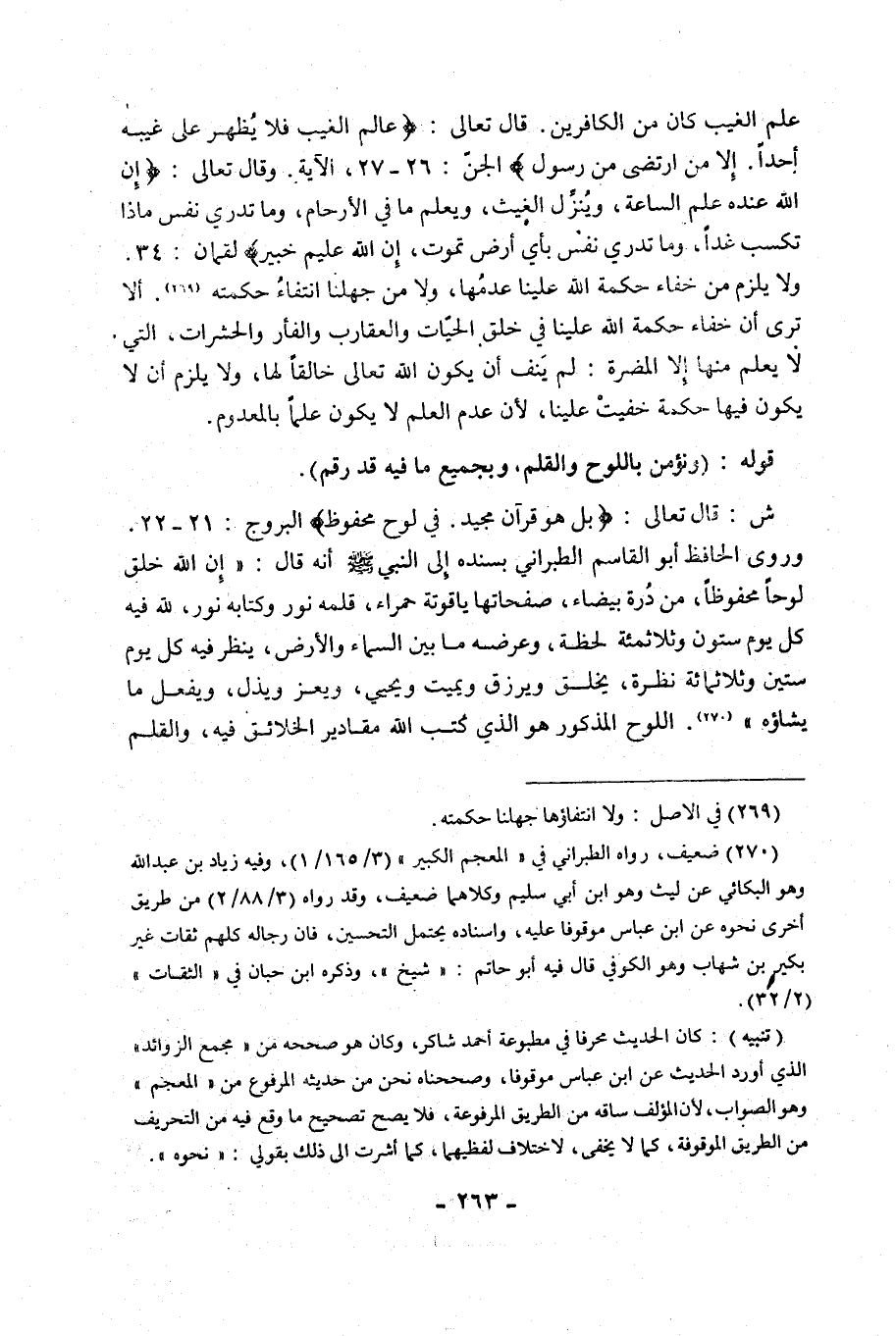 ش: قَالَ تَعَالَى: {بَلْ هُوَ قُرْآَنٌ مَجِيدٌ، فِي لَوْحٍ مَحْفُوظٍ} [الْبُرُوجِ: 21 - 22] وَرَوَى الْحَافِظُ أَبُو الْقَاسِمِ الطَّبَرَانِيُّ بِسَنَدِهِ إِلَى النَّبِيِّ صَلَّى اللَّهُ عَلَيْهِ وَسَلَّمَ أَنَّهُ قَالَ: "إِنَّ اللَّهَ خَلَقَ لَوْحًا مَحْفُوظًا، مِنْ دُرَّةٍ بَيْضَاءَ، صَفَحَاتُهَا يَاقُوتَةٌ حَمْرَاءُ، قَلَمُهُ نُورٌ وَكِتَابُهُ نُورٌ، لِلَّهِ فِيهِ كُلَّ يَوْمٍ سِتُّونَ وَثَلَاثُمِائَةِ لَحْظَةٍ، وعرضه ما بين السماء والأرض، ينظر فيه كل يوم ستين وثلاثمائة نظرة، يَخْلُقُ وَيَرْزِقُ وَيُمِيتُ وَيُحْيِي، وَيُعِزُّ وَيُذِلُّ، وَيَفْعَلُ مَا يَشَاؤُهُ"1.