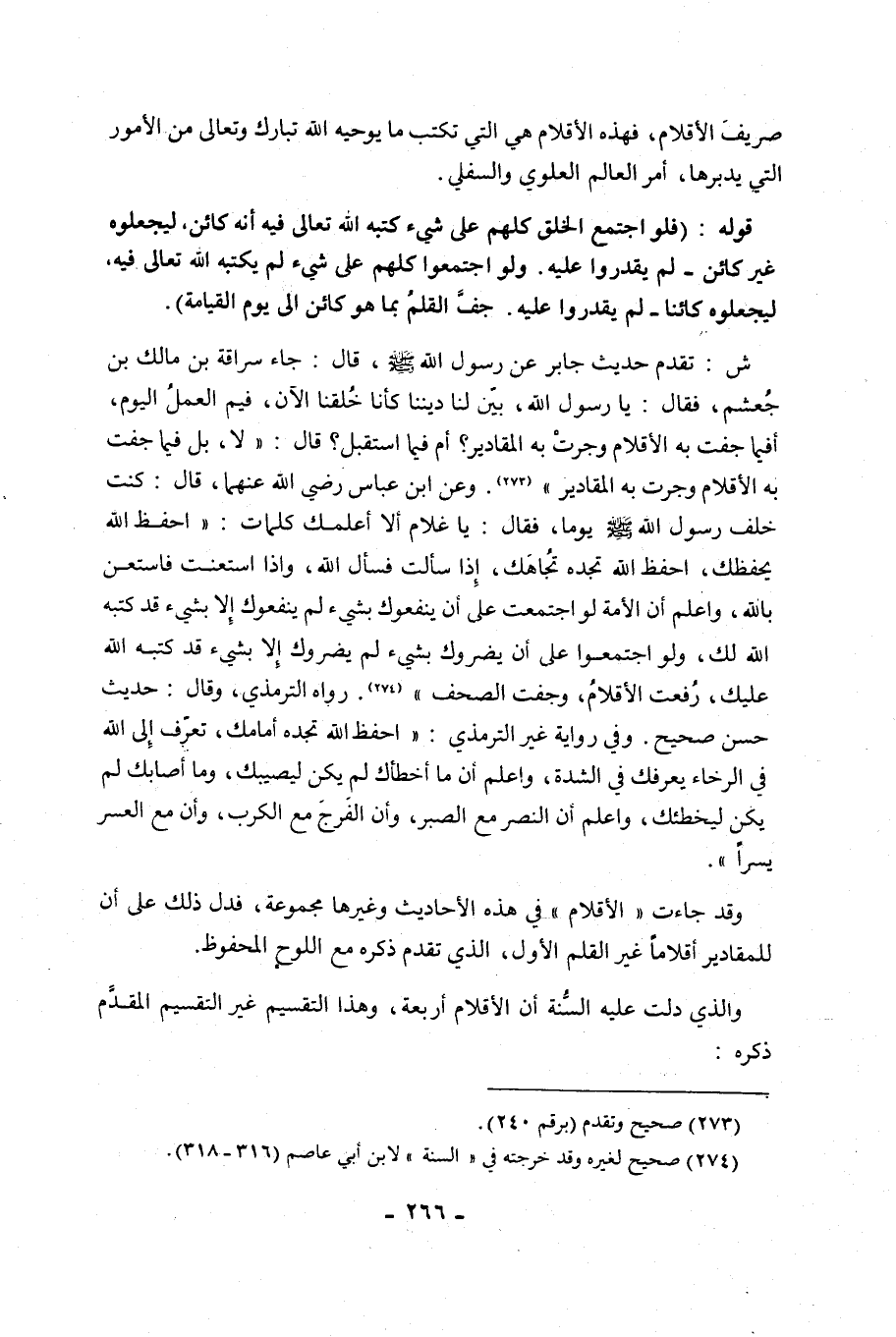 ش: تَقَدَّمَ حَدِيثُ جَابِرٍ عَنْ رَسُولِ اللَّهِ صَلَّى اللَّهُ عَلَيْهِ وَسَلَّمَ، قَالَ: جَاءَ سُرَاقَةُ بْنُ مَالِكِ بْنِ جُعْشُمٍ، فَقَالَ: يَا رَسُولَ اللَّهِ، بَيِّنْ لَنَا دِينَنَا كَأَنَّا خُلِقْنَا الْآنَ، فِيمَ الْعَمَلُ الْيَوْمَ، أَفِيمَا جَفَّتْ بِهِ الْأَقْلَامُ وَجَرَتْ بِهِ الْمَقَادِيرُ؟ أم فيما استقبل؟ قَالَ: "لَا، بَلْ فِيمَا جَفَّتْ بِهِ الْأَقْلَامُ وَجَرَتْ بِهِ الْمَقَادِيرُ" 1. وَعَنِ ابْنِ عَبَّاسٍ رَضِيَ الله عنهما، قال: كنت خلف رَسُولِ اللَّهِ صَلَّى اللَّهُ عَلَيْهِ وَسَلَّمَ يَوْمًا، فَقَالَ: "يَا غُلَامُ أَلَا أُعَلِّمُكَ كَلِمَاتٍ: احْفَظِ اللَّهَ يَحْفَظْكَ، احْفَظِ اللَّهَ تَجِدْهُ تُجَاهَكَ، إِذَا سألت فسأل اللَّهَ، وَإِذَا اسْتَعَنْتَ فَاسْتَعِنْ بِاللَّهِ، وَاعْلَمْ أَنَّ الْأُمَّةَ لَوِ اجْتَمَعَتْ عَلَى أَنْ يَنْفَعُوكَ بِشَيْءٍ لَمْ يَنْفَعُوكَ إِلَّا بِشَيْءٍ قَدْ كَتَبَهُ اللَّهُ لَكَ، وَلَوِ اجْتَمَعُوا عَلَى أَنْ يَضُرُّوكَ بِشَيْءٍ لَمْ يَضُرُّوكَ إِلَّا بِشَيْءٍ قَدْ كَتَبَهُ اللَّهُ عَلَيْكَ، رُفِعَتِ الْأَقْلَامُ، وَجَفَّتِ الصُّحُفُ" 2. رَوَاهُ التِّرْمِذِيُّ، وَقَالَ: حَدِيثٌ حَسَنٌ صَحِيحٌ. وَفِي رِوَايَةِ غَيْرِ التِّرْمِذِيِّ: "احْفَظِ اللَّهَ تَجِدْهُ أَمَامَكَ، تَعَرَّفْ إِلَى اللَّهِ فِي الرَّخَاءِ يَعْرِفْكَ فِي الشِّدَّةِ، وَاعْلَمْ أَنَّ مَا أَخْطَأَكَ لِمَ يَكُنْ لِيُصِيبَكَ، وَمَا أَصَابَكَ لَمْ يَكُنْ لِيُخْطِئَكَ، وَاعْلَمْ أَنَّ النَّصْرَ مَعَ الصَّبْرِ، وَأَنَّ الْفَرَجَ مَعَ الْكَرْبِ، وَأَنَّ مَعَ الْعُسْرِ يُسْرًا".
