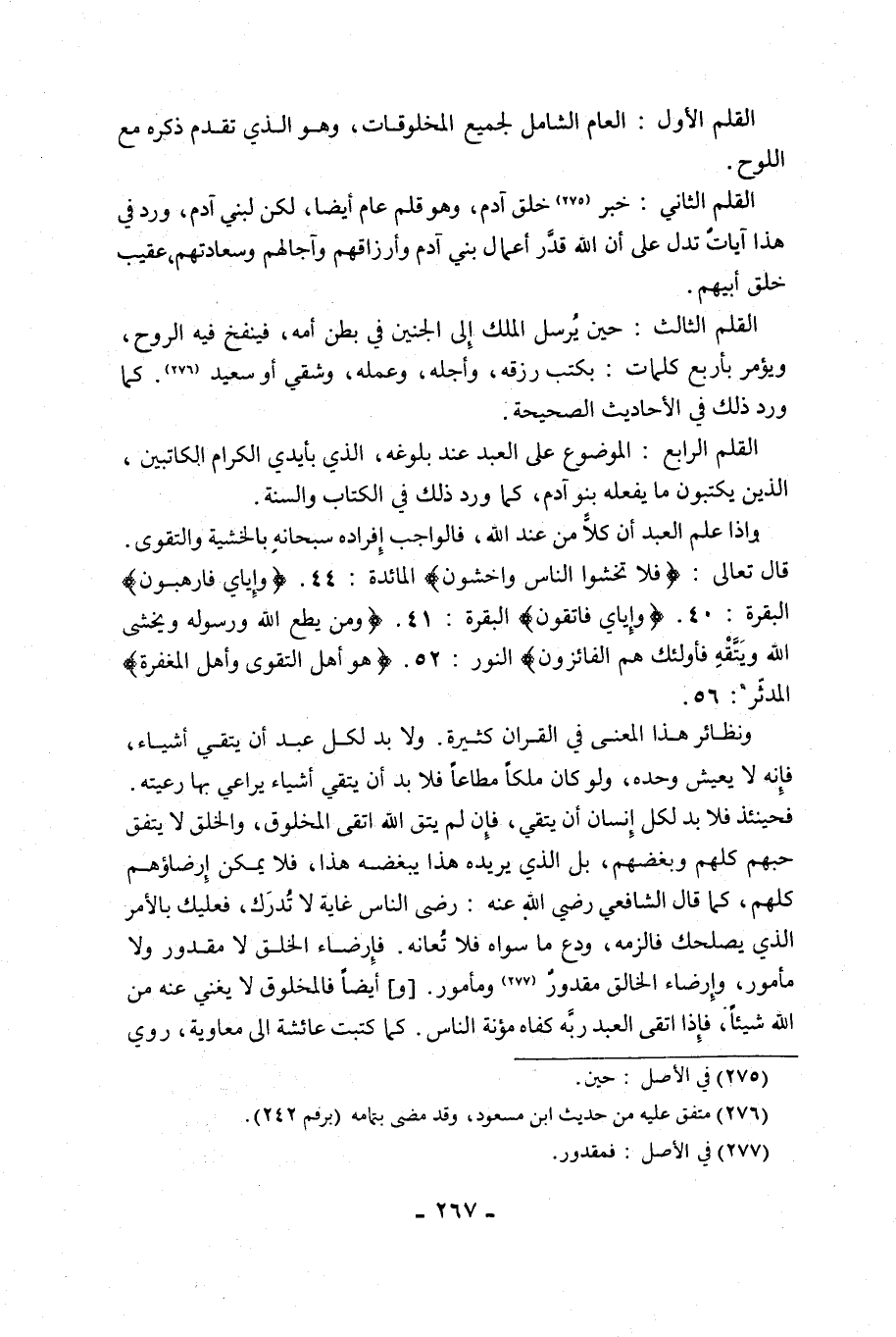 وَإِذَا عَلِمَ الْعَبْدُ أَنَّ كُلًّا مِنْ عِنْدِ اللَّهِ، فَالْوَاجِبُ إِفْرَادُهُ سُبْحَانَهُ بِالْخَشْيَةِ وَالتَّقْوَى. قَالَ تَعَالَى: {فَلَا تَخْشَوُا النَّاسَ وَاخْشَوْنِ} [الْمَائِدَةِ: 44]. {وَإِيَّايَ فَارْهَبُونِ} [الْبَقَرَةِ: 40]. {وَإِيَّايَ فَاتَّقُونِ} [الْبَقَرَةِ: 41]. {وَمَنْ يُطِعِ اللَّهَ وَرَسُولَهُ وَيَخْشَ اللَّهَ وَيَتَّقْهِ فَأُولَئِكَ هُمُ الْفَائِزُونَ} [النُّورِ: 52]. {هُوَ أَهْلُ التَّقْوَى وَأَهْلُ الْمَغْفِرَةِ} [الْمُدَّثِّرِ: 56].