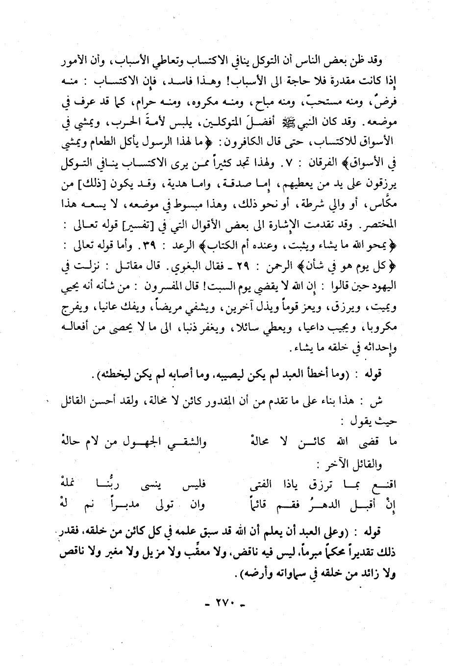 وَقَدْ ظَنَّ بَعْضُ النَّاسِ أَنَّ التَّوَكُّلَ يُنَافِي الِاكْتِسَابَ وَتَعَاطِيَ الْأَسْبَابِ، وَأَنَّ الْأُمُورَ إِذَا كَانَتْ مُقَدَّرَةً فَلَا حَاجَةَ إِلَى الْأَسْبَابِ! وَهَذَا فَاسِدٌ، فَإِنَّ الِاكْتِسَابَ: مِنْهُ فَرْضٌ، وَمِنْهُ مُسْتَحَبٌّ، وَمِنْهُ مُبَاحٌ، وَمِنْهُ مَكْرُوهٌ، وَمِنْهُ حَرَامٌ، كَمَا قَدْ عُرِفَ فِي مَوْضِعِهِ. وَقَدْ كَانَ النَّبِيُّ صَلَّى اللَّهُ عَلَيْهِ وَسَلَّمَ أَفْضَلَ الْمُتَوَكِّلِينَ، يَلْبَسُ لَأْمَةَ الْحَرْبِ، وَيَمْشِي فِي الْأَسْوَاقِ لِلِاكْتِسَابِ، حَتَّى قَالَ الْكَافِرُونَ: {مَالِ هَذَا الرَّسُولِ يَأْكُلُ الطَّعَامَ وَيَمْشِي فِي الأَسْوَاقِ} [الْفُرْقَانِ: 7]. وَلِهَذَا تَجِدُ كَثِيرًا مِمَّنْ يَرَى الِاكْتِسَابَ يُنَافِي التَّوَكُّلَ يُرْزَقُونَ عَلَى يَدِ مَنْ يُعْطِيهِمْ، إِمَّا صَدَقَةً، وَإِمَّا هَدِيَّةً، وَقَدْ يَكُونُ [ذَلِكَ] مِنْ مَكَّاسٍ، أَوْ وَالِي شُرْطَةٍ، أَوْ نَحْوِ ذَلِكَ، وَهَذَا مَبْسُوطٌ فِي مَوْضِعِهِ، لَا يَسَعُهُ هَذَا الْمُخْتَصَرُ. وَقَدْ تَقَدَّمَتِ الْإِشَارَةُ إِلَى بَعْضِ الْأَقْوَالِ الَّتِي فِي [تَفْسِيرِ] قَوْلِهِ تعالى: {يَمْحُوا اللَّهُ مَا يَشَاءُ وَيُثْبِتُ وَعِنْدَهُ أُمُّ الْكِتَابِ} [الرَّعْدِ: 39]. وَأَمَّا قَوْلُهُ تَعَالَى: {كُلَّ يَوْمٍ هُوَ فِي شَأْنٍ} [الرحمن: 29] فقال الْبَغَوِيُّ. قَالَ مُقَاتِلٌ: نَزَلَتْ فِي الْيَهُودِ حِينَ قَالُوا: إِنَّ اللَّهَ لَا يَقْضِي يَوْمَ السَّبْتِ! قَالَ الْمُفَسِّرُونَ: مِنْ شَأْنِهِ أَنَّهُ يُحْيِي وَيُمِيتُ، وَيَرْزُقُ، وَيُعِزُّ قَوْمًا وَيُذِلُّ آخَرِينَ، وَيَشْفِي مَرِيضًا، وَيَفُكُّ عَانِيًا، وَيُفَرِّجُ مَكْرُوبًا، وَيُجِيبُ دَاعِيًا، وَيُعْطِي سَائِلًا، وَيَغْفِرُ ذَنْبًا، إِلَى مَا لَا يُحْصَى مِنْ أَفْعَالِهِ وَإِحْدَاثِهِ فِي خَلْقِهِ مَا يَشَاءُ.