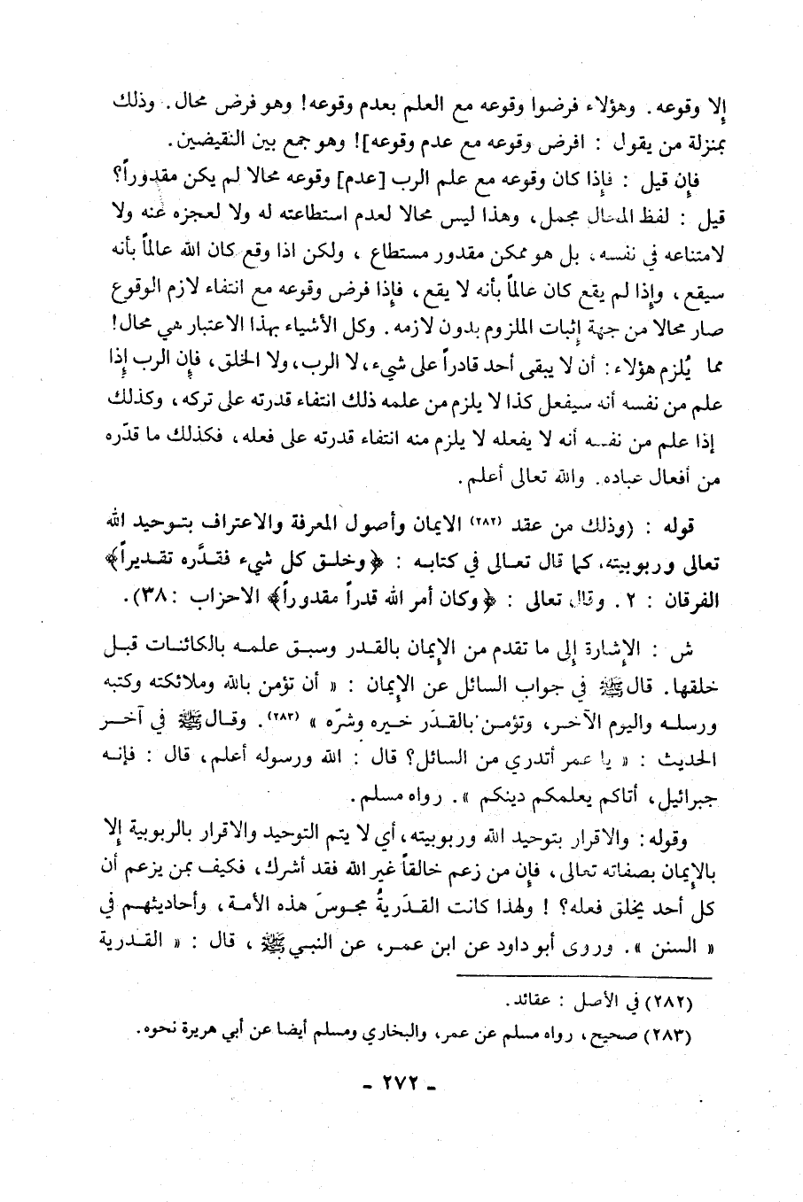 وقوله: والإقرار بِتَوْحِيدِ اللَّهِ وَرُبُوبِيَّتِهِ، أَيْ لَا يَتِمُّ التَّوْحِيدُ والإقرار بِالرُّبُوبِيَّةِ إِلَّا بِالْإِيمَانِ بِصِفَاتِهِ تَعَالَى، فَإِنَّ مَنْ زَعَمَ خَالِقًا غَيْرَ اللَّهِ فَقَدْ أَشْرَكَ، فَكَيْفَ بِمَنْ يَزْعُمُ أَنَّ كُلَّ أَحَدٍ يَخْلُقُ فِعْلَهُ؟! وَلِهَذَا كَانَتِ الْقَدَرِيَّةُ مَجُوسَ هَذِهِ الْأُمَّةِ، وَأَحَادِيثُهُمْ في "السنن". وروى أَبُو دَاوُدَ عَنِ ابْنِ عُمَرَ، عَنِ النَّبِيِّ صلى الله عليه وسلم، قال: "القدرية