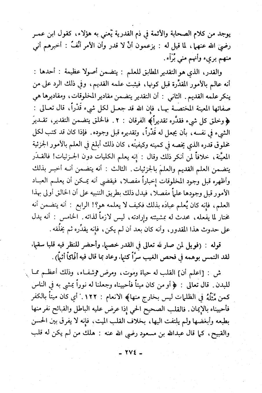 وَالْقَدَرُ، الَّذِي هُوَ التَّقْدِيرُ الْمُطَابِقُ لِلْعِلْمِ يَتَضَمَّنُ أُصُولًا عَظِيمَةً: أَحَدُهَا: أَنَّهُ عَالِمٌ بِالْأُمُورِ الْمُقَدَّرَةِ قَبْلَ كَوْنِهَا، فَيَثْبُتُ عِلْمُهُ الْقَدِيمُ، وَفِي ذَلِكَ الرَّدُّ عَلَى مَنْ يُنْكِرُ عِلْمَهُ الْقَدِيمَ. الثَّانِي: أَنَّ التَّقْدِيرَ يَتَضَمَّنُ مَقَادِيرَ الْمَخْلُوقَاتِ، وَمَقَادِيرُهَا هِيَ صِفَاتُهَا الْمُعَيَّنَةُ الْمُخْتَصَّةُ بِهَا، فَإِنَّ اللَّهَ قَدْ جَعَلَ لِكُلِّ شَيْءٍ قَدْرًا، قَالَ تَعَالَى: {وَخَلَقَ كُلَّ شَيْءٍ فَقَدَّرَهُ تَقْدِيرًا} [الْفُرْقَانِ: 2]. فَالْخَلْقُ يَتَضَمَّنُ التَّقْدِيرَ، تَقْدِيرَ الشَّيْءِ فِي نَفْسِهِ، بِأَنْ يُجْعَلَ لَهُ قدرا، وَتَقْدِيرَهُ قَبْلَ وُجُودِهِ, فَإِذَا كَانَ قَدْ كَتَبَ لِكُلِّ مَخْلُوقٍ قَدْرَهُ الَّذِي يَخُصُّهُ فِي كَمِّيَتِهِ وَكَيْفِيَّتِهِ، كَانَ ذَلِكَ أَبْلَغَ فِي الْعِلْمِ بِالْأُمُورِ الْجُزْئِيَّةِ الْمُعَيَّنَةِ، خِلَافًا لِمَنْ أَنْكَرَ ذَلِكَ وَقَالَ: إِنَّهُ يَعْلَمُ الْكُلِّيَّاتِ دُونَ الْجُزْئِيَّاتِ! فَالْقَدَرُ يَتَضَمَّنُ الْعِلْمَ الْقَدِيمَ وَالْعِلْمَ بِالْجُزْئِيَّاتِ, الثَّالِثُ: أَنَّهُ يَتَضَمَّنُ أَنَّهُ أَخْبَرَ بِذَلِكَ وَأَظْهَرَهُ قَبْلَ وُجُودِ الْمَخْلُوقَاتِ إِخْبَارًا مُفَصَّلًا، فَيَقْضِي أَنَّهُ يُمْكِنُ أَنْ يُعْلِمَ الْعِبَادَ الْأُمُورَ قَبْلَ وُجُودِهَا عِلْمًا مُفَصَّلًا، فَيَدُلُّ ذَلِكَ بِطَرِيقِ التَّنْبِيهِ عَلَى أَنَّ الْخَالِقَ أَوْلَى بِهَذَا الْعِلْمِ، فَإِنَّهُ كَانَ يُعْلِمُ عِبَادَهُ بِذَلِكَ فَكَيْفَ لَا يَعْلَمُهُ هُوَ؟! الرَّابِعُ: أَنَّهُ يَتَضَمَّنُ أَنَّهُ مُخْتَارٌ لِمَا يَفْعَلُهُ، مُحْدِثٌ لَهُ بِمَشِيئَتِهِ وَإِرَادَتِهِ، لَيْسَ لَازِمًا لِذَاتِهِ. الْخَامِسُ: أَنَّهُ يَدُلُّ عَلَى حُدُوثِ هَذَا الْمَقْدُورِ، وَأَنَّهُ كَانَ بَعْدَ أَنْ لَمْ يَكُنْ، فَإِنَّهُ يُقَدِّرُهُ ثُمَّ يَخْلُقُهُ.