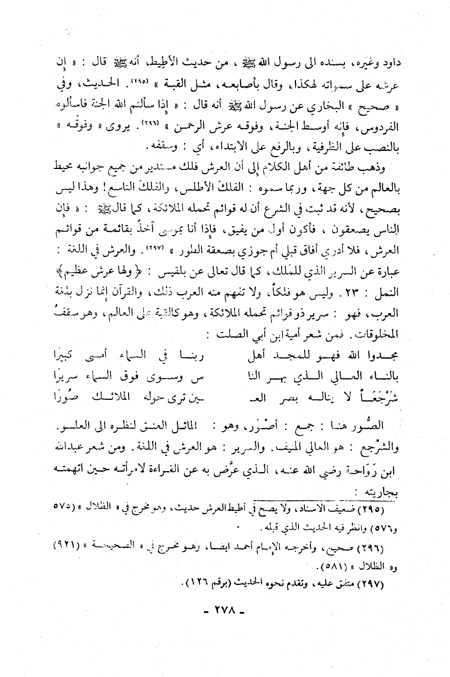 دَاوُدَ وَغَيْرُهُ، بِسَنَدِهِ إِلَى رَسُولِ اللَّهِ صَلَّى اللَّهُ عَلَيْهِ وَسَلَّمَ، مِنْ حَدِيثِ الأطِيط، أَنَّهُ صَلَّى اللَّهُ عَلَيْهِ وَسَلَّمَ قَالَ: "إِنَّ عَرْشَهُ على سمواته لهكذا"، وَقَالَ بِأَصَابِعِهِ، مِثْلَ الْقُبَّةِ1. الْحَدِيثَ، وَفِي صَحِيحِ الْبُخَارِيِّ عَنْ رَسُولِ اللَّهِ صَلَّى اللَّهُ عَلَيْهِ وَسَلَّمَ أَنَّهُ قَالَ: "إِذَا سَأَلْتُمُ اللَّهَ الْجَنَّةَ فاسألوه الفردوس، فإنه أوسط الْجَنَّةِ، وَفَوْقَهُ عَرْشُ الرَّحْمَنِ" 2. يُرْوَى "وَفَوْقَهُ" بِالنَّصْبِ عَلَى الظَّرْفِيَّةِ، وَبِالرَّفْعِ عَلَى الِابْتِدَاءِ، أَيْ: وَسَقْفُهُ.