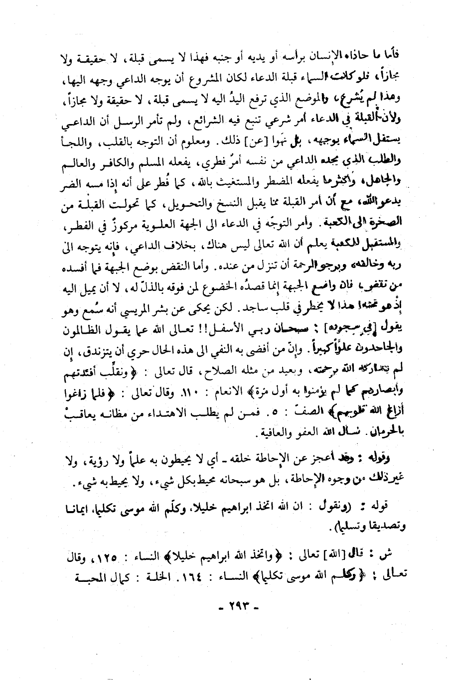 فَأَمَّا مَا حَاذَاهُ الْإِنْسَانُ بِرَأْسِهِ أَوْ يَدَيْهِ أَوْ جَنْبِهِ فَهَذَا لَا يُسَمَّى قِبْلَةً، لَا حَقِيقَةً وَلَا مَجَازًا، فَلَوْ كَانَتِ السَّمَاءُ قِبْلَةَ الدُّعَاءِ لَكَانَ الْمَشْرُوعُ أَنْ يُوَجِّهَ الدَّاعِي وَجْهَهُ إِلَيْهَا، وَهَذَا لَمْ يُشْرَعْ، وَالْمَوْضِعُ الَّذِي تُرْفَعُ الْيَدُ إِلَيْهِ لَا يُسَمَّى قِبْلَةً، لَا حَقِيقَةً وَلَا مَجَازًا، وَلِأَنَّ الْقِبْلَةَ فِي الدُّعَاءِ أَمْرٌ شرعي تنبع فِيهِ الشَّرَائِعُ، وَلَمْ تَأْمُرِ الرُّسُلُ أَنَّ الدَّاعِيَ يستقل السَّمَاءَ بِوَجْهِهِ، بَلْ نَهَوْا [عَنْ] ذَلِكَ, وَمَعْلُومٌ أَنَّ التَّوَجُّهَ بِالْقَلْبِ، وَاللَّجْأُ وَالطَّلَبُ الَّذِي يَجِدُهُ الدَّاعِي مِنْ نَفْسِهِ أَمْرٌ فِطْرِيٌّ، يَفْعَلُهُ الْمُسْلِمُ وَالْكَافِرُ وَالْعَالِمُ وَالْجَاهِلُ، وَأَكْثَرُ مَا يَفْعَلُهُ الْمُضْطَرُّ وَالْمُسْتَغِيثُ بِاللَّهِ، كَمَا فُطِرَ عَلَى أَنَّهُ إِذَا مَسَّهُ الضُّرُّ يَدْعُو اللَّهَ، مَعَ أَنَّ أَمْرَ الْقِبْلَةِ مِمَّا يَقْبَلُ النَّسْخَ وَالتَّحْوِيلَ، كَمَا تَحَوَّلَتِ الْقِبْلَةُ مِنَ الصَّخْرَةِ إِلَى الْكَعْبَةِ, وَأَمْرُ التَّوَجُّهِ فِي الدُّعَاءِ إِلَى الْجِهَةِ الْعُلْوِيَّةِ مَرْكُوزٌ فِي الْفِطَرِ، وَالْمُسْتَقْبِلُ لِلْكَعْبَةِ يَعْلَمُ أَنَّ اللَّهَ تَعَالَى لَيْسَ هُنَاكَ، بِخِلَافِ الدَّاعِي، فَإِنَّهُ يَتَوَجَّهُ إِلَى رَبِّهِ وَخَالِقِهِ، وَيَرْجُو الرَّحْمَةَ أَنْ تَنْزِلَ مِنْ عِنْدِهِ, وَأَمَّا النَّقْضُ بِوَضْعِ الْجَبْهَةِ فَمَا أَفْسَدَهُ مِنْ نَقْضٍ، فَإِنَّ وَاضِعَ الْجَبْهَةِ إِنَّمَا قَصْدُهُ الخضوع لمن فوقه بالذل له، لا أن يَمِيلَ إِلَيْهِ إِذْ هُوَ تَحْتَهُ! هَذَا لَا يَخْطُرُ فِي قَلْبِ سَاجِدٍ. لَكِنْ يُحْكَى عَنْ بِشْرٍ الْمَرِيسِيِّ أَنَّهُ سُمِعَ وَهُوَ يَقُولُ [فِي سُجُودِهِ]: سُبْحَانَ رَبِّيَ الْأَسْفَلِ!! تَعَالَى اللَّهُ عَمَّا يَقُولُ الظَّالِمُونَ وَالْجَاحِدُونَ عُلُوًّا كَبِيرًا, وَإِنَّ مَنْ أَفْضَى بِهِ النَّفْيُ إِلَى هَذِهِ الْحَالِ حَرِيٌّ أَنَ يَتَزَنْدَقَ، إِنْ لَمْ يَتَدَارَكْهُ اللَّهُ بِرَحْمَتِهِ، وَبَعِيدٌ مِنْ مِثْلِهِ الصَّلَاحُ، قَالَ تَعَالَى: {وَنُقَلِّبُ أَفْئِدَتَهُمْ وَأَبْصَارَهُمْ كَمَا لَمْ يُؤْمِنُوا بِهِ أَوَّلَ مَرَّةٍ} [الْأَنْعَامِ: 110]. وَقَالَ تَعَالَى: {فَلَمَّا زَاغُوا أَزَاغَ اللَّهُ قُلُوبَهُمْ} [الصَّفِّ: 5]. فَمَنْ لَمْ يَطْلُبْ الِاهْتِدَاءَ مِنْ مَظَانِّهِ يُعَاقَبْ بِالْحِرْمَانِ. نَسْأَلُ اللَّهَ الْعَفْوَ وَالْعَافِيَةَ.