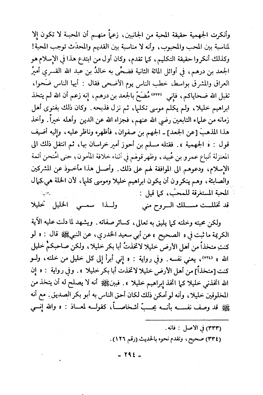 وَأَنْكَرَتِ الْجَهْمِيَّةُ حَقِيقَةَ الْمَحَبَّةِ مِنَ الْجَانِبَيْنِ، زَعْمًا مِنْهُمْ أَنَّ الْمَحَبَّةَ لَا تَكُونُ إِلَّا لِمُنَاسَبَةٍ بَيْنَ الْمُحِبِّ وَالْمَحْبُوبِ، وَأَنَّهُ لَا مُنَاسَبَةَ بَيْنَ الْقَدِيمِ وَالْمُحْدَثِ تُوجِبُ الْمَحَبَّةَ! وَكَذَلِكَ أَنْكَرُوا حَقِيقَةَ التَّكْلِيمِ، كَمَا تَقَدَّمَ، وَكَانَ أَوَّلَ مَنِ ابْتَدَعَ هَذَا فِي الْإِسْلَامِ هُوَ الْجَعْدُ بْنُ دِرْهَمٍ، فِي أَوَائِلِ الْمِائَةِ الثَّانِيَةِ فَضَحَّى بِهِ خَالِدُ بْنُ عَبْدِ اللَّهِ الْقَسْرِيُّ أَمِيرُ الْعِرَاقِ وَالْمَشْرِقِ بِوَاسِطَ، خَطَبَ النَّاسَ يَوْمَ الْأَضْحَى فَقَالَ: أَيُّهَا النَّاسُ ضَحُّوا، تَقَبَّلَ اللَّهُ ضَحَايَاكُمْ، فَإِنِّي1 مُضَحٍّ بِالْجَعْدِ بْنِ دِرْهَمٍ، إِنَّهُ زَعَمَ أَنَّ اللَّهَ لَمْ يَتَّخِذْ إِبْرَاهِيمَ خَلِيلًا، وَلَمْ يُكَلِّمْ مُوسَى تَكْلِيمًا، ثُمَّ نَزَلَ فَذَبَحَهُ, وَكَانَ ذَلِكَ بِفَتْوَى أَهْلِ زَمَانِهِ مِنْ عُلَمَاءِ التَّابِعِينَ رَضِيَ اللَّهُ عَنْهُمْ، فَجَزَاهُ اللَّهُ عَنِ الدِّينِ وَأَهْلِهِ خَيْرًا. وَأَخَذَ هَذَا الْمَذْهَبَ [عَنِ الْجَعْدِ] , الْجَهْمُ بْنُ صَفْوَانَ، فَأَظْهَرَهُ وَنَاظَرَ عَلَيْهِ، وَإِلَيْهِ أُضِيفَ قَوْلُ: الجهمية. فقتله مسلم بْنُ أَحْوَزَ أَمِيرُ خُرَاسَانَ بِهَا، ثُمَّ انْتَقَلَ ذَلِكَ إِلَى الْمُعْتَزِلَةِ أَتْبَاعِ عَمْرِو بْنِ عُبَيْدٍ، وَظَهَرَ قَوْلُهُمْ فِي أَثْنَاءِ خِلَافَةِ الْمَأْمُونِ، حَتَّى امْتُحِنَ أَئِمَّةُ الْإِسْلَامِ، وَدَعَوْهُمْ إِلَى الْمُوَافَقَةِ لَهُمْ عَلَى ذَلِكَ. وَأَصْلُ هَذَا مَأْخُوذٌ عَنِ الْمُشْرِكِينَ وَالصَّابِئَةِ، وَهُمْ يُنْكِرُونَ أَنْ يَكُونَ إِبْرَاهِيمُ خَلِيلًا وَمُوسَى كَلِيمًا، لِأَنَّ الْخُلَّةَ هِيَ كَمَالُ الْمَحَبَّةِ الْمُسْتَغْرِقَةِ لِلْمُحِبِّ، كَمَا قِيلَ:
