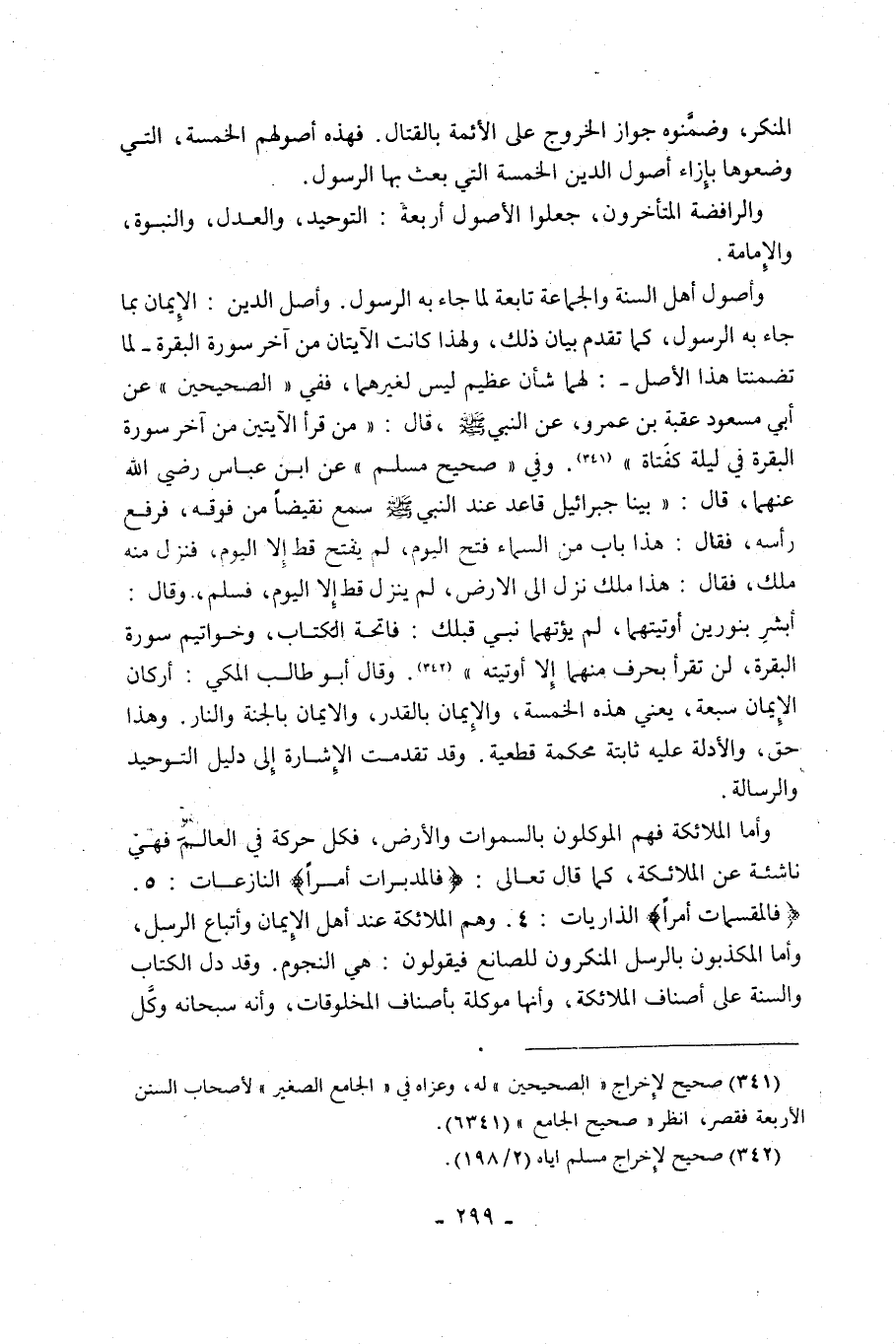 وَأُصُولُ أَهْلِ السُّنَّةِ وَالْجَمَاعَةِ تَابِعَةٌ لِمَا جَاءَ بِهِ الرَّسُولُ. وَأَصْلُ الدِّينِ: الْإِيمَانُ بِمَا جَاءَ بِهِ الرَّسُولُ، كَمَا تَقَدَّمَ بَيَانُ ذَلِكَ، وَلِهَذَا كَانَتِ الْآيَتَانِ مِنْ آخِرِ سُورَةِ الْبَقَرَةِ, لَمَّا تَضَمَّنَتَا هَذَا الْأَصْلَ: لَهُمَا شَأْنٌ عَظِيمٌ لَيْسَ لِغَيْرِهِمَا، فَفِي الصَّحِيحَيْنِ عَنْ أَبِي مَسْعُودٍ عُقْبَةَ بْنِ عَمْرٍو، عَنِ النَّبِيِّ صَلَّى اللَّهُ عَلَيْهِ وَسَلَّمَ، قَالَ: "مَنْ قَرَأَ الْآيَتَيْنِ مِنْ آخِرِ سُورَةِ الْبَقَرَةِ فِي لَيْلَةٍ كَفَتَاهُ" 1. وَفِي صَحِيحِ مُسْلِمٍ عَنِ ابْنِ عَبَّاسٍ رَضِيَ اللَّهُ عنهما، قال: "بينا جبرائيل قَاعِدٌ عِنْدَ النَّبِيِّ صَلَّى اللَّهُ عَلَيْهِ وَسَلَّمَ سَمِعَ نَقِيضًا مِنْ فَوْقِهِ، فَرَفَعَ رَأْسَهُ، فَقَالَ: هَذَا بَابٌ مِنَ السَّمَاءِ فُتِحَ الْيَوْمَ، لَمْ يُفْتَحْ قَطُّ إِلَّا الْيَوْمَ، فَنَزَلَ مِنْهُ مَلَكٌ، فَقَالَ: هَذَا مَلَكٌ نَزَلَ إِلَى الْأَرْضِ، لَمْ يَنْزِلْ قَطُّ إِلَّا الْيَوْمَ، فَسَلَّمَ، وَقَالَ: أَبْشِرْ بِنُورَيْنِ أُوتِيتَهُمَا، لَمْ يُؤْتَهُمَا نَبِيٌّ قَبْلَكَ: فَاتِحَةِ الْكِتَابِ، وَخَوَاتِيمِ سُورَةِ الْبَقَرَةِ، لَنْ تَقْرَأَ بِحَرْفٍ مِنْهُمَا إِلَّا أُوتِيتَهُ" 2. وَقَالَ أَبُو طَالِبٍ الْمَكِّيُّ: أَرْكَانُ الْإِيمَانِ سَبْعَةٌ، يَعْنِي هَذِهِ الْخَمْسَةَ، وَالْإِيمَانُ بِالْقَدَرِ، وَالْإِيمَانُ بِالْجَنَّةِ وَالنَّارِ. وَهَذَا حَقٌّ، وَالْأَدِلَّةُ عَلَيْهِ ثَابِتَةٌ مُحْكَمَةٌ قَطْعِيَّةٌ. وَقَدْ تَقَدَّمَتِ الْإِشَارَةُ إِلَى دَلِيلِ التَّوْحِيدِ وَالرِّسَالَةِ.