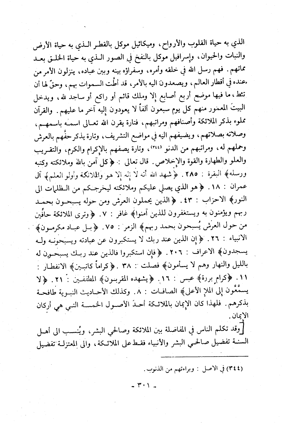 الَّذِي بِهِ حَيَاةُ الْقُلُوبِ وَالْأَرْوَاحِ، وُمِيكَائِيلُ مُوَكَّلٌ بِالْقَطْرِ الَّذِي بِهِ حَيَاةُ الْأَرْضِ وَالنَّبَاتِ وَالْحَيَوَانِ، وَإِسْرَافِيلُ مُوَكَّلٌ بِالنَّفْخِ فِي الصُّوَرِ الَّذِي بِهِ حَيَاةُ الْخَلْقِ بَعْدَ مَمَاتِهِمْ, فَهُمْ رُسُلُ اللَّهِ فِي خَلْقِهِ وَأَمْرِهِ، وَسُفَرَاؤُهُ بَيْنَهُ وَبَيْنَ عِبَادِهِ، يُنْزِلُونَ الْأَمْرَ مِنْ عِنْدِهِ فِي أَقْطَارِ الْعَالَمِ، وَيَصْعَدُونَ إِلَيْهِ بِالْأَمْرِ، قَدْ أَطَّتِ السَّمَاوَاتُ بِهِمْ، وَحُقَّ لَهَا أَنْ تَئِطَّ، مَا فِيهَا مَوْضِعُ أَرْبَعِ أَصَابِعَ إِلَّا وَمَلَكٌ قَائِمٌ أَوْ رَاكِعٌ أَوْ سَاجِدٌ لِلَّهِ، وَيَدْخُلُ الْبَيْتَ الْمَعْمُورَ مِنْهُمْ كُلَّ يَوْمٍ سَبْعُونَ أَلْفًا لَا يَعُودُونَ إِلَيْهِ آخِرَ مَا عَلَيْهِمْ, وَالْقُرْآنُ مَمْلُوءٌ بِذِكْرِ الْمَلَائِكَةِ وَأَصْنَافِهِمْ وَمَرَاتِبِهِمْ، فَتَارَةً يَقْرِنُ اللَّهُ تَعَالَى اسْمَهُ بِاسْمِهِمْ، وَصَلَاتَهُ بِصَلَاتِهِمْ، وَيُضِيفُهُمْ إِلَيْهِ فِي مَوَاضِعِ التَّشْرِيفِ، وَتَارَةً يَذْكُرُ حَفَّهُمْ بِالْعَرْشِ وَحَمْلَهُمْ لَهُ، ومراتبهم من الدنو1، وَتَارَةً يَصِفُهُمْ بِالْإِكْرَامِ وَالْكَرَمِ، وَالتَّقْرِيبِ وَالْعُلُوِّ وَالطَّهَارَةِ وَالْقُوَّةِ وَالْإِخْلَاصِ. قَالَ تَعَالَى: {كُلٌّ آَمَنَ بِاللَّهِ وَمَلَائِكَتِهِ وَكُتُبِهِ وَرُسُلِهِ} [الْبَقَرَةِ: 285]. {شَهِدَ اللَّهُ أَنَّهُ لَا إِلَهَ إِلَّا هُوَ وَالْمَلَائِكَةُ وَأُولُو الْعِلْمِ} [آلِ عِمْرَانَ: 18]. {هُوَ الَّذِي يُصَلِّي عَلَيْكُمْ وَمَلَائِكَتُهُ لِيُخْرِجَكُمْ مِنَ الظُّلُمَاتِ إِلَى النُّورِ}، {الَّذِينَ يَحْمِلُونَ الْعَرْشَ وَمَنْ حَوْلَهُ يُسَبِّحُونَ بِحَمْدِ رَبِّهِمْ وَيُؤْمِنُونَ بِهِ وَيَسْتَغْفِرُونَ لِلَّذِينَ آَمَنُوا} [غَافِرٍ: 7]. {وَتَرَى الْمَلائِكَةَ حَافِّينَ مِنْ حَوْلِ الْعَرْشِ يُسَبِّحُونَ بِحَمْدِ رَبِّهِمْ} [الزُّمَرِ: 75]. {بَلْ عِبَادٌ مُكْرَمُونَ} [الْأَنْبِيَاءِ: 26]. {إِنَّ الَّذِينَ عِنْدَ رَبِّكَ لَا يَسْتَكْبِرُونَ عَنْ عِبَادَتِهِ وَيُسَبِّحُونَهُ وَلَهُ يَسْجُدُونَ} [الْأَعْرَافِ: 206]. {فَإِنِ اسْتَكْبَرُوا فَالَّذِينَ عِنْدَ رَبِّكَ يُسَبِّحُونَ لَهُ بِاللَّيْلِ وَالنَّهَارِ وَهُمْ لَا يَسْأَمُونَ} [فُصِّلَتْ: 38]. {كِرَامًا كَاتِبِينَ} [الِانْفِطَارِ: 11]. {كِرَامٍ بَرَرَةَ} [عيسى: 16]. {يَشْهَدُهُ الْمُقَرَّبُونَ} [الْمُطَفِّفِينَ: 21]. {لَا يَسَّمَّعُونَ إِلَى الْمَلَإِ الْأَعْلَى} [الصَّافَّاتِ: 8]. وَكَذَلِكَ الْأَحَادِيثُ النَّبَوِيَّةُ طَافِحَةٌ بِذِكْرِهِمْ, فَلِهَذَا كَانَ الْإِيمَانُ بِالْمَلَائِكَةِ أَحَدَ الْأُصُولِ الْخَمْسَةِ الَّتِي هِيَ أَرْكَانُ الْإِيمَانِ.