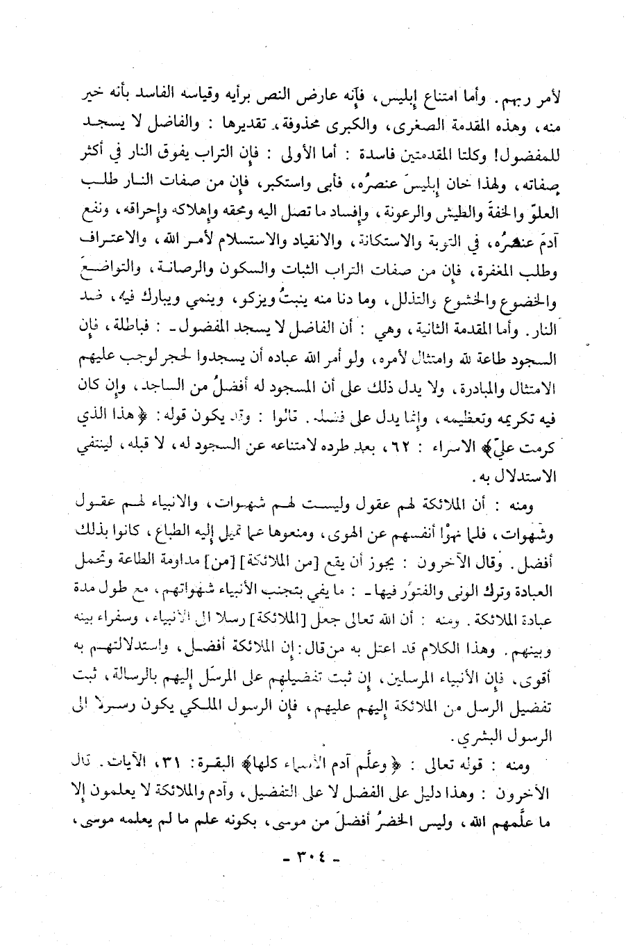 وَمِنْهُ: قوله تعالى: {وَعَلَّمَ آَدَمَ الْأَسْمَاءَ كُلَّهَا} [البقرة: 31]، الآيات. قَالَ الْآخِرُونَ: وَهَذَا دَلِيلٌ عَلَى الْفَضْلِ لَا عَلَى التَّفْضِيلِ، وَآدَمُ وَالْمَلَائِكَةُ لَا يَعْلَمُونَ إِلَّا مَا عَلَّمَهُمُ اللَّهُ، وَلَيْسَ الْخَضِرُ أَفْضَلَ مِنْ موسى، بكونه عالم مَا لَمْ يَعْلَمْهُ مُوسَى،