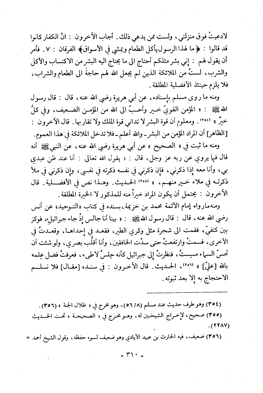 وَمِنْهُ مَا رَوَى مُسْلِمٌ بِإِسْنَادِهِ، عَنْ أَبِي هُرَيْرَةَ رَضِيَ اللَّهُ عَنْهُ، قَالَ: قَالَ رَسُولُ اللَّهِ صَلَّى اللَّهُ عَلَيْهِ وَسَلَّمَ: "الْمُؤْمِنُ الْقَوِيُّ خَيْرٌ وَأَحَبُّ إِلَى اللَّهِ مِنَ الْمُؤْمِنِ الضَّعِيفِ، وَفِي كُلٍّ خَيْرٌ" 1. وَمَعْلُومٌ أَنَّ قُوَّةَ الْبَشَرِ لَا تُدَانِي قُوَّةَ الْمَلَكِ وَلَا تُقَارِبُهَا. قَالَ الْآخِرُونَ. [الظَّاهِرُ] أَنَّ الْمُرَادَ الْمُؤْمِنُ مِنَ الْبَشَرِ -وَاللَّهُ أَعْلَمُ- فَلَا تَدْخُلُ الْمَلَائِكَةُ فِي هَذَا الْعُمُومِ.