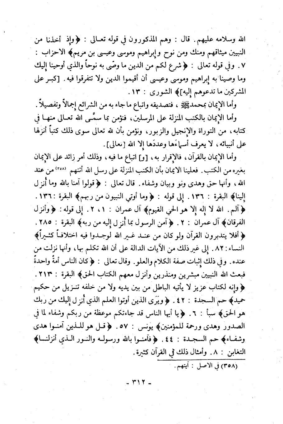 وَأَمَّا الْإِيمَانُ بِالْقُرْآنِ، فَالْإِقْرَارُ به، [و] اتباع مَا فِيهِ، وَذَلِكَ أَمْرٌ زَائِدٌ عَلَى الْإِيمَانِ بِغَيْرِهِ مِنَ الْكُتُبِ, فَعَلَيْنَا الْإِيمَانُ بِأَنَّ الْكُتُبَ الْمُنَزَّلَةَ عَلَى رُسُلِ اللَّهِ أَتَتْهُمْ1 مِنَ عِنْدِ اللَّهِ، وَأَنَّهَا حَقٌّ وَهُدًى وَنُورٌ وَبَيَانٌ وَشِفَاءٌ. قَالَ تَعَالَى: {قُولُوا آَمَنَّا بِاللَّهِ وَمَا أُنْزِلَ إِلَيْنَا} [البقرة: 136]. إِلَى قَوْلِهِ: {وَمَا أُوتِيَ النَّبِيُّونَ مِنْ رَبِّهِمْ} [الْبَقَرَةِ: 136]. {الم، اللَّهُ لَا إِلَهَ إِلَّا هُوَ الْحَيُّ الْقَيُّومُ} [آل عمران: 1، 2]. إِلَى قَوْلِهِ: {وَأَنْزَلَ الْفُرْقَانَ} [آلِ عِمْرَانَ: 2]. {آَمَنَ الرَّسُولُ بِمَا أُنْزِلَ إِلَيْهِ مِنْ رَبِّهِ} [الْبَقَرَةِ: 285]. {أَفَلَا يَتَدَبَّرُونَ الْقُرْآَنَ وَلَوْ كَانَ مِنْ عِنْدِ غَيْرِ اللَّهِ لَوَجَدُوا فِيهِ اخْتِلَافًا كَثِيرًا} [النِّسَاءِ: 82]. إِلَى غَيْرِ ذَلِكَ مِنَ الْآيَاتِ الدَّالَّةِ عَلَى أَنَّ اللَّهَ تَكَلَّمَ بِهَا، وَأَنَّهَا نَزَلَتْ مِنْ عِنْدِهِ, وَفِي ذَلِكَ إِثْبَاتُ صِفَةِ الْكَلَامِ وَالْعُلُوِّ, وَقَالَ تَعَالَى: {كَانَ النَّاسُ أُمَّةً وَاحِدَةً فَبَعَثَ اللَّهُ النَّبِيِّينَ مُبَشِّرِينَ وَمُنْذِرِينَ وَأَنْزَلَ مَعَهُمُ الْكِتَابَ بِالْحَقِّ} [الْبَقَرَةِ: 213]. {وَإِنَّهُ لَكِتَابٌ عَزِيزٌ، لَا يَأْتِيهِ الْبَاطِلُ مِنْ بَيْنِ يَدَيْهِ وَلا مِنْ خَلْفِهِ تَنْزِيلٌ مِنْ حَكِيمٍ حَمِيدٍ} [حم السجدة: 42]. {وَيَرَى الَّذِينَ أُوتُوا الْعِلْمَ الَّذِي أُنْزِلَ إِلَيْكَ مِنْ رَبِّكَ هُوَ الْحَقَّ} [سَبَأٍ: 6]. {يَا أَيُّهَا النَّاسُ قَدْ جَاءَتْكُمْ مَوْعِظَةٌ مِنْ رَبِّكُمْ وَشِفَاءٌ لِمَا فِي الصُّدُورِ وَهُدًى وَرَحْمَةٌ لِلْمُؤْمِنِينَ} [يُونُسَ: 57]. {قُلْ هُوَ لِلَّذِينَ آَمَنُوا هُدًى وَشِفَاءٌ} [حم السجدة: 44]. {فَآَمِنُوا بِاللَّهِ وَرَسُولِهِ وَالنُّورِ الَّذِي أَنْزَلْنَا} [التَّغَابُنِ: 8]. وأمثال ذلك في القرآن كثيرة.