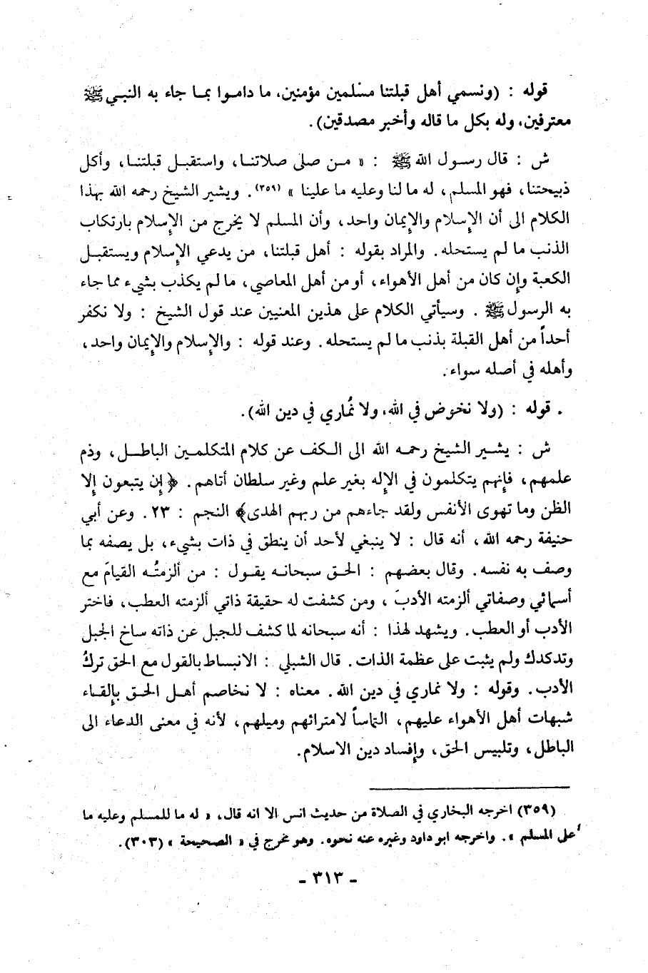 ش: قَالَ رَسُولُ اللَّهِ صَلَّى اللَّهُ عَلَيْهِ وَسَلَّمَ: "مَنْ صَلَّى صَلَاتَنَا، وَاسْتَقْبَلَ قِبْلَتَنَا، وَأَكَلَ ذَبِيحَتَنَا، فَهُوَ الْمُسْلِمُ، لَهُ مَا لَنَا وَعَلَيْهِ مَا عَلَيْنَا" 1. وَيُشِيرُ الشَّيْخُ رَحِمَهُ اللَّهُ بِهَذَا الْكَلَامِ إِلَى أَنَّ الْإِسْلَامَ وَالْإِيمَانَ وَاحِدٌ، وَأَنَّ الْمُسْلِمَ لَا يَخْرُجُ مِنَ الْإِسْلَامِ بِارْتِكَابِ الذَّنْبِ مَا لَمْ يَسْتَحِلَّهُ. وَالْمُرَادُ بِقَوْلِهِ: أَهْلَ قِبْلَتِنَا، مَنْ يَدَّعِي الْإِسْلَامَ وَيَسْتَقْبِلُ الْكَعْبَةَ وَإِنْ كَانَ مِنْ أَهْلِ الْأَهْوَاءِ، أَوْ مِنْ أَهْلِ الْمَعَاصِي، مَا لَمْ يُكَذِّبْ بِشَيْءٍ مِمَّا جَاءَ بِهِ الرَّسُولُ صَلَّى اللَّهُ عَلَيْهِ وَسَلَّمَ, وَسَيَأْتِي الْكَلَامُ عَلَى هَذَيْنِ الْمَعْنَيَيْنِ عِنْدَ قَوْلِ الشَّيْخِ: وَلَا نُكَفِّرُ أَحَدًا مِنْ أَهْلِ الْقِبْلَةِ بِذَنْبٍ مَا لَمْ يَسْتَحِلَّهُ. وَعِنْدَ قَوْلِهِ: وَالْإِسْلَامُ وَالْإِيمَانُ وَاحِدٌ، وَأَهْلُهُ فِي أَصْلِهِ سَوَاءٌ.