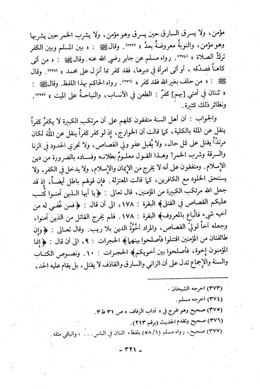 وَالْجَوَابُ: أَنَّ أَهْلَ السُّنَّةِ مُتَّفِقُونَ كُلُّهُمْ عَلَى أَنَّ مُرْتَكِبَ الْكَبِيرَةِ لَا يَكْفُرُ كُفْرًا يَنْقُلُ عَنِ الْمِلَّةِ بِالْكُلِّيَّةِ، كَمَا قَالَتِ الْخَوَارِجُ، إِذْ لَوْ كَفَرَ كُفْرًا يَنْقُلُ عَنِ الْمِلَّةِ لَكَانَ مُرْتَدًّا يُقْتَلُ عَلَى كُلِّ حَالٍ، وَلَا يُقْبَلُ عَفْوُ وَلِيِّ الْقِصَاصِ، وَلَا تَجْرِي الْحُدُودُ فِي الزِّنَا وَالسَّرِقَةِ وَشُرْبِ الْخَمْرِ! وَهَذَا الْقَوْلُ مَعْلُومٌ بُطْلَانُهُ وَفَسَادُهُ بِالضَّرُورَةِ مِنْ دِينِ الْإِسْلَامِ, وَمُتَّفِقُونَ عَلَى أَنَّهُ لَا يَخْرُجُ مِنَ الْإِيمَانِ وَالْإِسْلَامِ، وَلَا يَدْخُلُ فِي الْكُفْرِ، وَلَا يَسْتَحِقُّ الْخُلُودَ مَعَ الْكَافِرِينَ، كَمَا قَالَتِ الْمُعْتَزِلَةُ. فَإِنَّ قَوْلَهُمْ بَاطِلٌ أَيْضًا، إِذْ قَدْ جَعَلَ اللَّهُ مُرْتَكِبَ الْكَبِيرَةِ مِنَ الْمُؤْمِنِينَ، قَالَ تَعَالَى: {يَا أَيُّهَا الَّذِينَ آَمَنُوا كُتِبَ عَلَيْكُمُ الْقِصَاصُ فِي الْقَتْلَى} [الْبَقَرَةِ: 178]، إِلَى أَنْ قَالَ: {فَمَنْ عُفِيَ لَهُ مِنْ أَخِيهِ شَيْءٌ فَاتِّبَاعٌ بِالْمَعْرُوفِ} [الْبَقَرَةِ: 178]. فَلَمْ يُخْرِجِ الْقَاتِلَ مِنَ الَّذِينَ آمَنُوا، وَجَعَلَهُ أَخًا لِوَلِيِّ الْقِصَاصِ، وَالْمُرَادُ أُخُوَّةُ الدِّينِ بِلَا رَيْبٍ. وَقَالَ تَعَالَى: {وَإِنْ طَائِفَتَانِ مِنَ الْمُؤْمِنِينَ اقْتَتَلُوا فَأَصْلِحُوا بَيْنَهُمَا} [الْحُجُرَاتِ: 9]، إِلَى أَنْ قَالَ: {إِنَّمَا الْمُؤْمِنُونَ إِخْوَةٌ فَأَصْلِحُوا بَيْنَ أَخَوَيْكُمْ} [الْحُجُرَاتِ: 10]. وَنُصُوصُ الْكِتَابِ وَالسُّنَّةِ وَالْإِجْمَاعُ تَدُلُّ عَلَى أَنَّ الزَّانِيَ وَالسَّارِقَ وَالْقَاذِفَ لَا يُقْتَلُ، بَلْ يُقَامُ عَلَيْهِ الْحَدُّ،
