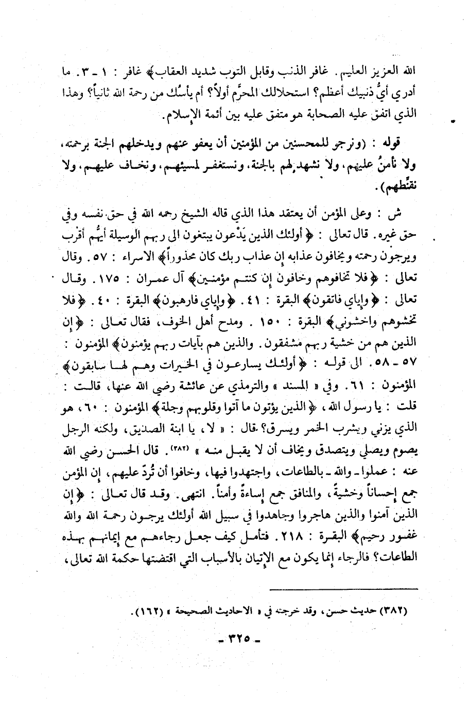 ش: وَعَلَى الْمُؤْمِنِ أَنْ يَعْتَقِدَ هَذَا الَّذِي قَالَهُ الشَّيْخُ رَحِمَهُ اللَّهُ فِي حَقِّ نَفْسِهِ وَفِي حَقِّ غَيْرِهِ. قَالَ تَعَالَى: {أُولَئِكَ الَّذِينَ يَدْعُونَ يَبْتَغُونَ إِلَى رَبِّهِمُ الْوَسِيلَةَ أَيُّهُمْ أَقْرَبُ وَيَرْجُونَ رَحْمَتَهُ وَيَخَافُونَ عَذَابَهُ إِنَّ عَذَابَ رَبِّكَ كَانَ مَحْذُورًا} [الْإِسْرَاءِ: 57]. وَقَالَ تَعَالَى: {فَلَا تَخَافُوهُمْ وَخَافُونِ إِنْ كُنْتُمْ مُؤْمِنِينَ} [آلِ عِمْرَانَ: 175]. وَقَالَ تَعَالَى: {وَإِيَّايَ فَاتَّقُونِ} [البقرة: 41]. {وَإِيَّايَ فَارْهَبُونِ} [البقرة: 40]. {فَلَا تَخْشَوْهُمْ وَاخْشَوْنِي} [البقرة:150]. وَمَدَحَ أَهْلَ الْخَوْفِ، فَقَالَ تَعَالَى: {إِنَّ الَّذِينَ هُمْ مِنْ خَشْيَةِ رَبِّهِمْ مُشْفِقُونَ، وَالَّذِينَ هُمْ بِآَيَاتِ رَبِّهِمْ يُؤْمِنُونَ} [المؤمنون: 57 - 58]. إلى قوله: {أُولَئِكَ يُسَارِعُونَ فِي الْخَيْرَاتِ وَهُمْ لَهَا سَابِقُونَ} [الْمُؤْمِنُونَ: 61]. وَفِي الْمُسْنَدِ وَالتِّرْمِذِيِّ عَنْ عَائِشَةَ رَضِيَ اللَّهُ عَنْهَا، قَالَتْ: قُلْتُ: يَا رَسُولَ اللَّهِ، {الَّذِينَ يُؤْتُونَ مَا آَتَوْا وَقُلُوبُهُمْ وَجِلَة} [الْمُؤْمِنُونَ: 60]، هو الَّذِي يَزْنِي وَيَشْرَبُ الْخَمْرَ وَيَسْرِقُ؟ قَالَ: "لَا، يَا ابْنَةَ الصِّدِّيقِ، وَلَكِنَّهُ الرَّجُلُ يَصُومُ وَيُصَلِّي وَيَتَصَدَّقُ وَيَخَافُ أَنْ لَا يُقْبَلَ مِنْهُ" 1. قَالَ الْحَسَنُ رَضِيَ اللَّهُ عَنْهُ: عَمِلُوا -وَاللَّهِ- بِالطَّاعَاتِ، وَاجْتَهَدُوا فِيهَا، وَخَافُوا أَنْ تُرَدَّ عَلَيْهِمْ، إِنَّ الْمُؤْمِنَ جَمَعَ إِحْسَانًا وَخَشْيَةً، وَالْمُنَافِقَ جَمَعَ إِسَاءَةً وَأَمْنًا. انْتَهَى. وَقَدْ قَالَ تَعَالَى: {إِنَّ الَّذِينَ آَمَنُوا وَالَّذِينَ هَاجَرُوا وَجَاهَدُوا فِي سَبِيلِ اللَّهِ أُولَئِكَ يَرْجُونَ رَحْمَتَ اللَّهِ وَاللَّهُ غَفُورٌ رَحِيمٌ} [الْبَقَرَةِ: 218] , فَتَأَمَّلْ كَيْفَ جَعَلَ رَجَاءَهُمْ مَعَ إِيمَانِهِمْ بِهَذِهِ الطَّاعَاتِ؟ فَالرَّجَاءُ إِنَّمَا يَكُونُ مَعَ الْإِتْيَانِ بِالْأَسْبَابِ الَّتِي اقْتَضَتْهَا حكمة الله تعالى،