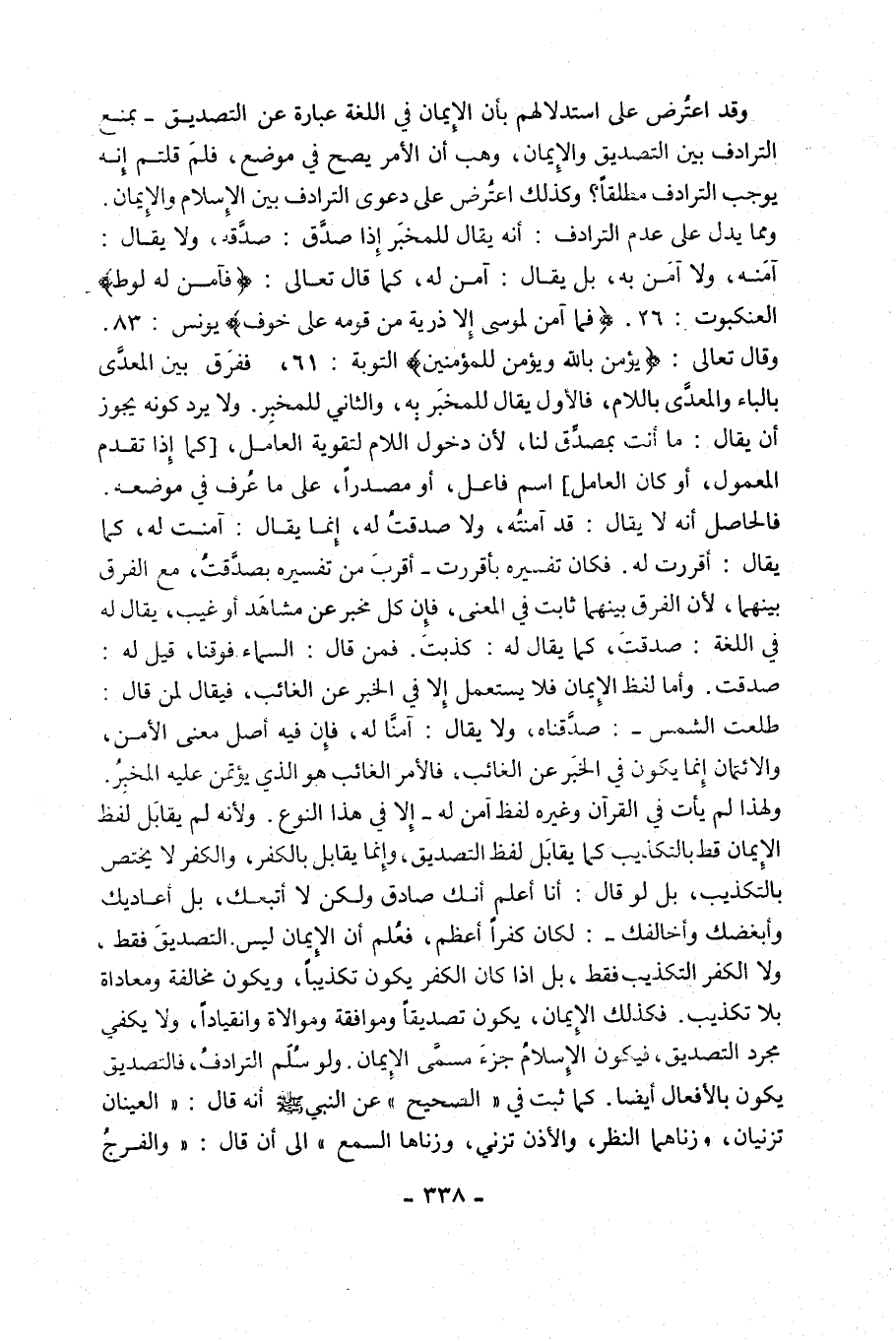 وَقَدِ اعْتُرِضَ عَلَى اسْتِدْلَالِهِمْ بِأَنَّ الْإِيمَانَ فِي اللُّغَةِ عِبَارَةٌ عَنِ التَّصْدِيقِ بِمَنْعِ التَّرَادُفِ بَيْنَ التَّصْدِيقِ وَالْإِيمَانِ، وَهَبْ أَنَّ الْأَمْرَ يَصِحُّ فِي مَوْضِعٍ، فَلِمَ قُلْتُمْ إِنَّهُ يُوجِبُ التَّرَادُفَ مُطْلَقًا؟ وَكَذَلِكَ اعْتُرِضَ عَلَى دَعْوَى التَّرَادُفِ بَيْنَ الْإِسْلَامِ وَالْإِيمَانِ, وَمِمَّا يَدُلُّ عَلَى عَدَمِ التَّرَادُفِ: أَنَّهُ يُقَالُ لِلْمُخْبَرِ إِذَا صَدَّقَ: صَدَّقَهُ، وَلَا يُقَالُ: آمَنَهُ، وَلَا آمَنَ بِهِ، بَلْ يُقَالُ: آمَنَ لَهُ، كَمَا قَالَ تَعَالَى: {فَآَمَنَ لَهُ لُوطٌ} [الْعَنْكَبُوتِ: 26]. {فَمَا آَمَنَ لِمُوسَى إِلَّا ذُرِّيَّةٌ مِنْ قَوْمِهِ عَلَى خَوْفٍ} [يُونُسَ: 83]. وَقَالَ تَعَالَى: {يُؤْمِنُ بِاللَّهِ وَيُؤْمِنُ لِلْمُؤْمِنِينَ} [التَّوْبَةِ: 61]، فَفَرَّقَ بَيْنَ الْمُعَدَّى بِالْبَاءِ وَالْمُعَدَّى بِاللَّامِ، فَالْأَوَّلُ يُقَالُ لِلْمُخْبَرِ بِهِ، وَالثَّانِي لِلْمُخْبِرِ. وَلَا يَرِدُ كَوْنُهُ يَجُوزُ أَنْ يُقَالَ: مَا أَنْتَ بِمُصَدِّقٍ لَنَا؛ لِأَنَّ دُخُولَ اللَّامِ لِتَقْوِيَةِ الْعَامِلِ، [كَمَا إِذَا تَقَدَّمَ الْمَعْمُولُ، أَوْ كَانَ الْعَامِلُ] اسْمَ فَاعِلٍ، أَوْ مَصْدَرًا، عَلَى مَا عُرِفَ في موضعه, فالحاصل أنه لا يقال: قَدْ آمَنْتُهُ، وَلَا صَدَّقْتُ لَهُ، إِنَّمَا يُقَالُ: آمَنْتُ لَهُ، كَمَا يُقَالُ: أَقْرَرْتُ لَهُ. فَكَانَ تَفْسِيرُهُ بِأَقْرَرْتُ, أَقْرَبَ مِنْ تَفْسِيرِهِ بِصَدَّقْتُ، مَعَ الْفَرْقِ بَيْنَهُمَا؛ لِأَنَّ الْفَرْقَ بَيْنَهُمَا ثَابِتٌ فِي المعنى، فإن كل مخبر عن مشاهد أَوْ غَيْبٍ، يُقَالُ لَهُ فِي اللُّغَةِ: صَدَقْتَ، كَمَا يُقَالُ لَهُ: كَذَبْتَ. فَمَنْ قَالَ: السَّمَاءُ فَوْقَنَا، قِيلَ لَهُ: صَدَقْتَ. وَأَمَّا لَفْظُ الْإِيمَانِ فَلَا يُسْتَعْمَلُ إِلَّا فِي الْخَبَرِ عَنِ الْغَائِبِ، فَيُقَالُ لِمَنْ قَالَ: طَلَعَتِ الشَّمْسُ: صَدَّقْنَاهُ، وَلَا يُقَالُ: آمَنَّا لَهُ، فَإِنَّ فِيهِ أَصْلَ مَعْنَى الْأَمْنِ، وَالِائْتِمَانُ إِنَّمَا يَكُونُ فِي الْخَبَرِ عَنِ الْغَائِبِ، فَالْأَمْرُ الْغَائِبُ هُوَ الَّذِي يُؤْتَمَنُ عَلَيْهِ الْمُخْبِرُ, وَلِهَذَا لَمْ يَأْتِ فِي الْقُرْآنِ وَغَيْرِهِ لَفْظُ آمَنَ لَهُ, إِلَّا فِي هَذَا النَّوْعِ, وَلِأَنَّهُ لَمْ يُقَابَلْ لَفْظُ الْإِيمَانِ قَطُّ بِالتَّكْذِيبِ كَمَا يُقَابَلُ لَفْظُ التَّصْدِيقِ، وَإِنَّمَا يُقَابَلُ بِالْكُفْرِ، وَالْكُفْرُ لَا يَخْتَصُّ بِالتَّكْذِيبِ، بَلْ لَوْ قَالَ: أَنَا أَعْلَمُ أَنَّكَ صَادِقٌ وَلَكِنْ لَا أَتَّبِعُكَ، بل أعاديك وأبغضك وأخالفك: لكان كفرا أعظم، فعلم أن الايمان ليس التصديق فقط، ولا الكفر التَّكْذِيبَ فَقَطْ، بَلْ إِذَا كَانَ الْكُفْرُ يَكُونُ تَكْذِيبًا، وَيَكُونُ مُخَالَفَةً وَمُعَادَاةً بِلَا تَكْذِيبٍ, فَكَذَلِكَ الْإِيمَانُ، يَكُونُ تَصْدِيقًا وَمُوَافَقَةً وَانْقِيَادًا، وَلَا يَكْفِي مُجَرَّدُ التَّصْدِيقِ، فَيَكُونُ الْإِسْلَامُ جُزْءَ مُسَمَّى الْإِيمَانِ. وَلَوْ سُلِّمَ التَّرَادُفُ، فَالتَّصْدِيقُ يَكُونُ بِالْأَفْعَالِ أَيْضًا. كَمَا ثَبَتَ فِي الصَّحِيحِ عَنِ النَّبِيِّ صَلَّى اللَّهُ عَلَيْهِ وَسَلَّمَ أَنَّهُ قَالَ: "الْعَيْنَانِ تَزْنِيَانِ، وَزِنَاهُمَا النَّظَرُ، وَالْأُذُنُ تَزْنِي، وَزِنَاهَا السَّمْعُ" , إِلَى أَنْ قَالَ: "وَالْفَرْجُ