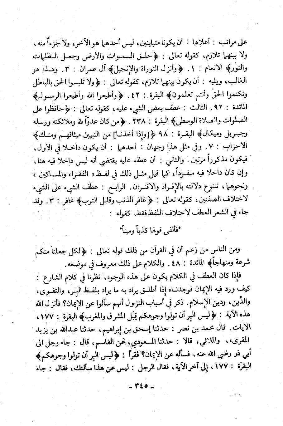 فَإِذَا كَانَ الْعَطْفُ فِي الْكَلَامِ يَكُونُ عَلَى هَذِهِ الْوُجُوهِ، نَظَرْنَا فِي كَلَامِ الشَّارِعِ: كَيْفَ وَرَدَ فِيهِ الْإِيمَانُ فَوَجَدْنَاهُ إِذَا أُطْلِقَ يُرَادُ بِهِ مَا يُرَادُ بِلَفْظِ الْبِرِّ، وَالتَّقْوَى، وَالدِّينِ، وَدِينِ الْإِسْلَامِ. ذُكِرَ فِي أَسْبَابِ النُّزُولِ أَنَّهُمْ سَأَلُوا عَنِ الْإِيمَانِ؟ فَأَنْزَلَ اللَّهُ هَذِهِ الْآيَةَ: {لَيْسَ الْبِرَّ أَنْ تُوَلُّوا وُجُوهَكُمْ قِبَلَ الْمَشْرِقِ وَالْمَغْرِبِ} [البقرة: 177] الآيات. قَالَ مُحَمَّدُ بْنُ نَصْرٍ: حَدَّثَنَا إِسْحَاقُ بْنُ إِبْرَاهِيمَ، حَدَّثَنَا عَبْدُ اللَّهِ بْنُ يَزِيدَ الْمُقْرِئُ، وَالْمُلَائِيُّ، قَالَا: حَدَّثَنَا الْمَسْعُودِيُّ، عَنِ الْقَاسِمِ، قَالَ: جَاءَ رَجُلٌ إِلَى أَبِي ذَرٍّ رَضِيَ اللَّهُ عَنْهُ، فَسَأَلَهُ عَنِ الْإِيمَانِ؟ فَقَرَأَ: {لَيْسَ الْبِرَّ أَنْ تُوَلُّوا وُجُوهَكُمْ} [البقرة: 177] إلى آخر الآية، فَقَالَ الرَّجُلُ: لَيْسَ عَنْ هَذَا سَأَلْتُكَ، فَقَالَ: جاء