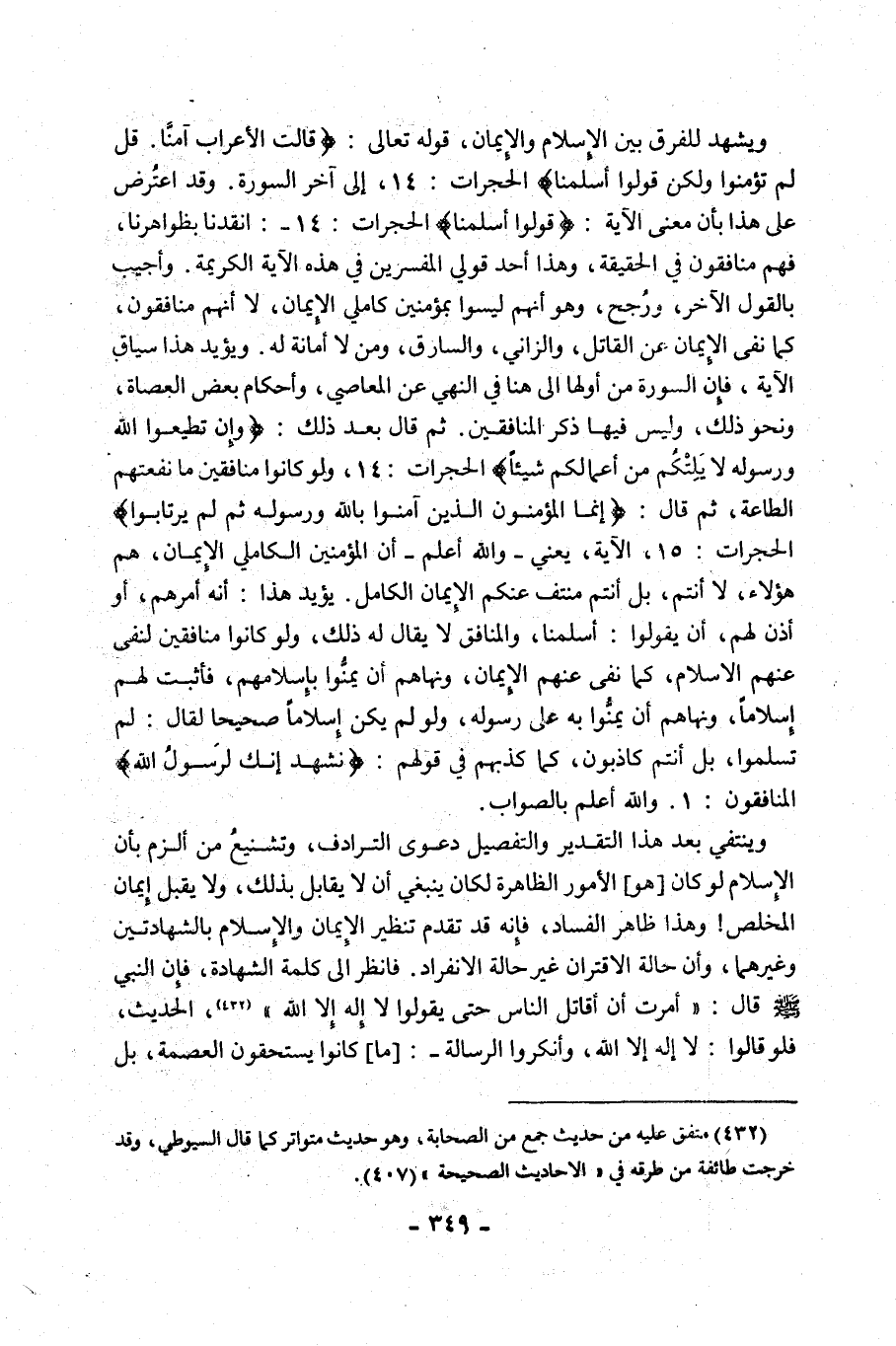 وَيَشْهَدُ لِلْفَرْقِ بَيْنَ الْإِسْلَامِ وَالْإِيمَانِ، قَوْلُهُ تَعَالَى: {قَالَتِ الْأَعْرَابُ آَمَنَّا قُلْ لَمْ تُؤْمِنُوا وَلَكِنْ قُولُوا أَسْلَمْنَا} [الْحُجُرَاتِ: 14] إِلَى آخِرِ السُّورَةِ, وَقَدِ اعْتُرِضَ عَلَى هَذَا بِأَنَّ مَعْنَى الْآيَةِ: {قُولُوا أَسْلَمْنَا} [الحجرات: 14]: انْقَدْنَا بِظَوَاهِرِنَا، فَهُمْ مُنَافِقُونَ فِي الْحَقِيقَةِ، وَهَذَا أَحَدُ قَوْلَيِ الْمُفَسِّرِينَ فِي هَذِهِ الْآيَةِ الْكَرِيمَةِ, وَأُجِيبُ بِالْقَوْلِ الْآخَرِ، وَرُجِّحَ، وَهُوَ أَنَّهُمْ لَيْسُوا بِمُؤْمِنِينَ كَامِلِي الْإِيمَانِ، لَا أَنَّهُمْ مُنَافِقُونَ، كَمَا نَفَى الْإِيمَانَ عَنِ الْقَاتِلِ، وَالزَّانِي، وَالسَّارِقِ، وَمَنْ لا أمانة له. ويؤيد هذا سياق الآية، فَإِنَّ السُّورَةَ مِنْ أَوَّلِهَا إِلَى هُنَا فِي النَّهْيِ عَنِ الْمَعَاصِي، وَأَحْكَامِ بَعْضِ الْعُصَاةِ، وَنَحْوِ ذَلِكَ، وَلَيْسَ فِيهَا ذِكْرُ الْمُنَافِقِينَ. ثُمَّ قَالَ بَعْدَ ذَلِكَ: {وَإِنْ تُطِيعُوا اللَّهَ وَرَسُولَهُ لَا يَلِتْكُمْ مِنْ أَعْمَالِكُمْ شَيْئًا} [الْحُجُرَاتِ: 14]، وَلَوْ كَانُوا مُنَافِقِينَ مَا نَفَعَتْهُمُ الطَّاعَةُ، ثُمَّ قَالَ: {إِنَّمَا الْمُؤْمِنُونَ الَّذِينَ آَمَنُوا بِاللَّهِ وَرَسُولِهِ ثُمَّ لَمْ يَرْتَابُوا} [الْحُجُرَاتِ: 15] الْآيَةَ، يَعْنِي -وَاللَّهُ أَعْلَمُ- أَنَّ الْمُؤْمِنِينَ الْكَامِلِي الْإِيمَانِ، هُمْ هَؤُلَاءِ، لَا أَنْتُمْ، بَلْ أَنْتُمْ مُنْتَفٍ عَنْكُمُ الْإِيمَانُ الْكَامِلُ, يُؤَيِّدُ هَذَا: أَنَّهُ أَمَرَهُمْ، أَوْ أَذِنَ لَهُمْ، أَنْ يَقُولُوا: أَسْلَمْنَا، وَالْمُنَافِقُ لَا يُقَالُ لَهُ ذَلِكَ، وَلَوْ كَانُوا مُنَافِقِينَ لَنَفَى عَنْهُمُ الْإِسْلَامَ، كَمَا نَفَى عَنْهُمُ الْإِيمَانَ، وَنَهَاهُمْ أَنْ يَمُنُّوا بِإِسْلَامِهِمْ، فَأَثْبَتَ لَهُمْ إِسْلَامًا، وَنَهَاهُمْ أَنْ يَمُنُّوا بِهِ عَلَى رَسُولِهِ، وَلَوْ لَمْ يَكُنْ إِسْلَامًا صَحِيحًا لَقَالَ: لَمْ تُسْلِمُوا، بَلْ أَنْتُمْ كَاذِبُونَ، كَمَا كَذَّبَهُمْ فِي قَوْلِهِمْ: {نَشْهَدُ إِنَّكَ لَرَسُولُ اللَّهِ} [الْمُنَافِقُونَ: 1]. وَاللَّهُ أَعْلَمُ بِالصَّوَابِ.