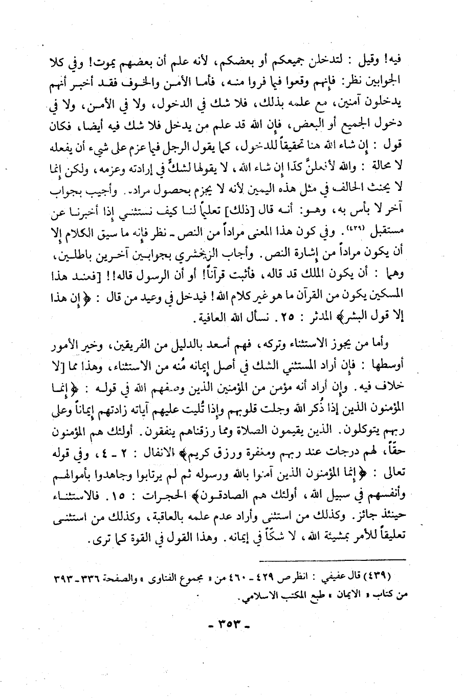 وَأَمَّا مَنْ يُجَوِّزُ الِاسْتِثْنَاءَ وَتَرْكَهُ، فَهُمْ أَسْعَدُ بِالدَّلِيلِ مِنَ الْفَرِيقَيْنِ، وَخَيْرُ الْأُمُورِ أَوْسَطُهَا: فَإِنْ أراد المستثني الشك في أصل إيمانه منه مِنْ الِاسْتِثْنَاءِ، وَهَذَا مِمَّا لَا خِلَافَ فِيهِ, وَإِنْ أَرَادَ أَنَّهُ مُؤْمِنٌ مِنَ الْمُؤْمِنِينَ الَّذِينَ وَصَفَهُمُ اللَّهُ فِي قَوْلِهِ: {إِنَّمَا الْمُؤْمِنُونَ الَّذِينَ إِذَا ذُكِرَ اللَّهُ وَجِلَتْ قُلُوبُهُمْ وَإِذَا تُلِيَتْ عَلَيْهِمْ آَيَاتُهُ زَادَتْهُمْ إِيمَانًا وَعَلَى رَبِّهِمْ يَتَوَكَّلُونَ، الَّذِينَ يُقِيمُونَ الصَّلَاةَ وَمِمَّا رَزَقْنَاهُمْ يُنْفِقُونَ، أُولَئِكَ هُمُ الْمُؤْمِنُونَ حَقًّا لَهُمْ دَرَجَاتٌ عِنْدَ رَبِّهِمْ وَمَغْفِرَةٌ وَرِزْقٌ كَرِيمٌ} [الْأَنْفَالِ 2 - 4]، وَفِي قَوْلِهِ تَعَالَى: {إِنَّمَا الْمُؤْمِنُونَ الَّذِينَ آَمَنُوا بِاللَّهِ وَرَسُولِهِ ثُمَّ لَمْ يَرْتَابُوا وَجَاهَدُوا بِأَمْوَالِهِمْ وَأَنْفُسِهِمْ فِي سَبِيلِ اللَّهِ أُولَئِكَ هُمُ الصَّادِقُونَ} [الْحُجُرَاتِ: 15]. فَالِاسْتِثْنَاءُ حِينَئِذٍ جَائِزٌ, وَكَذَلِكَ مَنِ اسْتَثْنَى وَأَرَادَ عَدَمَ عِلْمِهِ بِالْعَاقِبَةِ، وَكَذَلِكَ مَنِ اسْتَثْنَى تَعْلِيقًا لِلْأَمْرِ بِمَشِيئَةِ اللَّهِ، لَا شَكًّا فِي إِيمَانِهِ, وَهَذَا الْقَوْلُ في القوة كما ترى.
