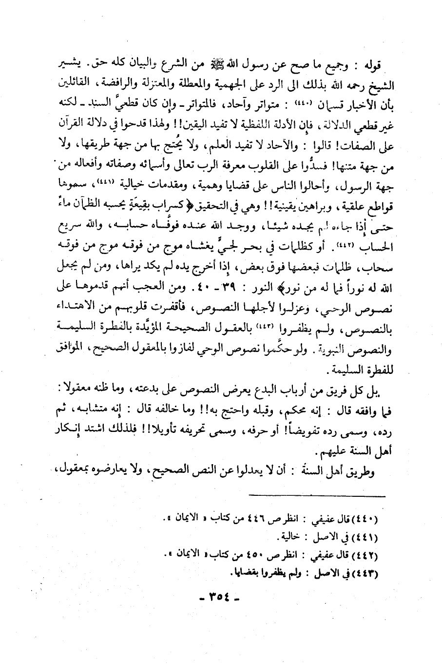 قَوْلُهُ: وَجَمِيعُ مَا صَحَّ عَنْ رَسُولِ اللَّهِ صَلَّى اللَّهُ عَلَيْهِ وَسَلَّمَ مِنَ الشَّرْعِ وَالْبَيَانِ كُلُّهُ حَقٌّ, يُشِيرُ الشَّيْخُ رَحِمَهُ اللَّهُ بِذَلِكَ إِلَى الرَّدِّ عَلَى الْجَهْمِيَّةِ وَالْمُعَطِّلَةِ وَالْمُعْتَزِلَةِ وَالرَّافِضَةِ، الْقَائِلِينَ بِأَنَّ الْأَخْبَارَ قِسْمَانِ1: مُتَوَاتِرٌ وَآحَادٌ، فَالْمُتَوَاتِرُ, وَإِنْ كَانَ قَطْعِيَّ السَّنَدِ, لَكِنَّهُ غَيْرُ قَطْعِيِّ الدِّلَالَةِ، فَإِنَّ الْأَدِلَّةَ اللَّفْظِيَّةَ لَا تُفِيدُ الْيَقِينَ!! وَلِهَذَا قَدَحُوا فِي دِلَالَةِ الْقُرْآنِ عَلَى الصِّفَاتِ! قَالُوا: وَالْآحَادُ لَا تُفِيدُ الْعِلْمَ، وَلَا يُحْتَجُّ بِهَا مِنْ جِهَةِ طَرِيقِهَا، وَلَا مِنْ جِهَةِ مَتْنِهَا! فَسَدُّوا عَلَى الْقُلُوبِ مَعْرِفَةَ الرَّبِّ تَعَالَى وَأَسْمَائِهِ وَصِفَاتِهِ وَأَفْعَالِهِ مِنْ جِهَةِ الرَّسُولِ، وَأَحَالُوا النَّاسَ عَلَى قَضَايَا وَهْمِيَّةٍ، وَمُقَدِّمَاتٍ خَيَالِيَّةٍ2، سَمَّوْهَا قواطع علقية، وَبَرَاهِينَ يَقِينِيَّةً!! وَهِيَ فِي التَّحْقِيقِ {كَسَرَابٍ بِقِيعَةٍ يَحْسَبُهُ الظَّمْآَنُ مَاءً حَتَّى إِذَا جَاءَهُ لَمْ يَجِدْهُ شَيْئًا وَوَجَدَ اللَّهَ عِنْدَهُ فَوَفَّاهُ حِسَابَهُ وَاللَّهُ سَرِيعُ الْحِسَابِ 3، أَوْ كَظُلُمَاتٍ فِي بَحْرٍ لُجِّيٍّ يَغْشَاهُ مَوْجٌ مِنْ فَوْقِهِ مَوْجٌ مِنْ فَوْقِهِ سَحَابٌ ظُلُمَاتٌ بَعْضُهَا فَوْقَ بَعْضٍ إِذَا أَخْرَجَ يَدَهُ لَمْ يَكَدْ يَرَاهَا وَمَنْ لَمْ يَجْعَلِ اللَّهُ لَهُ نُورًا فَمَا لَهُ مِنْ نُورٍ} [النُّورِ: 39, 40]. وَمِنَ الْعَجَبِ أَنَّهُمْ قَدَّمُوهَا عَلَى نُصُوصِ الْوَحْيِ، وَعَزَلُوا لِأَجْلِهَا النُّصُوصَ، فَأَقْفَرَتْ قُلُوبُهُمْ مِنْ الِاهْتِدَاءِ بِالنُّصُوصِ، وَلَمْ يَظْفَرُوا 4 بِالْعُقُولِ الصَّحِيحَةِ الْمُؤَيَّدَةِ بِالْفِطْرَةِ السَّلِيمَةِ وَالنُّصُوصِ النَّبَوِيَّةِ, وَلَوْ حَكَّمُوا نُصُوصَ الْوَحْيِ لَفَازُوا بِالْمَعْقُولِ الصَّحِيحِ، الْمُوَافِقِ لِلْفِطْرَةِ السَّلِيمَةِ.