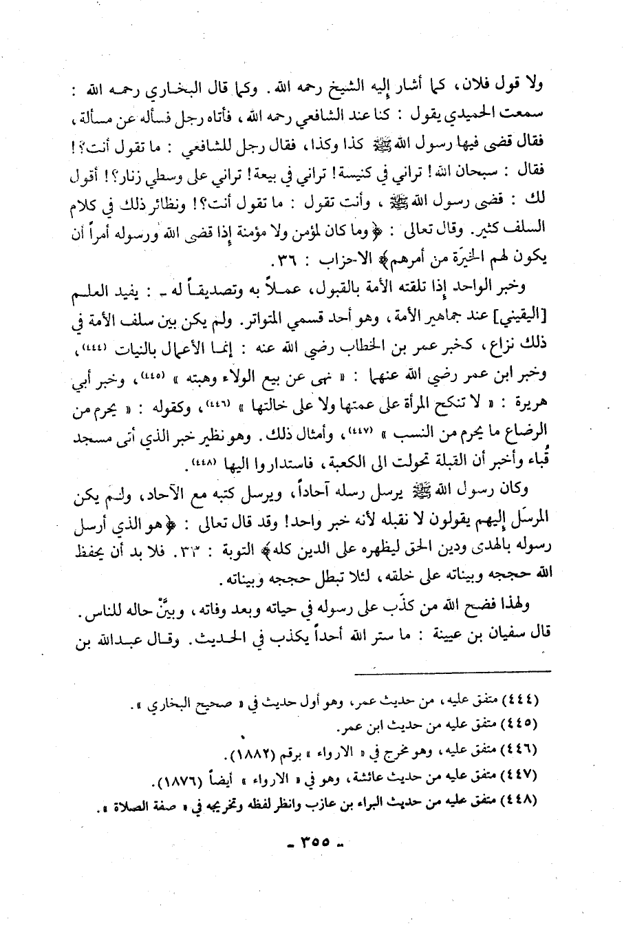 وَكَانَ رَسُولُ اللَّهِ صَلَّى اللَّهُ عَلَيْهِ وَسَلَّمَ يُرْسِلُ رُسُلَهُ آحَادًا، وَيُرْسِلُ كُتُبَهُ مَعَ الْآحَادِ، وَلَمْ يَكُنِ الْمُرْسَلُ إِلَيْهِمْ يَقُولُونَ لَا نَقْبَلُهُ لِأَنَّهُ خَبَرٌ وَاحِدٌ! وَقَدْ قَالَ تَعَالَى: {هُوَ الَّذِي أَرْسَلَ رَسُولَهُ بِالْهُدَى وَدِينِ الْحَقِّ لِيُظْهِرَهُ عَلَى الدِّينِ كُلِّهِ} [التَّوْبَةِ: 33]. فَلَا بُدَّ أَنْ يَحْفَظَ اللَّهُ حُجَجَهُ وَبَيِّنَاتِهِ عَلَى خَلْقِهِ، لِئَلَّا تَبْطُلَ حُجَجَهُ وَبَيِّنَاتِهِ.