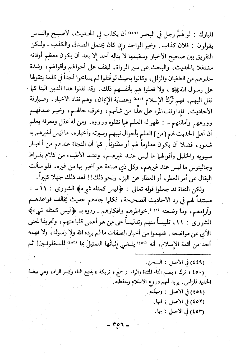 الْمُبَارَكِ: لَوْ هَمَّ رَجُلٌ فِي الْبَحْرِ1 أَنْ يَكْذِبَ فِي الْحَدِيثِ، لَأَصْبَحَ وَالنَّاسُ يَقُولُونَ: فُلَانٌ كَذَّابٌ, وَخَبَرُ الْوَاحِدِ وَإِنْ كَانَ يَحْتَمِلُ الصِّدْقَ وَالْكَذِبَ, وَلَكِنَّ التَّفْرِيقَ بَيْنَ صَحِيحِ الْأَخْبَارِ وَسَقِيمِهَا لَا يَنَالُهُ أَحَدٌ إِلَّا بَعْدَ أَنْ يَكُونَ معظم أوقاته مشتغلا بالحديث، والبحث عن سير الرُّوَاةِ، لِيَقِفَ عَلَى أَحْوَالِهِمْ وَأَقْوَالِهِمْ، وَشِدَّةِ حَذَرِهِمْ مِنَ الطُّغْيَانِ وَالزَّلَلِ، وَكَانُوا بِحَيْثُ لَوْ قُتِلُوا لَمْ يُسَامِحُوا أَحَدًا فِي كَلِمَةٍ يَتَقَوَّلُهَا عَلَى رَسُولِ اللَّهِ صَلَّى اللَّهُ عَلَيْهِ وَسَلَّمَ، وَلَا فَعَلُوا هُمْ بِأَنْفُسِهِمْ ذَلِكَ, وَقَدْ نَقَلُوا هَذَا الدين إلينا كما نقل إليهم، فهم تُرُكُ الْإِسْلَامِ2 وَعِصَابَةُ الْإِيمَانِ، وَهُمْ نُقَّادُ الْأَخْبَارِ، وَصَيَارِفَةُ الْأَحَادِيثِ. فَإِذَا وَقَفَ الْمَرْءُ عَلَى هَذَا مِنْ شَأْنِهِمْ، وَعَرَفَ حَالَهُمْ، وَخَبَرَ صِدْقَهُمْ وَوَرَعَهُمْ وَأَمَانَتَهُمْ ظَهَرَ لَهُ الْعِلْمُ فِيمَا نَقَلُوهُ وَرَوَوْهُ, وَمِنْ لَهُ عَقْلٌ وَمَعْرِفَةٌ يَعْلَمُ أَنَّ أَهْلَ الْحَدِيثِ لَهُمْ [مِنَ] الْعِلْمِ بِأَحْوَالِ نَبِيِّهِمْ وَسِيرَتِهِ وَأَخْبَارِهِ، مَا لَيْسَ لِغَيْرِهِمْ بِهِ شُعُورٌ، فَضْلًا أَنْ يَكُونَ مَعْلُومًا لَهُمْ أَوْ مَظْنُونًا, كَمَا أَنَّ النُّحَاةَ عِنْدَهُمْ مِنْ أَخْبَارِ سِيبَوَيْهِ وَالْخَلِيلِ وَأَقْوَالِهِمَا مَا لَيْسَ عِنْدَ غَيْرِهِمْ، وَعِنْدَ الْأَطِبَّاءِ مِنْ كَلَامِ بُقْرَاطَ وَجَالِينُوسَ مَا لَيْسَ عِنْدَ غَيْرِهِمْ، وَكُلُّ ذِي صَنْعَةٍ هُوَ أَخْبَرُ بِهَا مِنْ غَيْرِهِ، فَلَوْ سَأَلْتَ الْبَقَّالَ عَنْ أَمْرِ الْعِطْرِ، أَوِ الْعَطَّارَ عَنِ الْبَزِّ، وَنَحْوِ ذَلِكَ!! لَعُدَّ ذلك جهلا كبيرا.
