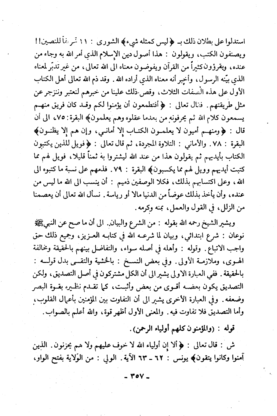 ثُمَّ اسْتَدَلُّوا عَلَى بُطْلَانِ ذَلِكَ بِـ {لَيْسَ كَمِثْلِهِ شَيْءٌ} [الشورى: 11] تَحْرِيفًا لِلنَّصَّيْنِ!! وَيُصَنِّفُونَ الْكُتُبَ، وَيَقُولُونَ: هَذَا أُصُولُ دِينِ الْإِسْلَامِ الَّذِي أَمَرَ اللَّهُ بِهِ وَجَاءَ من عنده، ويقرءون كثيرا من القرآن ويخوضون مَعْنَاهُ إِلَى اللَّهِ تَعَالَى، مِنْ غَيْرِ تَدَبُّرٍ لِمَعْنَاهُ الَّذِي بَيَّنَهُ الرَّسُولُ، وَأَخْبَرَ أَنَّهُ مَعْنَاهُ الَّذِي أَرَادَهُ اللَّهُ, وَقَدْ ذَمَّ اللَّهُ تَعَالَى أَهْلَ الْكِتَابِ الْأَوَّلِ عَلَى هَذِهِ الصِّفَاتِ الثَّلَاثِ، وَقَصَّ ذَلِكَ عَلَيْنَا مِنْ خَبَرِهِمْ لِنَعْتَبِرَ وَنَنْزَجِرَ عَنْ مِثْلِ طَرِيقَتِهِمْ, فَقَالَ تَعَالَى: {أَفَتَطْمَعُونَ أَنْ يُؤْمِنُوا لَكُمْ وَقَدْ كَانَ فَرِيقٌ مِنْهُمْ يَسْمَعُونَ كَلَامَ اللَّهِ ثُمَّ يُحَرِّفُونَهُ مِنْ بَعْدِ مَا عَقَلُوهُ وَهُمْ يَعْلَمُونَ} [الْبَقَرَةِ: 75]، إِلَى أَنْ قَالَ: {وَمِنْهُمْ أُمِّيُّونَ لَا يَعْلَمُونَ الْكِتَابَ إِلَّا أَمَانِيَّ وَإِنْ هُمْ إِلَّا يَظُنُّونَ} [الْبَقَرَةِ: 78]. وَالْأَمَانِيُّ: التِّلَاوَةُ الْمُجَرَّدَةُ، ثُمَّ قَالَ تَعَالَى: {فَوَيْلٌ لِلَّذِينَ يَكْتُبُونَ الْكِتَابَ بِأَيْدِيهِمْ ثُمَّ يَقُولُونَ هَذَا مِنْ عِنْدِ اللَّهِ لِيَشْتَرُوا بِهِ ثَمَنًا قَلِيلًا فَوَيْلٌ لَهُمْ مِمَّا كَتَبَتْ أَيْدِيهِمْ وَوَيْلٌ لَهُمْ مِمَّا يَكْسِبُونَ} [الْبَقَرَةِ: 79] , فَذَمَّهُمْ عَلَى نِسْبَةِ مَا كَتَبُوهُ إِلَى اللَّهِ، وَعَلَى اكْتِسَابِهِمْ بِذَلِكَ، فَكِلَا الْوَصْفَيْنِ ذَمِيمٌ: أَنْ يَنْسِبَ إِلَى اللَّهِ مَا لَيْسَ مِنْ عِنْدِهِ، وَأَنْ يَأْخُذَ بِذَلِكَ عِوَضًا مِنَ الدُّنْيَا مَالًا أَوْ رِيَاسَةً. نَسْأَلُ اللَّهَ تَعَالَى أَنْ يَعْصِمَنَا مِنَ الزَّلَلِ، فِي الْقَوْلِ وَالْعَمَلِ، بِمَنِّهِ وَكَرَمِهِ.