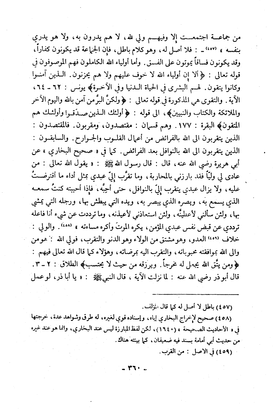 مِنْ جَمَاعَةٍ اجْتَمَعَتْ إِلَّا وَفِيهِمْ وَلِيٌّ لِلَّهِ، لَا هُمْ يَدْرُونَ بِهِ، وَلَا هُوَ يَدْرِي بِنَفْسِهِ"1, فَلَا أَصْلَ لَهُ، وَهُوَ كَلَامٌ بَاطِلٌ، فَإِنَّ الْجَمَاعَةَ قَدْ يَكُونُونَ كُفَّارًا، وَقَدْ يَكُونُونَ فُسَّاقًا يَمُوتُونَ عَلَى الْفِسْقِ, وَأَمَّا أَوْلِيَاءُ اللَّهِ الْكَامِلُونَ فَهُمُ الْمَوْصُوفُونَ فِي قَوْلِهِ تَعَالَى: {أَلَا إِنَّ أَوْلِيَاءَ اللَّهِ لَا خَوْفٌ عَلَيْهِمْ وَلَا هُمْ يَحْزَنُونَ، الَّذِينَ آمَنُوا وَكَانُوا يَتَّقُونَ، لَهُمُ الْبُشْرَى فِي الْحَيَاةِ الدُّنْيَا وَفِي الْآخِرَةِ} [يُونُسَ: 62 - 64] الآية, وَالتَّقْوَى هِيَ الْمَذْكُورَةُ فِي قَوْلِهِ تَعَالَى: {وَلَكِنَّ الْبِرَّ مَنْ آمَنَ بِاللَّهِ وَالْيَوْمِ الْآخِرِ وَالْمَلَائِكَةِ وَالْكِتَابِ وَالنَّبِيِّينَ}، إِلَى قَوْلِهِ: {أُولَئِكَ الَّذِينَ صَدَقُوا وَأُولَئِكَ هُمُ الْمُتَّقُونَ} [الْبَقَرَةِ: 177] , وَهُمْ قِسْمَانِ: مُقْتَصِدُونَ، وَمُقَرَّبُونَ. فَالْمُقْتَصِدُونَ: الَّذِينَ يَتَقَرَّبُونَ إِلَى اللَّهِ بِالْفَرَائِضِ مِنْ أَعْمَالِ الْقُلُوبِ وَالْجَوَارِحِ. وَالسَّابِقُونَ: الَّذِينَ يَتَقَرَّبُونَ إِلَى اللَّهِ بِالنَّوَافِلِ بَعْدَ الْفَرَائِضِ, كَمَا فِي صَحِيحِ الْبُخَارِيِّ عَنْ أَبِي هُرَيْرَةَ رَضِيَ اللَّهُ عَنْهُ، قَالَ: قَالَ رَسُولُ اللَّهِ صَلَّى اللَّهُ عَلَيْهِ وَسَلَّمَ: "يَقُولُ اللَّهُ تَعَالَى: مَنْ عَادَى لِي وَلِيًّا فَقَدْ بَارَزَنِي بِالْمُحَارَبَةِ، وَمَا تَقَرَّبَ إِلَيَّ عَبْدِي بِمِثْلِ أَدَاءِ مَا افْتَرَضْتُ عَلَيْهِ، وَلَا يَزَالُ عَبْدِي يَتَقَرَّبُ إِلَيَّ بِالنَّوَافِلِ، حَتَّى أُحِبَّهُ، فَإِذَا أَحْبَبْتُهُ كُنْتُ سَمْعَهُ الَّذِي يَسْمَعُ بِهِ، وَبَصَرَهُ الَّذِي يُبْصِرُ بِهِ، وَيَدَهُ الَّتِي يَبْطِشُ بِهَا، وَرِجْلَهُ الَّتِي يَمْشِي بِهَا، وَلَئِنْ سألني لأعطينه، ولئن استعاذني لأعيذنه، وما ترددت عَنْ شَيْءٍ أَنَا فَاعِلُهُ تَرَدُّدِي عَنْ قَبْضِ نَفْسِ عَبْدِي الْمُؤْمِنِ، يَكْرَهُ الْمَوْتَ وَأَكْرَهُ مَسَاءَتَهُ" 2. وَالْوَلِيُّ: خِلَافُ3 الْعَدُوِّ، وَهُوَ مُشْتَقٌّ مِنَ الْوَلَاءِ وَهُوَ الدُّنُوُّ وَالتَّقَرُّبُ، فَوَلِيُّ اللَّهِ: هُوَ مَنْ وَالَى اللَّهَ بِمُوَافَقَتِهِ مَحْبُوبَاتِهِ، وَالتَّقَرُّبِ إِلَيْهِ بِمَرْضَاتِهِ، وَهَؤُلَاءِ كَمَا قَالَ اللَّهُ تَعَالَى فِيهِمْ: {وَمَنْ يَتَّقِ اللَّهَ يَجْعَلْ لَهُ مَخْرَجًا، وَيَرْزُقْهُ مِنْ حَيْثُ لَا يَحْتَسِبُ} [الطَّلَاقِ: 2, 3]. قَالَ أَبُو ذَرٍّ رَضِيَ اللَّهُ عَنْهُ: لَمَّا نَزَلَتِ الْآيَةُ، قَالَ النَّبِيُّ صَلَّى اللَّهُ عَلَيْهِ وَسَلَّمَ: "يَا أَبَا ذر، لو عمل