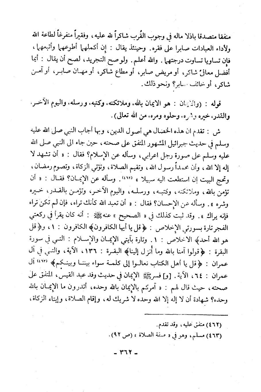 [و] «فسر صَلَّى اللَّهُ عَلَيْهِ وَسَلَّمَ الْإِيمَانَ فِي حَدِيثِ وَفْدِ عَبْدِ الْقَيْسِ، الْمُتَّفَقِ عَلَى صِحَّتِهِ، حَيْثُ قَالَ لَهُمْ: آمُرُكُمْ بِالْإِيمَانِ بِاللَّهِ وَحْدَهُ، أَتَدْرُونَ مَا الْإِيمَانُ بِاللَّهِ وَحْدَهُ؟ شَهَادَةُ أَنْ لَا إِلَهَ إِلَّا اللَّهُ وَحْدَهُ لَا شَرِيكَ لَهُ، وإقام الصلاة، وإيتاء الزكاة