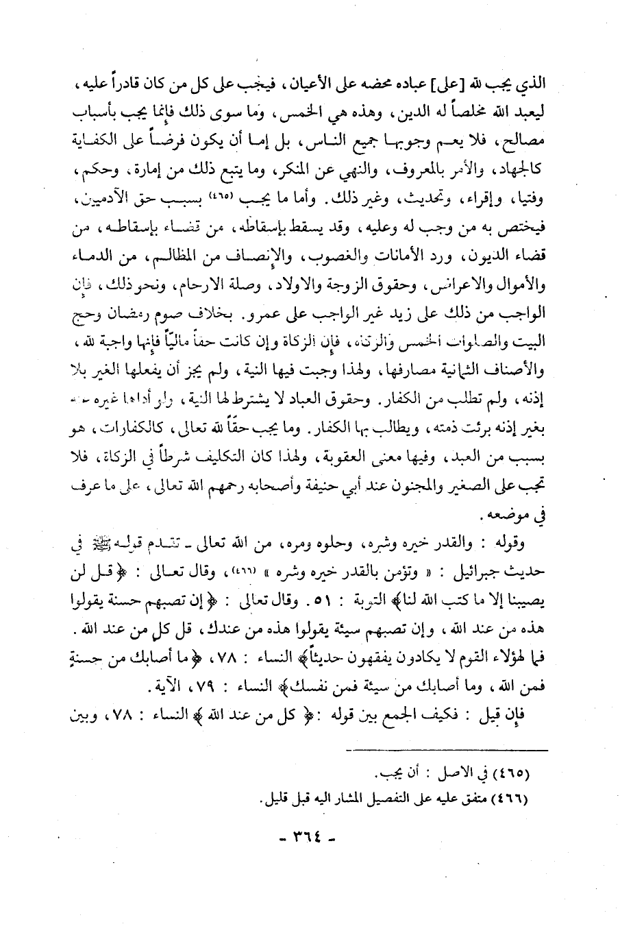 الذي يجب لله "على" عِبَادَةً مَحْضَةً عَلَى الْأَعْيَانِ، فَيَجِبُ عَلَى كُلِّ من كان قادرا عليه، ليعبد الله مُخْلِصًا لَهُ الدِّينَ، وَهَذِهِ هِيَ الْخَمْسُ، وَمَا سوى ذلك فإنما يجب بأسباب مصالح، فَلَا يَعْلَمُ وُجُوبَهَا جَمِيعُ النَّاسِ، بَلْ إِمَّا أَنْ يَكُونَ فَرْضًا عَلَى الْكِفَايَةِ كَالْجِهَادِ، وَالْأَمْرِ بِالْمَعْرُوفِ، وَالنَّهْيِ عَنِ الْمُنْكَرِ، وَمَا يَتْبَعُ ذَلِكَ مِنْ إِمَارَةٍ، وَحُكْمٍ، وَفُتْيَا، وَإِقْرَاءٍ، وَتَحْدِيثٍ، وَغَيْرِ ذلك, وأما ما يَجِبَ1 بِسَبَبِ حَقِّ الْآدَمِيِّينَ، فَيَخْتَصُّ بِهِ مَنْ وَجَبَ لَهُ وَعَلَيْهِ، وَقَدْ يَسْقُطُ بِإِسْقَاطِهِ مِنْ قضاء الديون، ورد الأمانات والغصوب، وَالْإِنْصَافِ مِنَ الْمَظَالِمِ، مِنَ الدِّمَاءِ وَالْأَمْوَالِ وَالْأَعْرَاضِ، وَحُقُوقِ الزَّوْجَةِ وَالْأَوْلَادِ، وَصِلَةِ الْأَرْحَامِ، وَنَحْوِ ذَلِكَ، فَإِنَّ الْوَاجِبَ مِنْ ذَلِكَ عَلَى زَيْدٍ غَيْرُ الْوَاجِبِ عَلَى عَمْرٍو, بِخِلَافِ صَوْمِ رَمَضَانَ وَحَجِّ الْبَيْتِ وَالصَّلَوَاتِ الْخَمْسِ وَالزَّكَاةِ، فَإِنَّ الزَّكَاةَ وَإِنْ كَانَتْ حَقًّا مَالِيًّا فَإِنَّهَا وَاجِبَةٌ لِلَّهِ، وَالْأَصْنَافُ الثَّمَانِيَةُ مَصَارِفُهَا، وَلِهَذَا وَجَبَتْ فِيهَا النِّيَّةُ، وَلَمْ يَجُزْ أَنْ يَفْعَلَهَا الْغَيْرُ بِلَا إِذْنِهِ، وَلَمْ تُطْلَبْ مِنَ الْكُفَّارِ، وَحُقُوقُ الْعِبَادِ لَا يُشْتَرَطُ لَهَا النِّيَّةُ، وَلَوْ أَدَّاهَا غَيْرُهُ عَنْهُ بِغَيْرِ إِذْنِهِ بَرِئَتْ ذِمَّتُهُ، وَيُطَالَبُ بِهَا الْكُفَّارُ. وَمَا يَجِبُ حَقًّا لِلَّهِ تَعَالَى، كَالْكَفَّارَاتِ، هُوَ بِسَبَبٍ مِنَ الْعَبْدِ، وَفِيهَا مَعْنَى الْعُقُوبَةِ، وَلِهَذَا كَانَ التَّكْلِيفُ شَرْطًا فِي الزَّكَاةِ، فَلَا تَجِبُ عَلَى الصَّغِيرِ وَالْمَجْنُونِ عِنْدَ أَبِي حَنِيفَةَ وَأَصْحَابِهِ رَحِمَهُمُ اللَّهُ تَعَالَى، عَلَى مَا عُرِفَ فِي مَوْضِعِهِ.