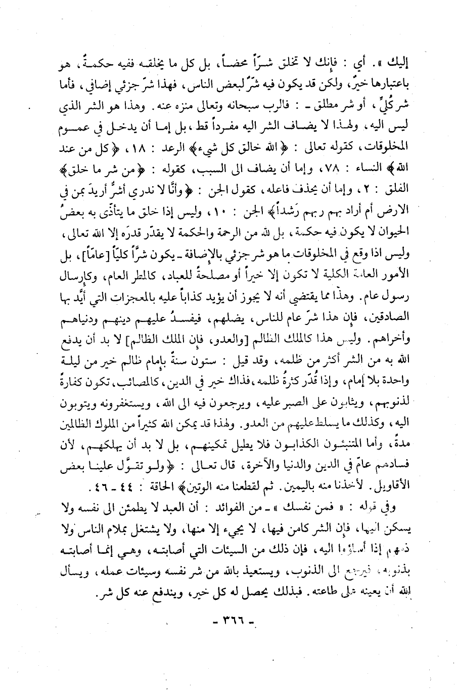 إِلَيْكَ". أَيْ: فَإِنَّكَ لَا تَخْلُقُ شَرًّا مَحْضًا، بَلْ كُلُّ مَا يَخْلُقُهُ فَفِيهِ حِكْمَةٌ، هُوَ بِاعْتِبَارِهَا خَيْرٌ، وَلَكِنْ قَدْ يَكُونُ فِيهِ شَرٌّ لِبَعْضِ النَّاسِ، فَهَذَا شَرٌّ جُزْئِيٌّ إِضَافِيٌّ، فَأَمَّا شَرٌّ كُلِّيٌّ، أَوْ شَرٌّ مُطْلَقٌ فَالرَّبُّ سُبْحَانَهُ وَتَعَالَى مُنَزَّهٌ عَنْهُ. وَهَذَا هُوَ الشَّرُّ الَّذِي لَيْسَ إِلَيْهِ، وَلِهَذَا لَا يُضَافُ الشَّرُّ إِلَيْهِ مُفْرَدًا قَطُّ، بَلْ إِمَّا أَنْ يَدْخُلَ فِي عُمُومِ الْمَخْلُوقَاتِ، كَقَوْلِهِ تَعَالَى: {اللَّهُ خَالِقُ كُلِّ شَيْءٍ} [الرعد: 18]، {كُلٌّ مِنْ عِنْدِ اللَّهِ} [النِّسَاءِ: 78]، وَإِمَّا أَنْ يُضَافَ إِلَى السَّبَبِ، كَقَوْلِهِ: {مِنْ شَرِّ مَا خَلَقَ} [الْفَلَقِ: 2]، وَإِمَّا أَنْ يُحْذَفَ فَاعِلُهُ، كَقَوْلِ الْجِنِّ: {وَأَنَّا لَا نَدْرِي أَشَرٌّ أُرِيدَ بِمَنْ فِي الأَرْضِ أَمْ أَرَادَ بِهِمْ رَبُّهُمْ رَشَدًا} [الْجِنِّ: 10]، وَلَيْسَ إِذَا خَلَقَ مَا يَتَأَذَّى بِهِ بَعْضُ الْحَيَوَانِ لَا يَكُونُ فِيهِ حِكْمَةٌ، بَلْ لِلَّهِ مِنَ الرَّحْمَةِ وَالْحِكْمَةِ مَا لَا يُقَدِّرُ قَدْرَهُ إِلَّا اللَّهُ تَعَالَى، وَلَيْسَ إِذَا وَقَعَ فِي الْمَخْلُوقَاتِ مَا هُوَ شَرٌّ جُزْئِيٌّ بِالْإِضَافَةِ, يَكُونُ شَرًّا كُلِّيًّا [عَامًّا]، بَلِ الْأُمُورُ الْعَامَّةُ الْكُلِّيَّةُ لَا تَكُونُ إِلَّا خَيْرًا أَوْ مَصْلَحَةً لِلْعِبَادِ، كَالْمَطَرِ الْعَامِّ، وَكَإِرْسَالِ رَسُولٍ عَامٍّ, وَهَذَا مِمَّا يَقْتَضِي أَنَّهُ لَا يَجُوزُ أَنْ يُؤَيِّدَ كَذَّابًا عَلَيْهِ بِالْمُعْجِزَاتِ الَّتِي أَيَّدَ بِهَا الصَّادِقِينَ، فَإِنَّ هَذَا شَرٌّ عَامٌّ لِلنَّاسِ، يُضِلُّهُمْ، فَيُفْسِدُ عَلَيْهِمْ دِينَهُمْ وَدُنْيَاهُمْ وَأُخْرَاهُمْ, وَلَيْسَ هَذَا كَالْمَلِكِ الظَّالِمِ [وَالْعَدُوِّ، فَإِنَّ الْمَلِكَ الظَّالِمَ] لَا بُدَّ أَنْ يَدْفَعَ اللَّهُ بِهِ مِنَ الشَّرِّ أَكْثَرَ مِنْ ظُلْمِهِ، وَقَدْ قِيلَ: سِتُّونَ سَنَةً بِإِمَامٍ ظَالِمٍ خَيْرٌ مِنْ لَيْلَةٍ وَاحِدَةٍ بِلَا إِمَامٍ، وَإِذَا قُدِّرَ كَثْرَةُ ظُلْمِهِ، فَذَاكَ خَيْرٌ فِي الدِّينِ، كَالْمَصَائِبِ، تَكُونُ كَفَّارَةً لِذُنُوبِهِمْ، وَيُثَابُونَ عَلَى الصَّبْرِ عَلَيْهِ، وَيَرْجِعُونَ فِيهِ إِلَى اللَّهِ، وَيَسْتَغْفِرُونَهُ وَيَتُوبُونَ إِلَيْهِ، وَكَذَلِكَ مَا يُسَلَّطُ عَلَيْهِمْ مِنَ الْعَدُوِّ. وَلِهَذَا قَدْ يُمَكِّنُ اللَّهُ كَثِيرًا مِنَ الْمُلُوكِ الظَّالِمِينَ مُدَّةً، وَأَمَّا الْمُتَنَبِّئُونَ الْكَذَّابُونَ فَلَا يُطِيلُ تَمْكِينَهُمْ، بَلْ لَا بُدَّ أَنْ يُهْلِكَهُمْ؛ لِأَنَّ فَسَادَهُمْ عَامٌّ فِي الدِّينِ وَالدُّنْيَا وَالْآخِرَةِ، قَالَ تَعَالَى: {وَلَوْ تَقَوَّلَ عَلَيْنَا بَعْضَ الْأَقَاوِيلِ، لَأَخَذْنَا مِنْهُ بِالْيَمِينِ، ثُمَّ لَقَطَعْنَا مِنْهُ الْوَتِينَ} [الْحَاقَّةِ: 44 - 46].