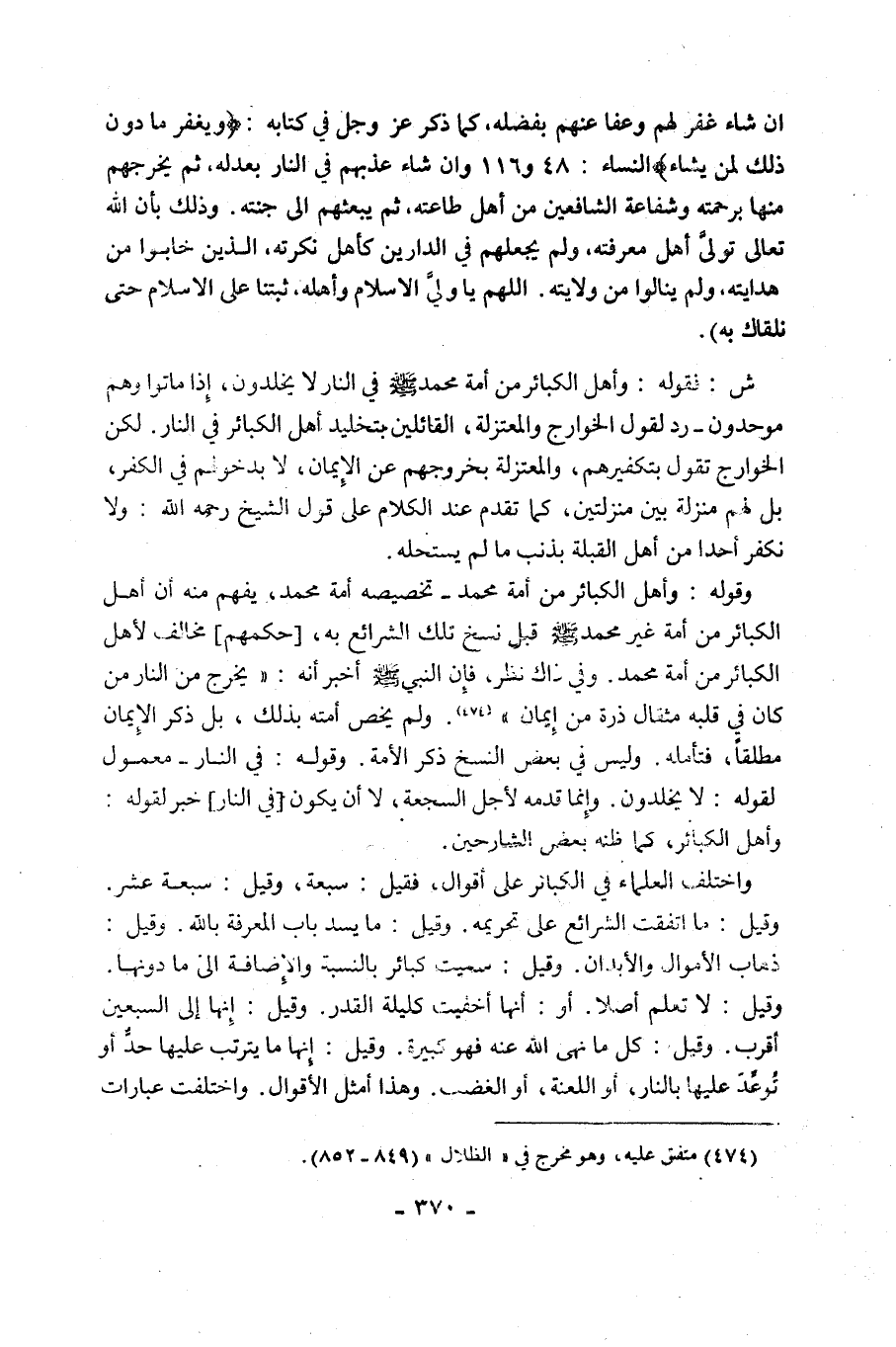 ش: فَقَوْلُهُ: وَأَهْلُ الْكَبَائِرِ مِنْ أُمَّةِ مُحَمَّدٍ صَلَّى اللَّهُ عَلَيْهِ وَسَلَّمَ فِي النَّارِ لَا يُخَلَّدُونَ، إِذَا مَاتُوا وَهُمْ مُوَحِّدُونَ, رَدٌّ لِقَوْلِ الْخَوَارِجِ وَالْمُعْتَزِلَةِ، الْقَائِلِينَ بِتَخْلِيدِ أَهْلِ الْكَبَائِرِ فِي النَّارِ, لَكِنَّ الْخَوَارِجَ تَقُولُ بِتَكْفِيرِهِمْ، وَالْمُعْتَزِلَةُ بِخُرُوجِهِمْ عَنِ الْإِيمَانِ، لَا بِدُخُولِهِمْ فِي الْكُفْرِ، بَلْ لَهُمْ مَنْزِلَةٌ بَيْنَ مَنْزِلَتَيْنِ، كَمَا تَقَدَّمَ عِنْدَ الْكَلَامِ عَلَى قَوْلِ الشَّيْخِ رَحِمَهُ اللَّهُ: وَلَا نُكَفِّرُ أَحَدًا مِنْ أَهْلِ الْقِبْلَةِ بِذَنْبٍ مَا لَمْ يَسْتَحِلَّهُ.