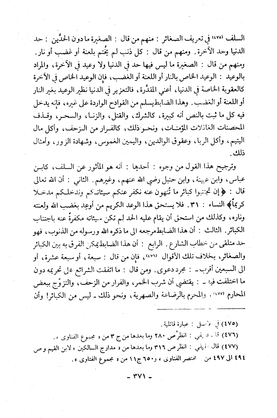 السلف1 في تعريف الصغائر: مِنْهُمْ مَنْ قَالَ: الصَّغِيرَةُ مَا دُونَ الْحَدَّيْنِ: حَدِّ الدُّنْيَا وَحَدِّ الْآخِرَةِ. وَمِنْهُمْ مَنْ قَالَ: كُلُّ ذَنْبٍ لَمْ يُخْتَمْ بِلَعْنَةٍ أَوْ غَضَبٍ أَوْ نَارٍ. وَمِنْهُمْ مَنْ قَالَ: الصَّغِيرَةُ مَا لَيْسَ فِيهَا حَدٌّ فِي الدُّنْيَا وَلَا وَعِيدٌ فِي الْآخِرَةِ، وَالْمُرَادُ بِالْوَعِيدِ: الْوَعِيدُ الْخَاصُّ بِالنَّارِ أَوِ اللَّعْنَةُ أَوِ الْغَضَبُ، فَإِنَّ الْوَعِيدَ الْخَاصَّ فِي الْآخِرَةِ كَالْعُقُوبَةِ الْخَاصَّةِ فِي الدُّنْيَا، أَعْنِي الْمَقْدِرَةَ، فَالتَّعْزِيرُ فِي الدُّنْيَا نَظِيرُ الْوَعِيدِ بِغَيْرِ النَّارِ أَوِ اللَّعْنَةِ أَوِ الْغَضَبِ. وَهَذَا الضَّابِطُ يَسْلَمُ مِنَ الْقَوَادِحِ الْوَارِدَةِ عَلَى غَيْرِهِ، فَإِنَّهُ يَدْخُلُ فِيهِ كُلُّ مَا ثَبَتَ بِالنَّصِّ أَنَّهُ كَبِيرَةٌ، كَالشِّرْكِ، وَالْقَتْلِ، وَالزِّنَا، وَالسِّحْرِ، وَقَذْفِ الْمُحْصَنَاتِ الْغَافِلَاتِ الْمُؤْمِنَاتِ، وَنَحْوِ ذَلِكَ، كَالْفِرَارِ مِنَ الزَّحْفِ، وَأَكْلِ مَالِ الْيَتِيمِ، وَأَكْلِ الرِّبَا، وَعُقُوقِ الْوَالِدَيْنِ، وَالْيَمِينِ الْغَمُوسِ، وَشَهَادَةِ الزُّورِ، وَأَمْثَالِ ذَلِكَ.
