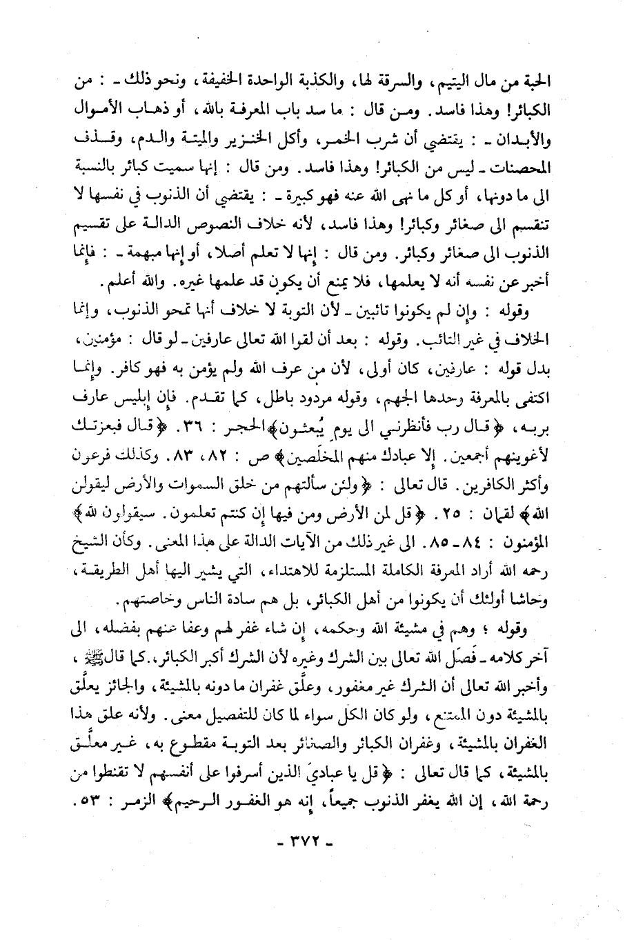 وَقَوْلُهُ: وَإِنْ لَمْ يَكُونُوا تَائِبِينَ؛ لِأَنَّ التَّوْبَةَ لَا خِلَافَ أَنَّهَا تَمْحُو الذُّنُوبَ، وَإِنَّمَا الْخِلَافُ فِي غَيْرِ التَّائِبِ, وَقَوْلُهُ: بَعْدَ أَنْ لَقُوا اللَّهَ تَعَالَى عَارِفِينَ, لَوْ قَالَ: مُؤْمِنِينَ، بَدَلَ قَوْلِهِ: عَارِفِينَ، كَانَ أَوْلَى؛ لِأَنَّ مَنْ عَرَفَ اللَّهَ وَلَمْ يُؤْمِنْ بِهِ فَهُوَ كَافِرٌ, وَإِنَّمَا اكْتَفَى بِالْمَعْرِفَةِ وَحْدَهَا الْجَهْمُ، وَقَوْلُهُ مَرْدُودٌ بَاطِلٌ، كَمَا تَقَدَّمَ. فَإِنَّ إِبْلِيسَ عَارِفٌ بِرَبِّهِ، {قَالَ رَبِّ فَأَنْظِرْنِي إِلَى يَوْمِ يُبْعَثُونَ} [الْحِجْرِ: 36]. {قَالَ فَبِعِزَّتِكَ لَأُغْوِيَنَّهُمْ أَجْمَعِينَ، إِلَّا عِبَادَكَ مِنْهُمُ الْمُخْلَصِينَ} [ص: 82، 83]. وَكَذَلِكَ فِرْعَوْنُ وَأَكْثَرُ الْكَافِرِينَ. قَالَ تَعَالَى: {وَلَئِنْ سَأَلْتَهُمْ مَنْ خَلَقَ السَّمَاوَاتِ وَالْأَرْضَ لَيَقُولُنَّ اللَّهُ} [لُقْمَانَ: 25]. {قُلْ لِمَنِ الْأَرْضُ وَمَنْ فِيهَا إِنْ كُنْتُمْ تَعْلَمُونَ، سَيَقُولُونَ لِلَّهِ} [الْمُؤْمِنُونَ: 84 - 85]. إِلَى غَيْرِ ذَلِكَ مِنَ الْآيَاتِ الدَّالَّةِ عَلَى هَذَا الْمَعْنَى, وَكَأَنَّ الشَّيْخَ رَحِمَهُ اللَّهُ أَرَادَ الْمَعْرِفَةَ الْكَامِلَةَ الْمُسْتَلْزِمَةَ لِلِاهْتِدَاءِ، الَّتِي يُشِيرُ إِلَيْهَا أَهْلُ الطَّرِيقَةِ، وَحَاشَا أُولَئِكَ أَنْ يَكُونُوا مِنْ أَهْلِ الْكَبَائِرِ، بَلْ هُمْ سَادَةُ النَّاسِ وَخَاصَّتُهُمْ.