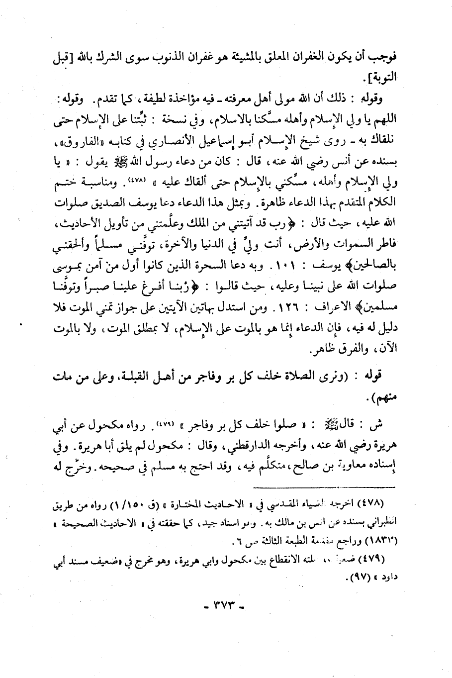 قَوْلُهُ: "وَنَرَى الصَّلَاةَ خَلْفَ كُلِّ بَرٍّ وَفَاجِرٍ مِنْ أهل القبلة، وعلى من مات منهم".