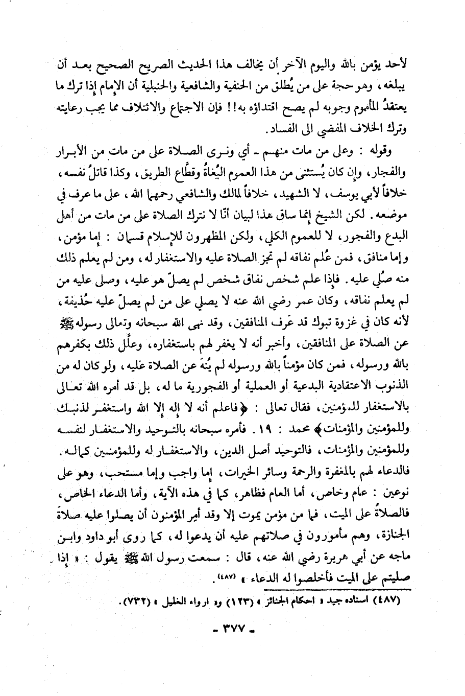وَقَوْلُهُ: وَعَلَى مَنْ مَاتَ مِنْهُمْ, أَيْ وَنَرَى الصَّلَاةَ عَلَى مَنْ مَاتَ مِنَ الْأَبْرَارِ وَالْفُجَّارِ، وَإِنْ كَانَ يُسْتَثْنَى مِنْ هَذَا الْعُمُومِ الْبُغَاةُ وَقُطَّاعُ الطَّرِيقِ، وَكَذَا قاتل نفسه، خلافا لأبي بوسف، لَا الشَّهِيدُ، خِلَافًا لِمَالِكٍ وَالشَّافِعِيِّ رَحِمَهُمَا اللَّهُ، عَلَى مَا عُرِفَ فِي مَوْضِعِهِ, لَكِنَّ الشَّيْخَ إنما ساق هذا لِبَيَانِ أَنَّا لَا نَتْرُكُ الصَّلَاةَ عَلَى مَنْ مَاتَ مِنْ أَهْلِ الْبِدَعِ وَالْفُجُورِ، لَا لِلْعُمُومِ الْكُلِّيِّ، وَلَكِنِ الْمُظْهِرُونَ لِلْإِسْلَامِ قِسْمَانِ: إِمَّا مُؤْمِنٌ، وَإِمَّا مُنَافِقٌ، فَمِنْ عُلِمَ نِفَاقُهُ لَمْ تَجُزِ الصَّلَاةُ عَلَيْهِ وَالِاسْتِغْفَارُ لَهُ، وَمَنْ لَمْ يُعْلَمْ ذَلِكَ مِنْهُ صُلي عَلَيْهِ, فَإِذَا عَلِمَ شَخْصٌ نِفَاقَ شَخْصٍ لَمْ يُصَلِّ هُوَ عَلَيْهِ، وَصَلَّى عَلَيْهِ مَنْ لَمْ يَعْلَمْ نِفَاقَهُ، وَكَانَ عُمَرُ رَضِيَ اللَّهُ عَنْهُ لَا يُصَلِّي عَلَى مَنْ لَمْ يُصَلِّ عَلَيْهِ حُذَيْفَةُ؛ لِأَنَّهُ كَانَ فِي غَزْوَةِ تَبُوكَ قَدْ عَرَفَ الْمُنَافِقِينَ، وَقَدْ نَهَى اللَّهُ سُبْحَانَهُ وَتَعَالَى رَسُولَهُ صَلَّى اللَّهُ عَلَيْهِ وَسَلَّمَ عَنِ الصَّلَاةِ عَلَى الْمُنَافِقِينَ، وَأَخْبَرَ أَنَّهُ لَا يَغْفِرُ لَهُمْ بِاسْتِغْفَارِهِ، وَعَلَّلَ ذَلِكَ بِكُفْرِهِمْ بِاللَّهِ وَرَسُولِهِ، فَمَنْ كَانَ مُؤْمِنًا بِاللَّهِ وَرَسُولِهِ لَمْ يُنْهَ عَنِ الصَّلَاةِ عَلَيْهِ، وَلَوْ كَانَ لَهُ مِنَ الذُّنُوبِ الِاعْتِقَادِيَّةِ الْبِدْعِيَّةِ أَوِ الْعَمَلِيَّةِ أَوِ الْفُجُورِيَّةِ مَا لَهُ، بَلْ قَدْ أَمَرَهُ اللَّهُ تَعَالَى بِالِاسْتِغْفَارِ لِلْمُؤْمِنِينَ، فَقَالَ تَعَالَى: {فَاعْلَمْ أَنَّهُ لَا إِلَهَ إِلَّا اللَّهُ وَاسْتَغْفِرْ لِذَنْبِكَ وَلِلْمُؤْمِنِينَ وَالْمُؤْمِنَاتِ} [مُحَمَّدٍ: 19]. فَأَمَرَهُ سُبْحَانَهُ بِالتَّوْحِيدِ وَالِاسْتِغْفَارِ لِنَفْسِهِ وَلِلْمُؤْمِنِينَ وَالْمُؤْمِنَاتِ، فَالتَّوْحِيدُ أَصْلُ الدِّينِ، وَالِاسْتِغْفَارُ له وللمؤمنين كما له, فَالدُّعَاءُ لَهُمْ بِالْمَغْفِرَةِ وَالرَّحْمَةِ وَسَائِرِ الْخَيْرَاتِ، إِمَّا وَاجِبٌ وَإِمَّا مُسْتَحَبٌّ، وَهُوَ عَلَى نَوْعَيْنِ: عَامٍّ وَخَاصٍّ، أَمَّا الْعَامُّ فَظَاهِرٌ، كَمَا فِي هَذِهِ الْآيَةِ، وَأَمَّا الدُّعَاءُ الْخَاصُّ، فَالصَّلَاةُ عَلَى الْمَيِّتِ، فَمَا مِنْ مُؤْمِنٍ يَمُوتُ إِلَّا وَقَدْ أُمِرَ الْمُؤْمِنُونَ أَنْ يُصَلُّوا عَلَيْهِ صَلَاةَ الْجِنَازَةِ، وَهُمْ مَأْمُورُونَ فِي صَلَاتِهِمْ عَلَيْهِ أَنْ يَدْعُوا لَهُ، كَمَا رَوَى أَبُو دَاوُدَ وَابْنُ مَاجَهْ عَنْ أَبِي هُرَيْرَةَ رَضِيَ اللَّهُ عَنْهُ، قَالَ: سَمِعْتُ رسول الله صلى الله عليه وسلم يقول: "إِذَا صَلَّيْتُمْ عَلَى الْمَيِّتِ فَأَخْلِصُوا لَهُ الدُّعَاءَ" 1.