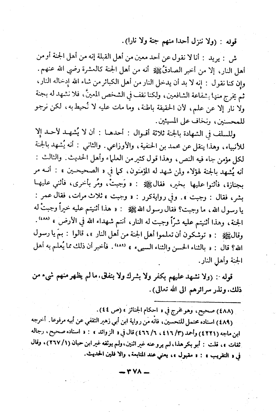 وَلِلسَّلَفِ فِي الشَّهَادَةِ بِالْجَنَّةِ ثَلَاثَةُ أَقْوَالٍ: أَحَدُهَا: أَنْ لَا يُشْهَدَ لِأَحَدٍ إِلَّا لِلْأَنْبِيَاءِ، وَهَذَا يُنْقَلُ عَنْ مُحَمَّدِ بْنِ الْحَنَفِيَّةِ، وَالْأَوْزَاعِيِّ, وَالثَّانِي: أَنَّهُ يُشْهَدُ بِالْجَنَّةِ لِكُلِّ مُؤْمِنٍ جَاءَ فِيهِ النَّصُّ، وَهَذَا قَوْلُ كَثِيرٍ مِنَ الْعُلَمَاءِ وَأَهْلِ الْحَدِيثِ, وَالثَّالِثُ: أَنَّهُ يُشْهَدُ بِالْجَنَّةِ لِهَؤُلَاءِ وَلِمَنْ شَهِدَ لَهُ الْمُؤْمِنُونَ، كَمَا فِي الصَّحِيحَيْنِ: أَنَّهُ مر بجنازة، فأثنوا عليها بخير، فقال صَلَّى اللَّهُ عَلَيْهِ وَسَلَّمَ: "وَجَبَتْ"، وَمُرَّ بِأُخْرَى، فَأُثْنِيَ عَلَيْهَا بِشَرٍّ، فَقَالَ: "وَجَبَتْ" , وَفِي رِوَايَةٍ كَرَّرَ: وَجَبَتْ ثَلَاثَ مَرَّاتٍ، فَقَالَ عُمَرُ: يَا رَسُولَ اللَّهِ، مَا وَجَبَتْ؟ فَقَالَ رَسُولُ اللَّهِ صَلَّى اللَّهُ عَلَيْهِ وَسَلَّمَ: "هَذَا أَثْنَيْتُمْ عَلَيْهِ خَيْرًا وَجَبَتْ لَهُ الْجَنَّةُ، وَهَذَا أَثْنَيْتُمْ عَلَيْهِ شَرًّا وَجَبَتْ لَهُ النَّارُ، أَنْتُمْ شُهَدَاءُ اللَّهِ فِي الْأَرْضِ" 1. وَقَالَ صَلَّى اللَّهُ عَلَيْهِ وَسَلَّمَ: "تُوشِكُونَ أَنْ تَعْلَمُوا أَهْلَ الْجَنَّةِ مِنْ أَهْلِ النَّارِ"، قَالُوا: بِمَ يَا رَسُولَ اللَّهِ؟ قَالَ: "بِالثَّنَاءِ الْحَسَنِ وَالثَّنَاءِ السَّيِّئِ" 2. فَأَخْبَرَ أَنَّ ذَلِكَ مِمَّا يُعْلَمُ بِهِ أَهْلُ الْجَنَّةِ وَأَهْلُ النَّارِ.
