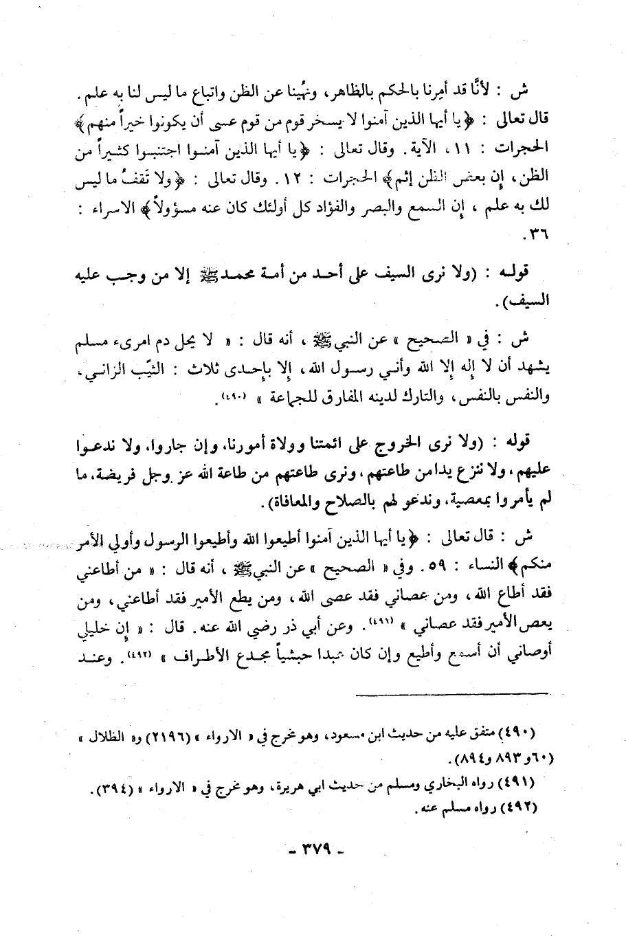 قَوْلُهُ: "وَلَا نَرَى السَّيْفَ عَلَى أَحَدٍ مِنْ أُمَّةِ مُحَمَّدٍ صَلَّى اللَّهُ عَلَيْهِ وَسَلَّمَ إِلَّا مَنْ وَجَبَ عَلَيْهِ السَّيْفُ".