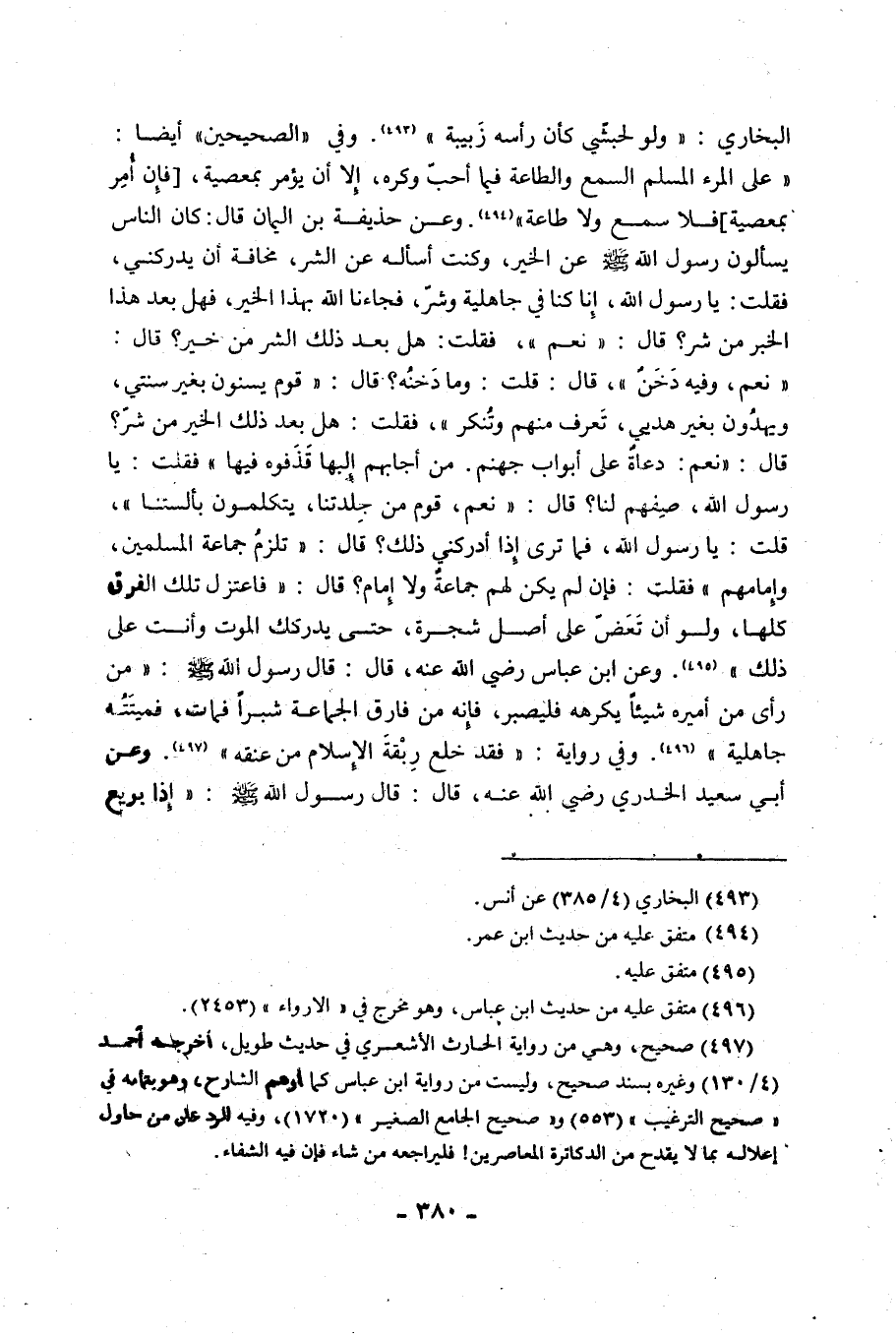 البخاري: "ولو لحبشي كأن رأسه زبيبة"1. وفي "الصَّحِيحَيْنِ" أَيْضًا: "عَلَى الْمَرْءِ الْمُسْلِمِ السَّمْعُ وَالطَّاعَةُ فِيمَا أَحَبَّ وَكَرِهَ، إِلَّا أَنْ يُؤْمَرَ بِمَعْصِيَةٍ، [فَإِنْ أُمِرَ بِمَعْصِيَةٍ] فَلَا سَمْعَ وَلَا طَاعَةَ" 2. وَعَنْ حُذَيْفَةَ بْنِ الْيَمَانِ قَالَ: كَانَ النَّاسُ يَسْأَلُونَ رَسُولَ اللَّهِ صَلَّى اللَّهُ عَلَيْهِ وَسَلَّمَ عَنِ الْخَيْرِ، وَكُنْتُ أَسْأَلُهُ عَنِ الشَّرِّ، مَخَافَةَ أَنْ يُدْرِكَنِي، فَقُلْتُ: يَا رَسُولَ اللَّهِ، إِنَّا كُنَّا فِي جَاهِلِيَّةٍ وَشَرٍّ، فَجَاءَنَا اللَّهُ بِهَذَا الْخَيْرِ، فَهَلْ بَعْدَ هَذَا الْخَيْرِ مِنْ شَرٍّ؟ قَالَ: "نَعَمْ"، فَقُلْتُ: هَلْ بَعْدَ ذَلِكَ الشَّرِّ مِنْ خَيْرٍ؟ قَالَ: "نَعَمْ، وَفِيهِ دَخَنٌ"، قَالَ: قلت: وما دخنه؟ قال: "قوم يسنون بغير سنتي، ويهدون بِغَيْرِ هَدْيِي، تَعْرِفُ مِنْهُمْ وَتُنْكِرُ"، فَقُلْتُ: هَلْ بَعْدَ ذَلِكَ الْخَيْرِ مِنْ شَرٍّ؟ قَالَ: "نَعَمْ, دُعَاةٌ عَلَى أَبْوَابِ جَهَنَّمَ, مَنْ أَجَابَهُمْ إِلَيْهَا قَذَفُوهُ فِيهَا" , فَقُلْتُ: يَا رَسُولَ اللَّهِ! صِفْهُمْ لَنَا؟ قَالَ: "نَعَمْ، قَوْمٌ مِنْ جِلْدَتِنَا، يَتَكَلَّمُونَ بألستنا"، قُلْتُ: يَا رَسُولَ اللَّهِ، فَمَا تَرَى إِذَا أَدْرَكَنِي ذَلِكَ؟ قَالَ: "تَلْزَمُ جَمَاعَةَ الْمُسْلِمِينَ، وَإِمَامَهُمْ" , فَقُلْتُ: فَإِنْ لَمْ يَكُنْ لَهُمْ جَمَاعَةٌ وَلَا إِمَامٌ؟ قَالَ: "فَاعْتَزِلْ تِلْكَ الْفِرَقَ كُلَّهَا، وَلَوْ أَنْ تَعَضَّ عَلَى أَصْلِ شَجَرَةٍ، حَتَّى يُدْرِكَكَ الْمَوْتُ وَأَنْتَ عَلَى ذَلِكَ" 3. وَعَنِ ابْنِ عَبَّاسٍ رَضِيَ اللَّهُ عَنْهُ، قَالَ: قَالَ رَسُولُ اللَّهِ صَلَّى اللَّهُ عَلَيْهِ وَسَلَّمَ: "مَنْ رَأَى مِنْ أَمِيرِهِ شَيْئًا يَكْرَهُهُ فَلْيَصْبِرْ، فَإِنَّهُ مَنْ فَارَقَ الجماعة شبرا فمات، فميتته جَاهِلِيَّةٌ" 4, وَفِي رِوَايَةٍ: "فَقَدْ خَلَعَ رِبْقَةَ الْإِسْلَامِ مِنْ عُنُقِهِ" 5. وَعَنْ أَبِي سَعِيدٍ الْخُدْرِيِّ رَضِيَ اللَّهُ عَنْهُ، قَالَ: قَالَ رَسُولُ اللَّهِ صَلَّى الله عليه وسلم: "إذا بويع