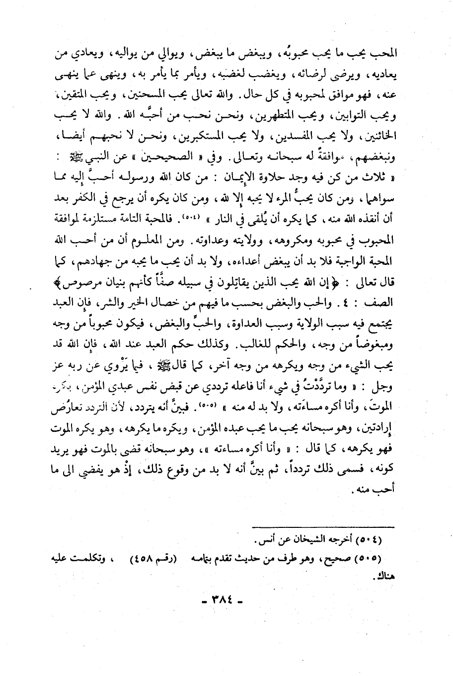 الْمُحِبَّ يُحِبُّ مَا يُحِبُّ مَحْبُوبُهُ، وَيُبْغِضُ مَا يُبْغِضُ، وَيُوَالِي مَنْ يُوَالِيهِ، وَيُعَادِي مَنْ يُعَادِيهِ، وَيَرْضَى لِرِضَائِهِ، وَيَغْضَبُ لِغَضَبِهِ، وَيَأْمُرُ بِمَا يَأْمُرُ بِهِ، وَيَنْهَى عَمَّا يَنْهَى عَنْهُ، فَهُوَ مُوَافِقٌ لِمَحْبُوبِهِ فِي كُلِّ حَالٍ, وَاللَّهُ تَعَالَى يُحِبُّ المسحنين، وَيُحِبُّ الْمُتَّقِينَ، وَيُحِبُّ التَّوَّابِينَ، وَيُحِبُّ الْمُتَطَهِّرِينَ، وَنَحْنُ نُحِبُّ مَنْ أَحَبَّهُ اللَّهُ, وَاللَّهُ لَا يُحِبُّ الْخَائِنِينَ، وَلَا يُحِبُّ الْمُفْسِدِينَ، وَلَا يُحِبُّ الْمُسْتَكْبِرِينَ، وَنَحْنُ لَا نُحِبُّهُمْ أَيْضًا، وَنُبْغِضُهُمْ، مُوَافَقَةً لَهُ سبحانه وتعالى, وَفِي الصَّحِيحَيْنِ عَنِ النَّبِيِّ صَلَّى اللَّهُ عَلَيْهِ وَسَلَّمَ: "ثَلَاثٌ مَنْ كُنَّ فِيهِ وَجَدَ حَلَاوَةَ الْإِيمَانِ: مَنْ كَانَ اللَّهُ وَرَسُولُهُ أَحَبَّ إِلَيْهِ مِمَّا سِوَاهُمَا، وَمَنْ كَانَ يُحِبُّ الْمَرْءَ لَا يُحِبُّهُ إِلَّا لِلَّهِ، وَمَنْ كَانَ يَكْرَهُ أَنْ يَرْجِعَ فِي الْكُفْرِ بَعْدَ أَنْ أَنْقَذَهُ اللَّهُ مِنْهُ، كَمَا يَكْرَهُ أَنْ يُلْقَى فِي النَّارِ" 1. فَالْمَحَبَّةُ التَّامَّةُ مُسْتَلْزِمَةٌ لِمُوَافَقَةِ الْمَحْبُوبِ فِي مَحْبُوبِهِ وَمَكْرُوهِهِ، وَوِلَايَتِهِ وَعَدَاوَتِهِ, وَمِنَ الْمَعْلُومِ أَنَّ مَنْ أَحَبَّ اللَّهَ الْمَحَبَّةَ الْوَاجِبَةَ فَلَا بُدَّ أَنْ يُبْغِضَ أَعْدَاءَهُ، وَلَا بُدَّ أَنْ يُحِبَّ مَا يُحِبُّهُ مِنْ جِهَادِهِمْ، كَمَا قَالَ تَعَالَى: {إِنَّ اللَّهَ يُحِبُّ الَّذِينَ يُقَاتِلُونَ فِي سَبِيلِهِ صَفًّا كَأَنَّهُمْ بُنْيَانٌ مَرْصُوصٌ} [الصَّفِّ: 4] , وَالْحُبُّ وَالْبُغْضُ بِحَسَبِ مَا فِيهِمْ مِنْ خِصَالِ الْخَيْرِ وَالشَّرِّ، فَإِنَّ الْعَبْدَ يَجْتَمِعُ فِيهِ سَبَبُ الْوِلَايَةِ وَسَبَبُ الْعَدَاوَةِ، والحب والبغض، فيكون محبوبا من وجه ومبغوضا مِنْ وَجْهٍ، وَالْحُكْمُ لِلْغَالِبِ, وَكَذَلِكَ حُكْمُ الْعَبْدِ عِنْدَ اللَّهِ، فَإِنَّ اللَّهَ قَدْ يُحِبُّ الشَّيْءَ مِنْ وَجْهٍ وَيَكْرَهُهُ مِنْ وَجْهٍ آخَرَ، كَمَا قَالَ صَلَّى اللَّهُ عَلَيْهِ وَسَلَّمَ، فِيمَا يَرْوِي عَنْ رَبِّهِ عَزَّ وَجَلَّ: "وَمَا تَرَدَّدْتُ فِي شَيْءٍ أَنَا فَاعِلُهُ تَرَدُّدِي عَنْ قَبْضِ نَفْسِ عَبْدِي الْمُؤْمِنِ، يَكْرَهُ الْمَوْتَ، وَأَنَا أَكْرَهُ مَسَاءَتَهُ، وَلَا بُدَّ لَهُ مِنْهُ" 2. فَبَيَّنَ أَنَّهُ يَتَرَدَّدُ، لِأَنَّ التَّرَدُّدَ تَعَارُضُ إِرَادَتَيْنِ، وَهُوَ سُبْحَانَهُ يُحِبُّ مَا يُحِبُّ عَبْدُهُ الْمُؤْمِنُ، وَيَكْرَهُ مَا يَكْرَهُهُ، وَهُوَ يَكْرَهُ الْمَوْتَ فَهُوَ يَكْرَهُهُ، كَمَا قَالَ: وَأَنَا أَكْرَهُ مَسَاءَتَهُ، وَهُوَ سُبْحَانَهُ قَضَى بِالْمَوْتِ فَهُوَ يُرِيدُ كَوْنَهُ، فَسَمَّى ذَلِكَ تَرَدُّدًا، ثُمَّ بَيَّنَ أَنَّهُ لَا بُدَّ مِنْ وُقُوعِ ذَلِكَ، إذ هو يفضي إلى ما أحب منه.