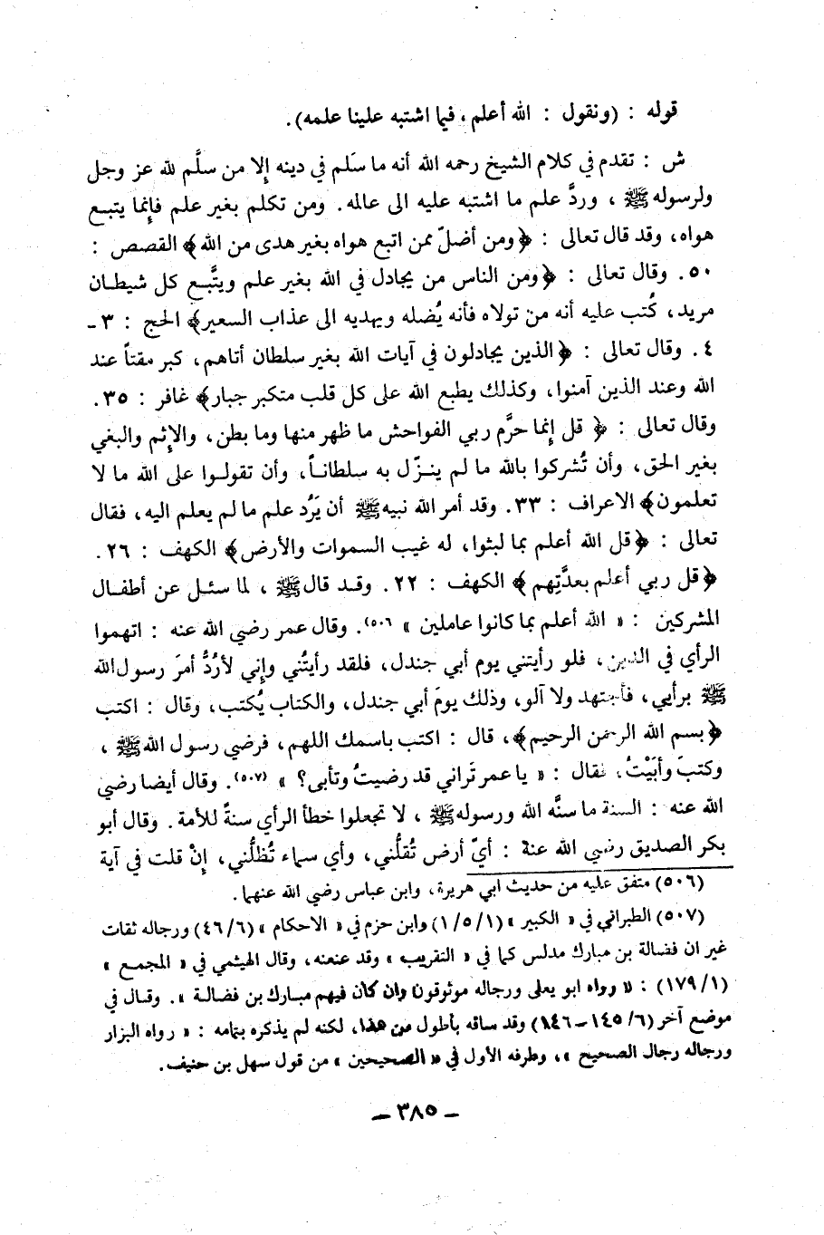ش: تَقَدَّمَ فِي كَلَامِ الشَّيْخِ رَحِمَهُ اللَّهُ أَنَّهُ مَا سَلِمَ فِي دِينِهِ إِلَّا مَنْ سَلَّمَ لِلَّهِ عَزَّ وَجَلَّ وَلِرَسُولِهِ صَلَّى اللَّهُ عَلَيْهِ وَسَلَّمَ، وَرَدَّ عِلْمَ مَا اشْتَبَهَ عَلَيْهِ إِلَى عَالِمِهِ, وَمَنْ تَكَلَّمَ بِغَيْرِ عِلْمٍ فَإِنَّمَا يَتَّبِعُ هَوَاهُ، وَقَدْ قَالَ تَعَالَى: {وَمَنْ أَضَلُّ مِمَّنَ اتَّبَعَ هَوَاهُ بِغَيْرِ هُدًى مِنَ اللَّهِ} [الْقَصَصِ: 50] , وَقَالَ تَعَالَى: {وَمِنَ النَّاسِ مَنْ يُجَادِلُ فِي اللَّهِ بِغَيْرِ عِلْمٍ وَيَتَّبِعُ كُلَّ شَيْطَانٍ مَرِيدٍ، كُتِبَ عَلَيْهِ أَنَّهُ مَنْ تَوَلَّاهُ فَأَنَّهُ يُضِلُّهُ وَيَهْدِيهِ إِلَى عَذَابِ السَّعِيرِ} [الْحَجِّ: 3, 4]. وَقَالَ تَعَالَى: {الَّذِينَ يُجَادِلُونَ فِي آيَاتِ اللَّهِ بِغَيْرِ سُلْطَانٍ أَتَاهُمْ كَبُرَ مَقْتًا عِنْدَ اللَّهِ وَعِنْدَ الَّذِينَ آمَنُوا كَذَلِكَ يَطْبَعُ اللَّهُ عَلَى كُلِّ قَلْبِ مُتَكَبِّرٍ جَبَّارٍ} [غَافِرٍ: 35]. وَقَالَ تَعَالَى: {قُلْ إِنَّمَا حَرَّمَ رَبِّيَ الْفَوَاحِشَ مَا ظَهَرَ مِنْهَا وَمَا بَطَنَ وَالإِثْمَ وَالْبَغْيَ بِغَيْرِ الْحَقِّ وَأَنْ تُشْرِكُوا بِاللَّهِ مَا لَمْ يُنَزِّلْ بِهِ سُلْطَانًا وَأَنْ تَقُولُوا عَلَى اللَّهِ مَا لَا تَعْلَمُونَ} [الْأَعْرَافِ: 33]. وَقَدْ أَمَرَ اللَّهُ نَبِيَّهُ صَلَّى اللَّهُ عَلَيْهِ وَسَلَّمَ أَنْ يَرُدَّ عِلْمَ مَا لَمْ يَعْلَمْ إِلَيْهِ، فَقَالَ تَعَالَى: {قُلِ اللَّهُ أَعْلَمُ بِمَا لَبِثُوا لَهُ غَيْبُ السَّمَاوَاتِ وَالْأَرْضِ} [الكهف: 26] {أَبْصِرْ بِهِ وَأَسْمِعْ لَهُمْ}. {قُلْ رَبِّي أَعْلَمُ بِعِدَّتِهِمْ} [الْكَهْفِ: 22]. وَقَدْ قَالَ صَلَّى اللَّهُ عَلَيْهِ وَسَلَّمَ، لَمَّا سُئِلَ عَنْ أَطْفَالِ الْمُشْرِكِينَ: "اللَّهُ أَعْلَمُ بِمَا كَانُوا عَامِلِينَ" 1. وَقَالَ عُمَرُ رَضِيَ اللَّهُ عَنْهُ: اتَّهِمُوا الرَّأْيَ فِي الدِّينِ، فَلَوْ رَأَيْتَنِي يَوْمَ أَبِي جَنْدَلٍ، فَلَقَدْ رَأَيْتُنِي وَإِنِّي لَأَرُدُّ أَمْرَ رَسُولِ اللَّهِ صَلَّى اللَّهُ عَلَيْهِ وَسَلَّمَ بِرَأْيٍ، فَأَجْتَهِدُ وَلَا آلُو، وَذَلِكَ يَوْمُ أَبِي جَنْدَلٍ، وَالْكِتَابُ يَكْتُبُ، وَقَالَ: اكْتُبْ {بِسْمِ اللَّهِ الرَّحْمَنِ الرَّحِيمِ}، قَالَ: اكْتُبْ بِاسْمِكَ اللَّهُمَّ، فَرَضِيَ رَسُولُ اللَّهِ صَلَّى اللَّهُ عَلَيْهِ وَسَلَّمَ، وَكَتَبَ وَأَبَيْتُ، فَقَالَ: "يَا عُمَرُ تَرَانِي قَدْ رَضِيتُ وَتَأْبَى؟ " 2. وَقَالَ أَيْضًا رَضِيَ اللَّهُ عَنْهُ: السُّنَّةُ مَا سَنَّهُ اللَّهُ وَرَسُولُهُ صَلَّى اللَّهُ عَلَيْهِ وَسَلَّمَ، لَا تَجْعَلُوا خَطَأَ الرَّأْيِ سُنَّةً لِلْأُمَّةِ, وَقَالَ أَبُو بَكْرٍ الصِّدِّيقُ رَضِيَ اللَّهُ عَنْهُ: أَيُّ أَرْضٍ تُقِلُّنِي، وَأَيُّ سَمَاءٍ تُظِلُّنِي، إِنْ قُلْتُ فِي آيَةٍ