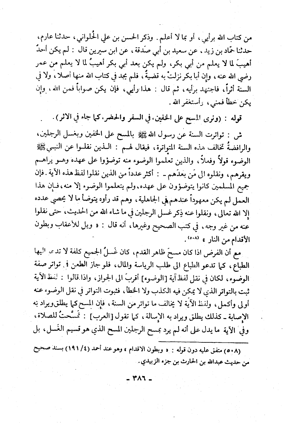 ش: تَوَاتَرَتِ السُّنَّةُ عَنْ رَسُولِ اللَّهِ صَلَّى اللَّهُ عَلَيْهِ وَسَلَّمَ بِالْمَسْحِ عَلَى الْخُفَّيْنِ وَبِغَسْلِ الرِّجْلَيْنِ، وَالرَّافِضَةُ تُخَالِفُ هَذِهِ السُّنَّةَ الْمُتَوَاتِرَةَ، فَيُقَالُ لَهُمُ: الَّذِينَ نَقَلُوا عَنِ النَّبِيِّ صَلَّى اللَّهُ عَلَيْهِ وَسَلَّمَ الْوُضُوءَ قَوْلًا وَفِعْلًا، وَالَّذِينَ تَعَلَّمُوا الوضوء منه توضئوا عَلَى عَهْدِهِ وَهُوَ يَرَاهُمْ وَيُقِرُّهُمْ، وَنَقَلُوهُ إِلَى مَنْ بَعْدَهُمْ, أَكْثَرُ عَدَدًا مِنَ الَّذِينَ نَقَلُوا لَفْظَ هَذِهِ الْآيَةِ. فَإِنَّ جَمِيعَ الْمُسْلِمِينَ كَانُوا يَتَوَضَّئُونَ عَلَى عَهْدِهِ، وَلَمْ يَتَعَلَّمُوا الْوُضُوءَ إِلَّا مِنْهُ، فَإِنَّ هَذَا الْعَمَلَ لَمْ يَكُنْ مَعْهُودًا عِنْدَهُمْ فِي الْجَاهِلِيَّةِ، وَهُمْ قَدْ رَأَوْهُ يَتَوَضَّأُ مَا لَا يُحْصِي عَدَدَهُ إِلَّا اللَّهُ تَعَالَى، وَنَقَلُوا عَنْهُ ذِكْرَ غَسْلِ الرِّجْلَيْنِ فِي مَا شَاءَ اللَّهُ مِنَ الْحَدِيثِ، حَتَّى نَقَلُوا عَنْهُ مِنْ غَيْرِ وَجْهٍ، فِي كُتُبِ الصَّحِيحِ وَغَيْرِهَا، أَنَّهُ قَالَ: "وَيْلٌ لِلْأَعْقَابِ وَبُطُونِ الْأَقْدَامِ مِنَ النَّارِ" 1.