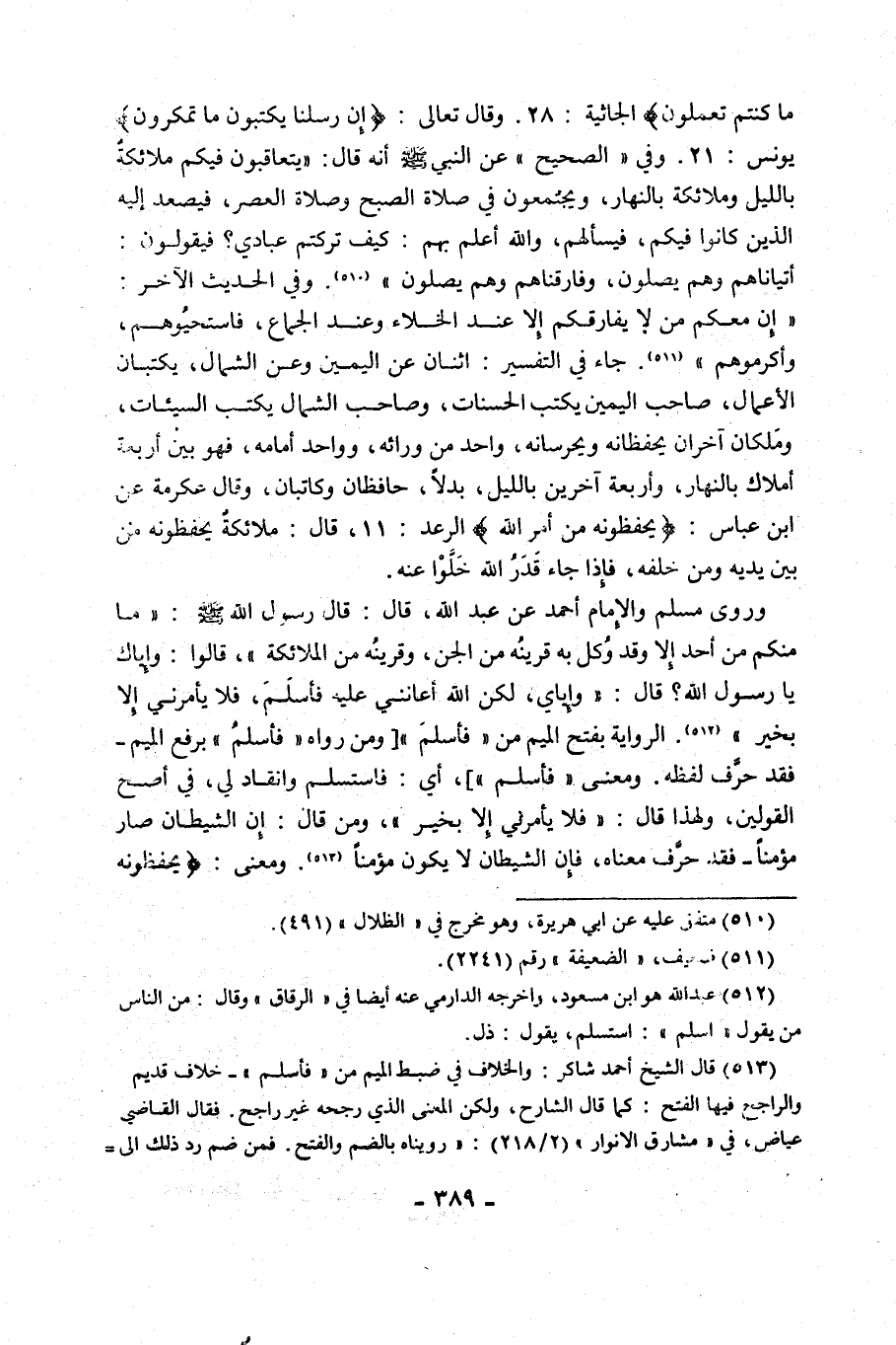 وَرَوَى مُسْلِمٌ وَالْإِمَامُ أَحْمَدُ عَنْ عَبْدِ اللَّهِ، قَالَ: قَالَ رَسُولُ اللَّهِ صَلَّى اللَّهُ عَلَيْهِ وَسَلَّمَ: "مَا مِنْكُمْ مِنْ أَحَدٍ إِلَّا وَقَدْ وُكِّلَ بِهِ قَرِينُهُ مِنَ الْجِنِّ، وَقَرِينُهُ مِنَ الْمَلَائِكَةِ"، قَالُوا: وَإِيَّاكَ يَا رَسُولَ اللَّهِ؟ قَالَ: "وَإِيَّايَ، لَكِنَّ اللَّهَ أَعَانَنِي عَلَيْهِ فَأَسْلَمَ، فَلَا يَأْمُرُنِي إِلَّا بِخَيْرٍ" 3. الرِّوَايَةُ بِفَتْحِ الْمِيمِ مِنْ "فَأَسْلَمَ" [وَمَنْ رَوَاهُ فَأَسْلَمُ بِرَفْعِ الْمِيمِ, فَقَدْ حَرَّفَ لَفْظَهُ. وَمَعْنَى "فَأَسْلَمَ"]، أَيْ: فَاسْتَسْلَمَ وَانْقَادَ لِي، فِي أَصَحِّ الْقَوْلَيْنِ، وَلِهَذَا قَالَ: "فَلَا يَأْمُرُنِي إِلَّا بِخَيْرٍ"، وَمَنْ قَالَ: إِنَّ الشَّيْطَانَ صَارَ مُؤْمِنًا, فَقَدْ حَرَّفَ مَعْنَاهُ، فَإِنَّ الشَّيْطَانَ لا يكون مؤمناً4. ومعنى: {يَحْفَظُونَهُ