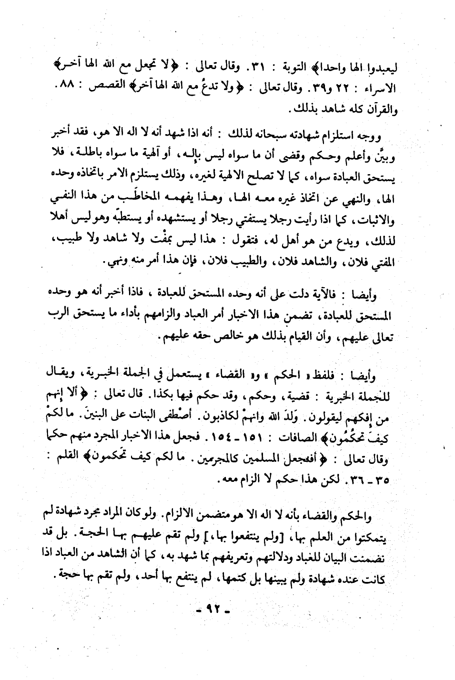 لِيَعْبُدُوا إِلَهًا وَاحِدًا} [سورة التَّوْبَةِ: 31] , وَقَالَ تَعَالَى: {لَا تَجْعَلْ مَعَ اللَّهِ إِلَهًا آَخَرَ} [سورة الإسراء: 22 و39]. وَقَالَ تَعَالَى: {وَلَا تَدْعُ مَعَ اللَّهِ إِلَهًا آَخَرَ} [سورة الْقَصَصِ: 88] , وَالْقُرْآنُ كُلُّهُ شَاهِدٌ بِذَلِكَ.