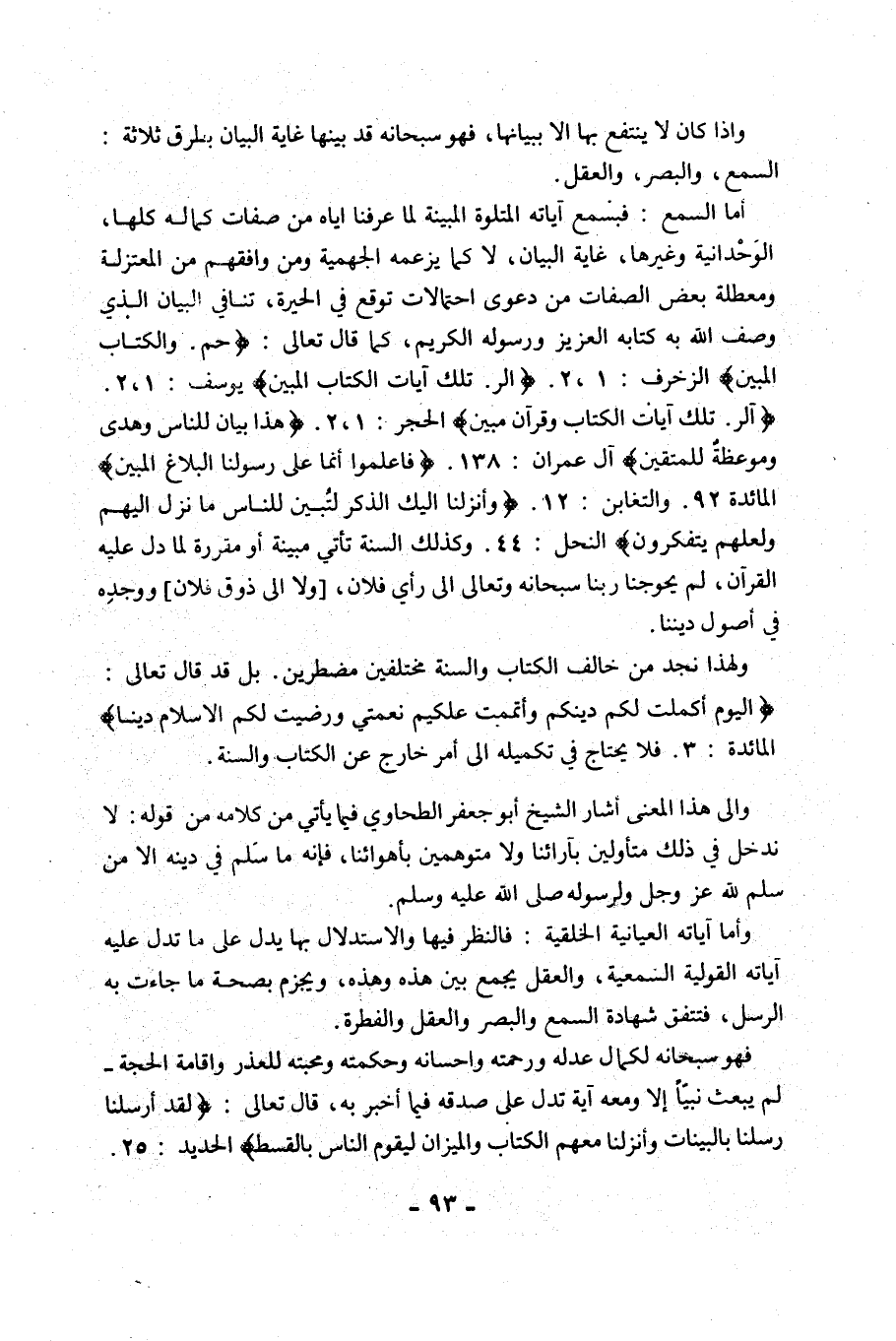 وَإِذَا كَانَ لَا يُنْتَفَعُ بِهَا إِلَّا بِبَيَانِهَا، فَهُوَ سُبْحَانَهُ قَدْ بَيَّنَهَا غَايَةَ الْبَيَانِ بِطُرُقٍ ثَلَاثَةٍ: السَّمْعِ، وَالْبَصَرِ، وَالْعَقْلِ؛ أَمَّا السَّمْعُ: فَبِسَمْعِ آيَاتِهِ الْمَتْلُوَّةِ الْمُبَيِّنَةِ لِمَا عَرَّفَنَا إِيَّاهُ مِنْ صِفَاتِ كَمَالِهِ كُلِّهَا، الْوَحْدَانِيَّةِ وَغَيْرِهَا، غَايَةَ الْبَيَانِ، لَا كَمَا يَزْعُمُهُ الْجَهْمِيَّةُ وَمَنْ وَافَقَهُمْ مِنَ الْمُعْتَزِلَةِ وَمُعَطِّلَةِ بَعْضِ الصِّفَاتِ مِنْ دَعْوَى احْتِمَالَاتٍ توقع الْحَيْرَةِ، تُنَافِي الْبَيَانَ الَّذِي وَصَفَ اللَّهُ بِهِ كِتَابَهُ الْعَزِيزَ وَرَسُولَهُ الْكَرِيمَ، كَمَا قَالَ تَعَالَى: {حم، وَالْكِتَابِ الْمُبِينِ} , {الر, تِلْكَ آَيَاتُ الْكِتَابِ الْمُبِينِ} [سورة يُوسُفَ: 1، 2] , {الر, تِلْكَ آَيَاتُ الْكِتَابِ وَقُرْآَنٍ مُبِينٍ} [سورة الْحِجْرِ: 1، 2] , {هَذَا بَيَانٌ لِلنَّاسِ وَهُدًى وَمَوْعِظَةٌ لِلْمُتَّقِينَ} [سورة آلِ عِمْرَانَ: 138] , {فَاعْلَمُوا أَنَّمَا عَلَى رَسُولِنَا الْبَلَاغُ الْمُبِينُ} [المائدة: 92، والتغابن: 12] , {وَأَنْزَلْنَا إِلَيْكَ الذِّكْرَ لِتُبَيِّنَ لِلنَّاسِ مَا نُزِّلَ إِلَيْهِمْ وَلَعَلَّهُمْ يَتَفَكَّرُونَ} [النَّحْلِ: 44] , وَكَذَلِكَ السُّنَّةُ تَأْتِي مُبَيِّنَةً أَوْ مُقَرِّرَةً لِمَا دَلَّ عَلَيْهِ الْقُرْآنُ، لَمْ يُحْوِجْنَا رَبُّنَا سُبْحَانَهُ وَتَعَالَى إِلَى رَأْيِ فُلَانٍ، [وَلَا إِلَى ذَوْقِ فُلَانٍ] ووجدِه فِي أُصُولِ دِينِنَا.