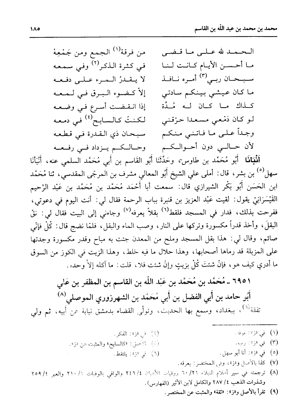 الحمد لله على ما قضى * من فرقة (1) الجمع ومن جمعه ما احسن الأيام كانت لنا * في كثرة الذكر (2) وفي سمعه سبحان ربي (3) أمره نافذ * لا يقدر المرء على دفعه ما كان عيشي بينكم سادتي * إلا كضوء البرق في لمعه كذاك ما كان له مدة * إذا انقضت أسرع في وضعه لو كان دمعي مسعدا حرقني * لكنت كالسابح (4) في دمعه وجدا على ما فاتني منكم * سبحان ذي القدرة في قطعه لأن حالي دون أحوالكم * وحالكم يزداد في رفعه أنبأنا أبو محمد بن طاووس وحدثنا أبو القاسم بن أبي محمد السلمي عنه أنبأنا سهل (5) بن بشر قال أملى علي الشيخ أبو المعالي مشرف بن المرجي المقدسي ثنا محمد ابن الحسن أبو بكر الشيرازي قال سمعت أبا أحمد محمد بن محمد بن عبد الرحيم القيسراني يقول لقيت عبد العزيز بن قنبرة بباب الرحمة فقال لي أنت اليوم في دعوتي ففرحت بذلك فدار في المسجد فلقط (6) بقلا يعرفه (7) وجاءني إلى البيت فقال لي نق البقل وأخذ قدرا مكسورة وتركها على النار وصب الماء والبقل فلما نضج قال كل فإني صائم وقال لي هذا بقل المسجد وملح من المعدن جئت به مباح وقد مكسورة وجدتها على المزبلة قد رماها أصحابها وهذا حلال ما فيه خلط وهذا الزيت في الكوز من السوق ما أدري كيف هو فإن شئت كل بزيت وإن شئت فلا قلت ما آكله إلا وحده 6951 - محمد بن محمد بن عبد الله بن القاسم بن المظفر بن علي أبو حامد بن أبي الفضل بن أبي محمد بن الشهرزوري الموصلي (8) تفقه (9) ببغداد وسمع بها الحديث وتولى القضاء بدمشق نيابة عن أبيه ثم ولي