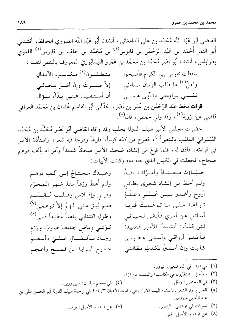 القاضي أبو عبد الله محمد بن علي الدامغاني أنشدنا أبو عبد الله الصوري الحافظ أنشدني أبو النمر أحمد بن عبد الرحمن بن قابوس (1) بن محمد بن خلف بن قابوس (1) اللغوي بطرابلس أنشدنا أبو نصر محمد بن محمد بن عمرو النيسابوري المعروف بالبنص لنفسه: سقطت نفوس بني الكرام فأصبحوا * يتطلبون (2) مكاسب الأنذال ولقل (3) ما طلب الزمان مساءتي * إلا صبرت وإن أضر بحالي نفسي تراودني وتأبى همتي * أن أستفيد غنى بذل سؤال قرأت بخط عبد الرحمن بن عمر بن نصر حدثني أبو القاسم عثمان بن محمد العراقي قاضي عين زربة (4) وقد ولي حمص قال (5) : حضرت مجلس الأمير سيف الدولة بحلب وقد وافاه القاضي أبو نصر محمد بن محمد القيسراني الملقب بالبنص (6) فطرح من كمه كيسا فارغا ودرجا فيه شعر واستأذن الأمير في قراءته فأذن له فلما فرغ من إنشاده ضحك الأمير ضحكا شديدا وأمر له بألف درهم صحاح فجعلت في الكيس الذي جاء معه وكانت الأبيات: حباؤك معتاد وأمرك نافذ * وعبدك محتاج إلى ألف درهم ولم أحظ من إنشاد شعري بطائل * ولم أعط رزقا منذ شهر المحرم أروح وأغدو بين عسر وعلة * ودين وإفلاس وقلب مقسم * * تباعد مني ما توهمت قربه * فلم يبق مني الهم إلا توهمي (7) أسائل عن أمري فأبقى لحيرتي * وطول اكتئابي باهتا مطبقا فمي (8) لئن قلت أنشدت الأمير قصيدة * كوشي رياض جادها صوب مرزم فأطلق أرزاقي وأسنى عطيتي * وجاد بأفضال علي وأنعم كذبت وإن أصدق تكذب مقالتي * جميع البرايا من فصيح وأعجم